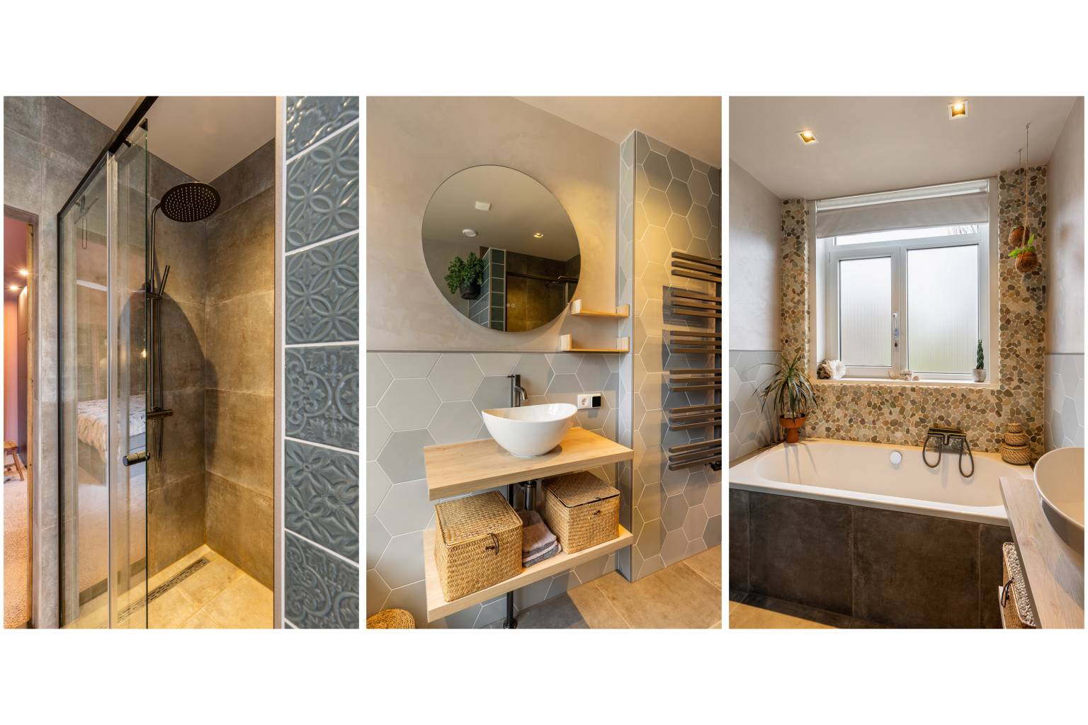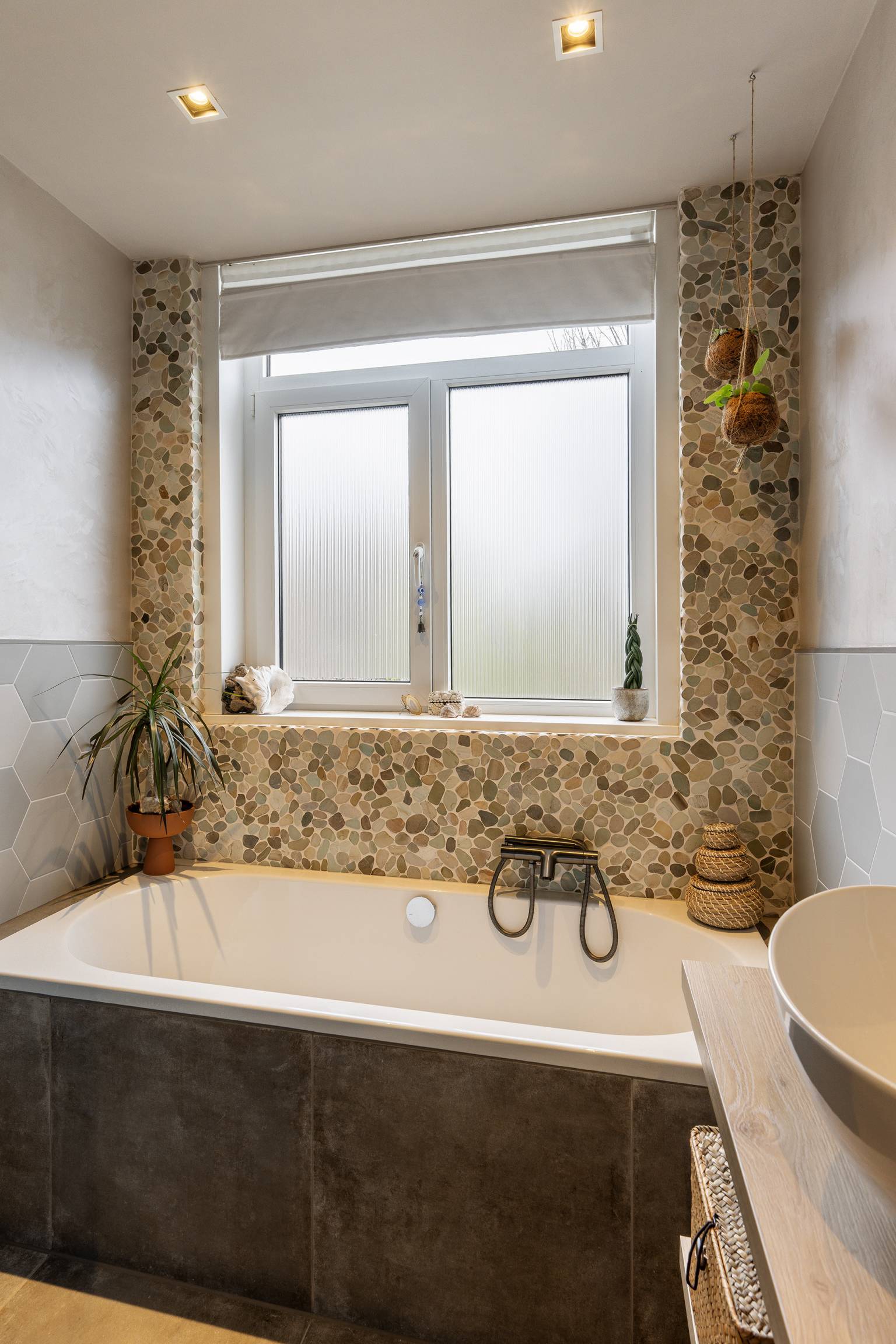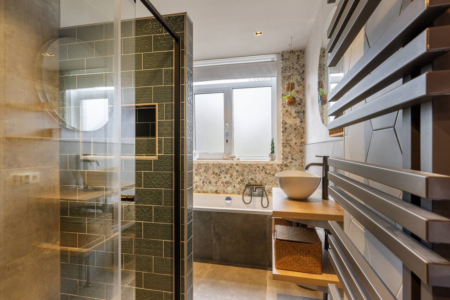 De vernieuwde badkamer, met elektrische vloerverwarming, is grotendeels betegeld en uitgerust met een inloopdouche, een wastafelmeubel met een waskom en een ligbad. Tevens hangt er een handdoeken radiator en is er een te openen raam.