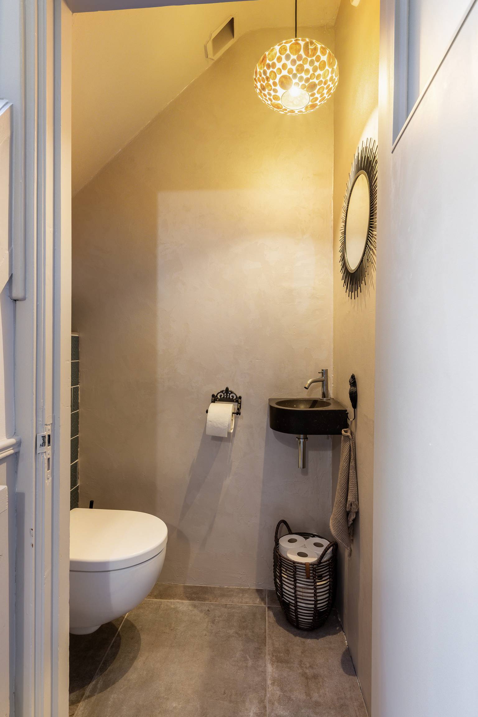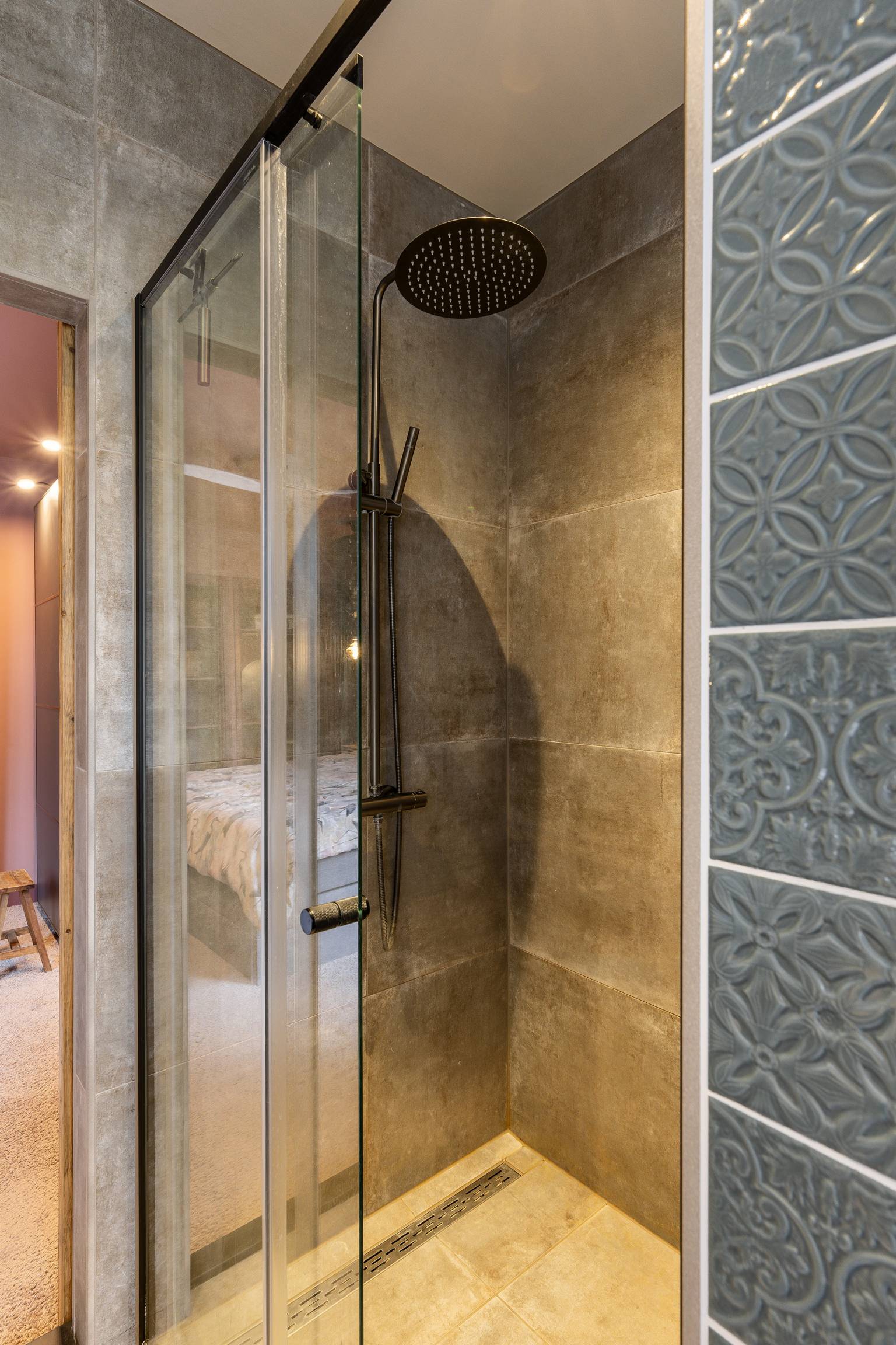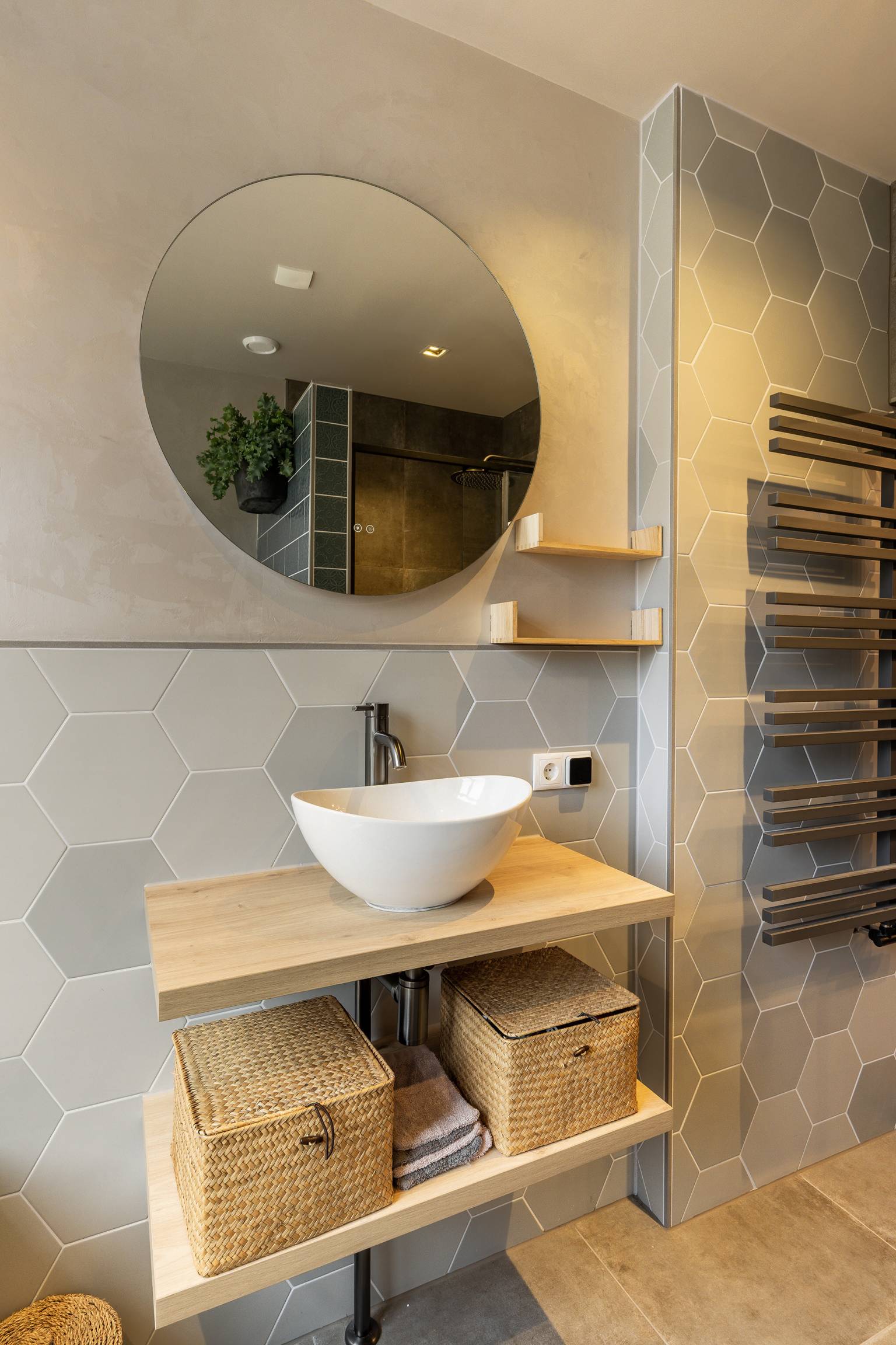 De vernieuwde badkamer, met elektrische vloerverwarming, is grotendeels betegeld en uitgerust met een inloopdouche, een wastafelmeubel met een waskom en een ligbad. Tevens hangt er een handdoeken radiator en is er een te openen raam.