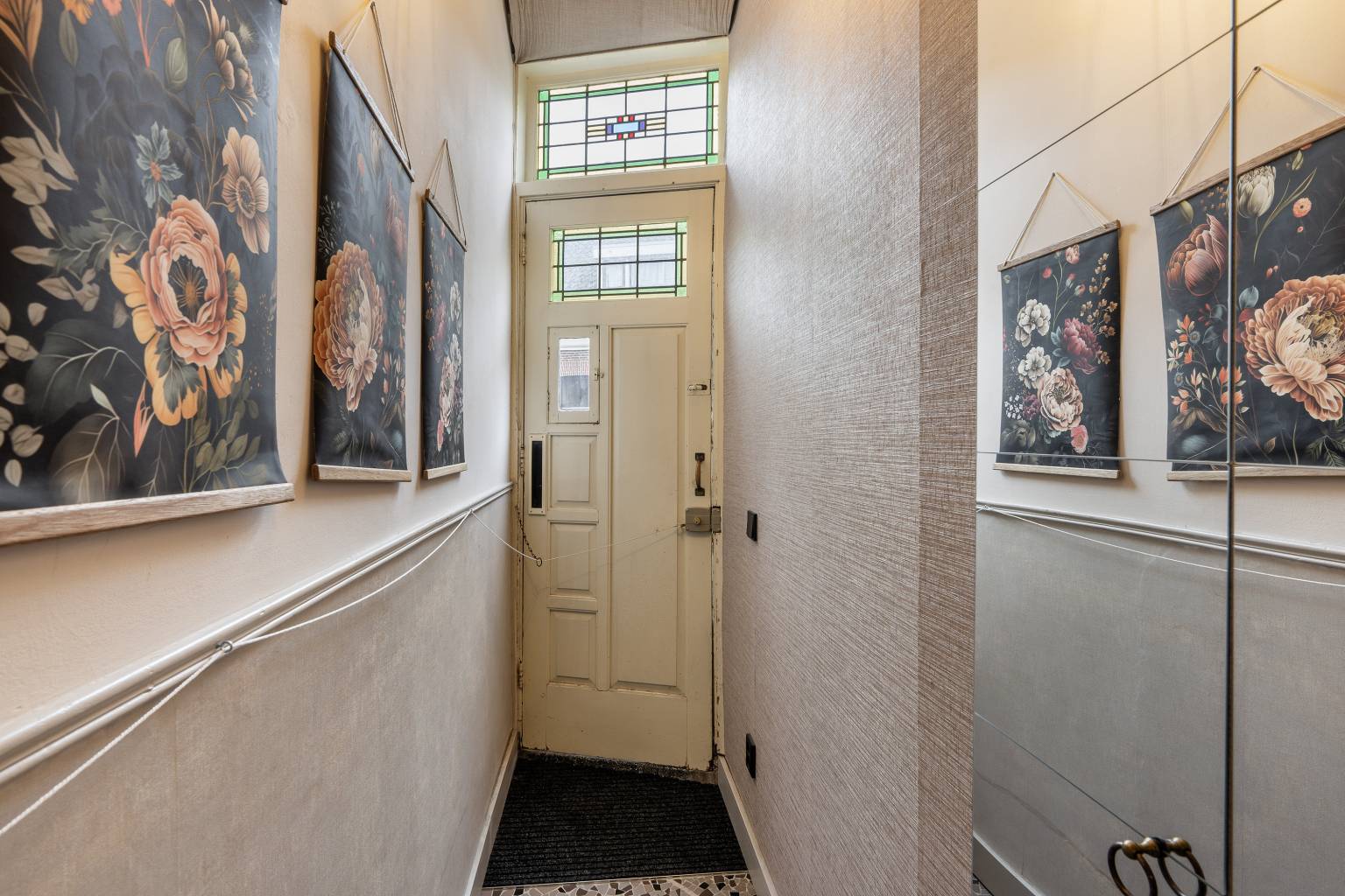 Vanaf de straat is de voordeur bereikbaar, vanwaar er toegang is tot de entreehal. Achter de voordeur ligt een schoonloopmat en de de vloer is voorzien van mozaïek tegeltjes. De wanden zijn deels gestuukt en deels behangen en boven de voordeur is een authentiek glas-in-lood raam aanwezig. In de entreehal bevindt zich de meterkast en er is een trap naar de 1e verdieping.