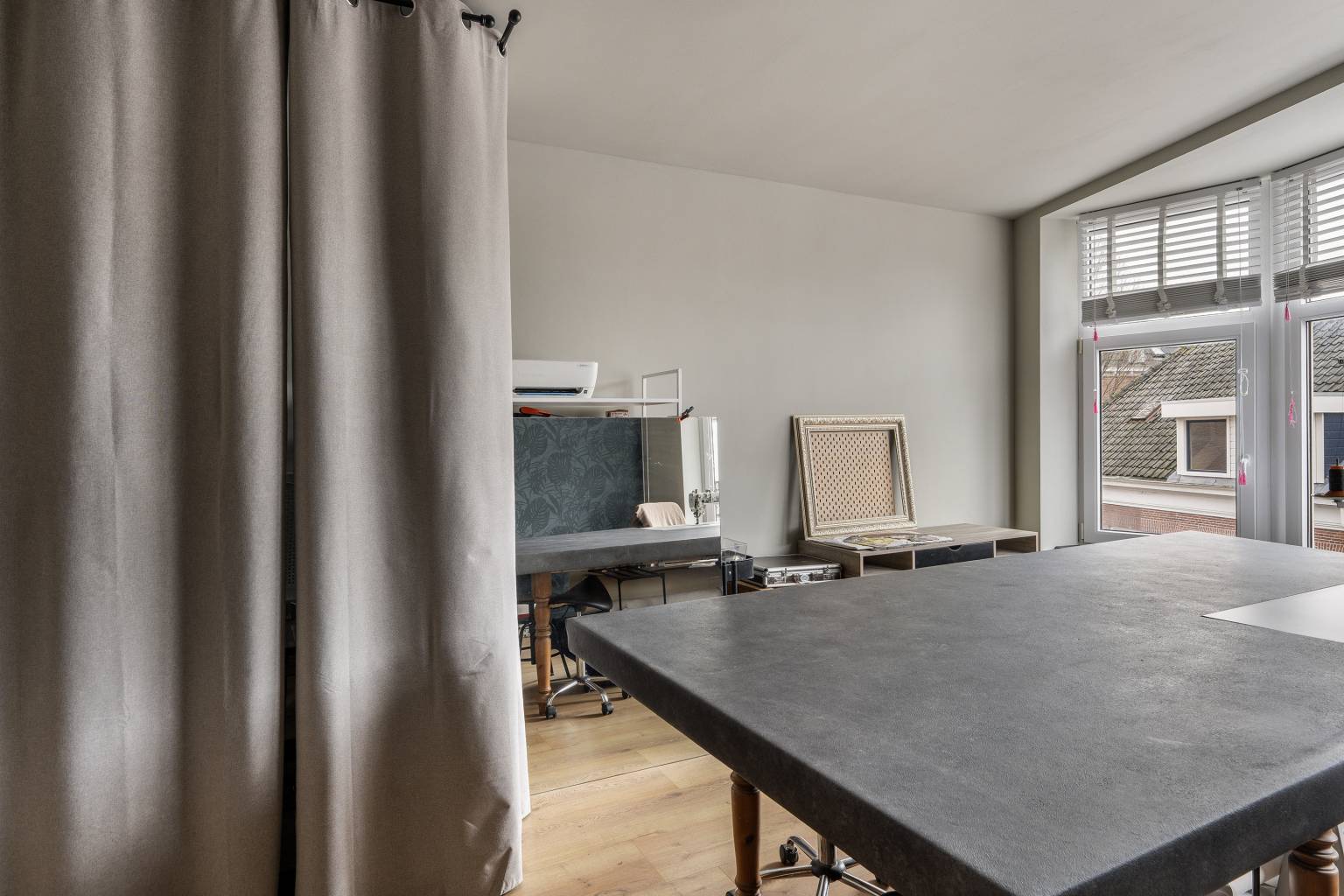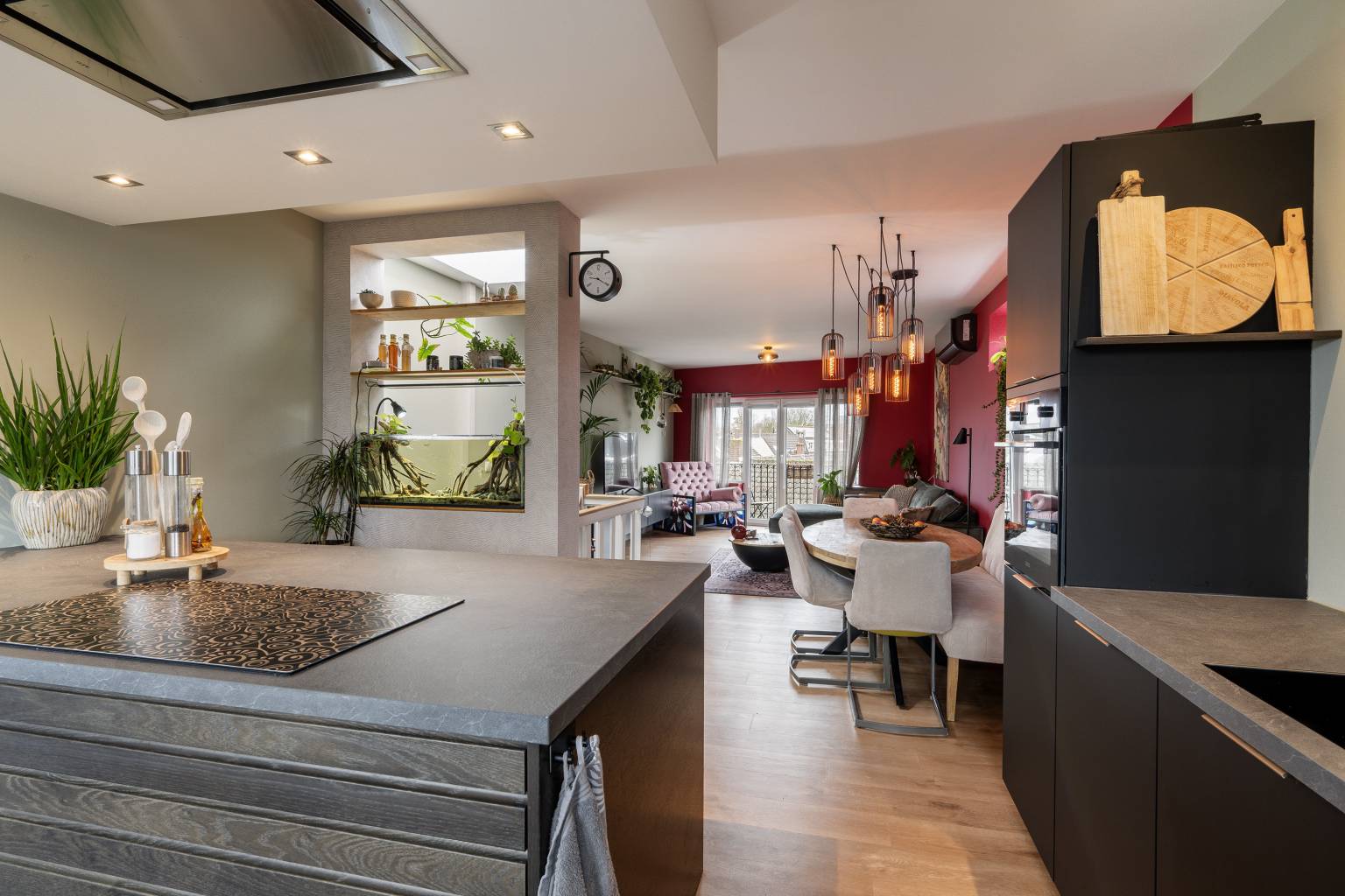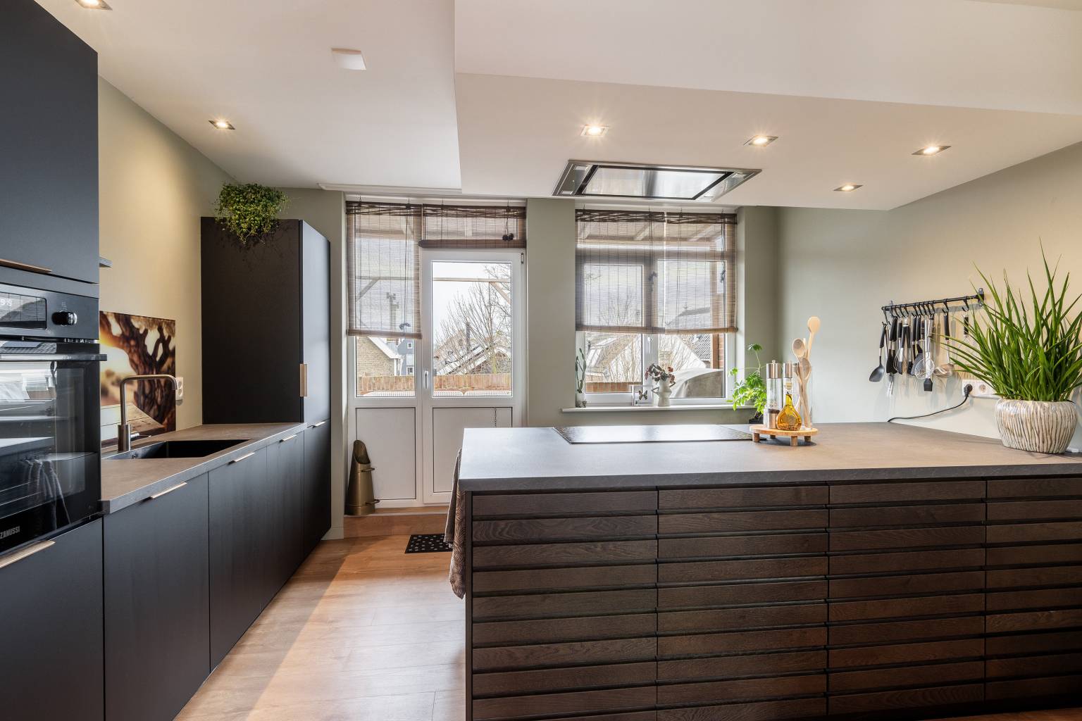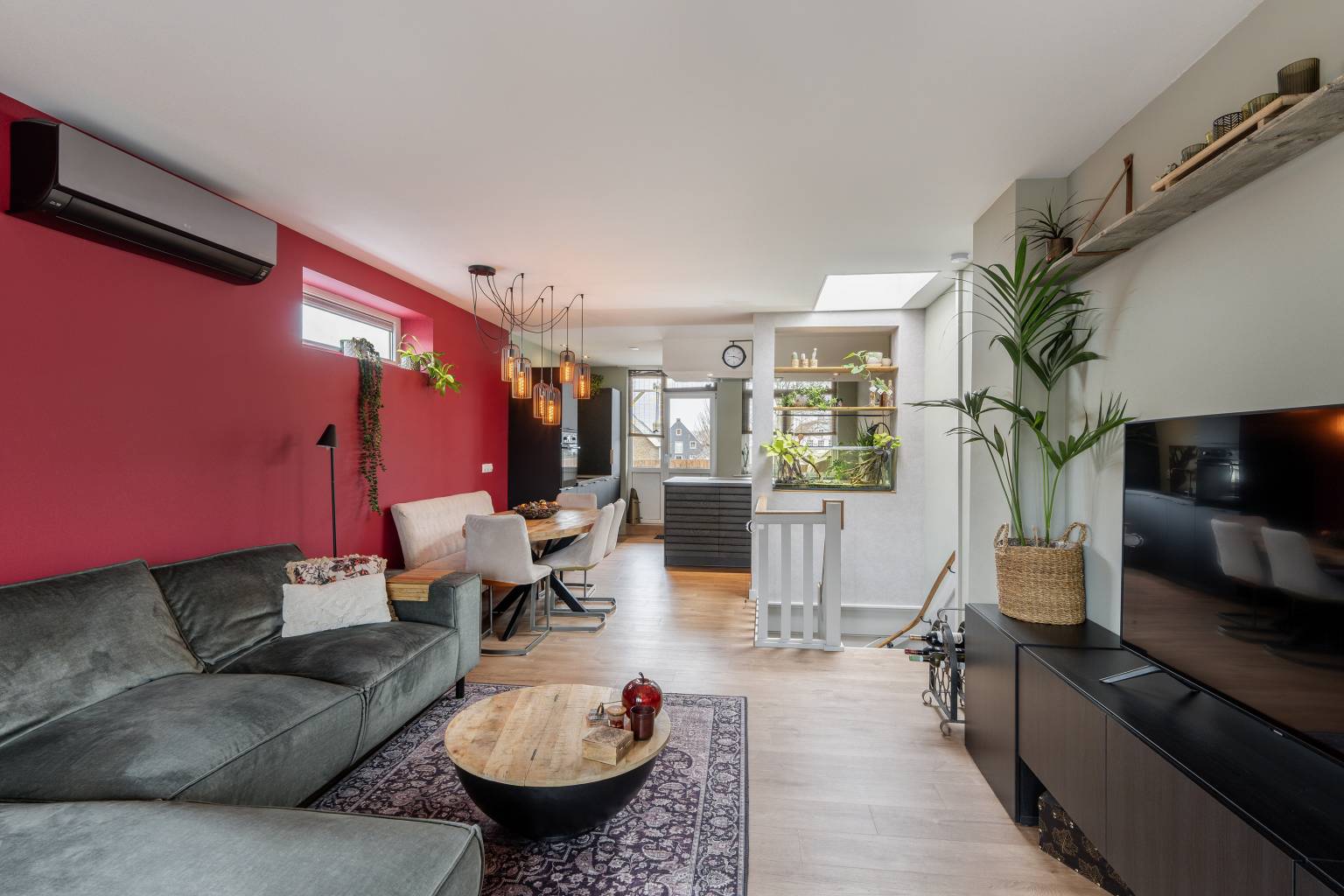 Na de trapopgang, met daklicht, is er een directe bovenkomst in de woonkamer. Hierbij is de zithoek gesitueerd aan de voorzijde, waarbij de openslaande deuren toegang geven tot het gevelbalkon. In het verlengde is er ruimte voor een eethoek, die overloopt in de open keuken. Het aanwezig zijraam zorgt voor extra lichtinval en daarnaast hangt er in deze ruimte een airco, die zowel kan koelen als verwarmen. De nieuw geplaatste keuken beschikt over een recht keukenblok met een apart breed kookeiland. Er is diverse apparatuur aanwezig, zoals een koelkast, een vriezer, een oven, een vaatwasser, een 5-pits inductiekookplaat en een in het plafond geïntegreerde afzuigkap, die automatisch werkt als de kookplaat aan gaat. Daarnaast is er vanuit de keuken een fijne doorkijk, met planken en verlichting, richting de woonkamer en is er een deur naar het ruime terras. Deze gehele verdieping is voorzien van een houten vloer, geschilderde wanden en in de keuken is het plafond voorzien van inbouw spots.
