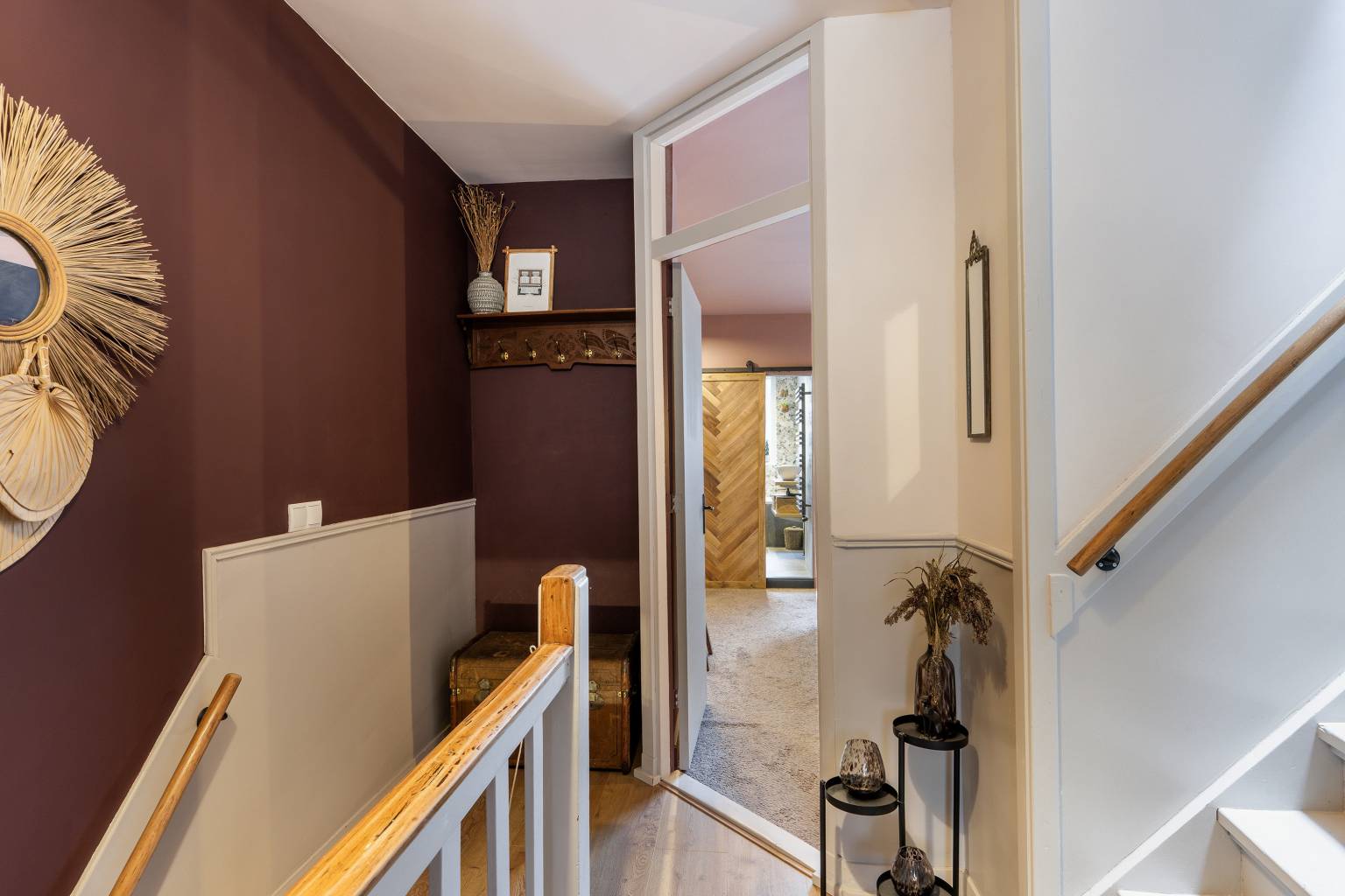 De trapopgang komt uit op de overloop, die toegang geeft tot twee slaapkamers, de trap naar de 2e verdieping en het moderne toilet, dat is extra voorzien van een fonteintje. Alle wanden zijn geschilder en er ligt een houten vloer