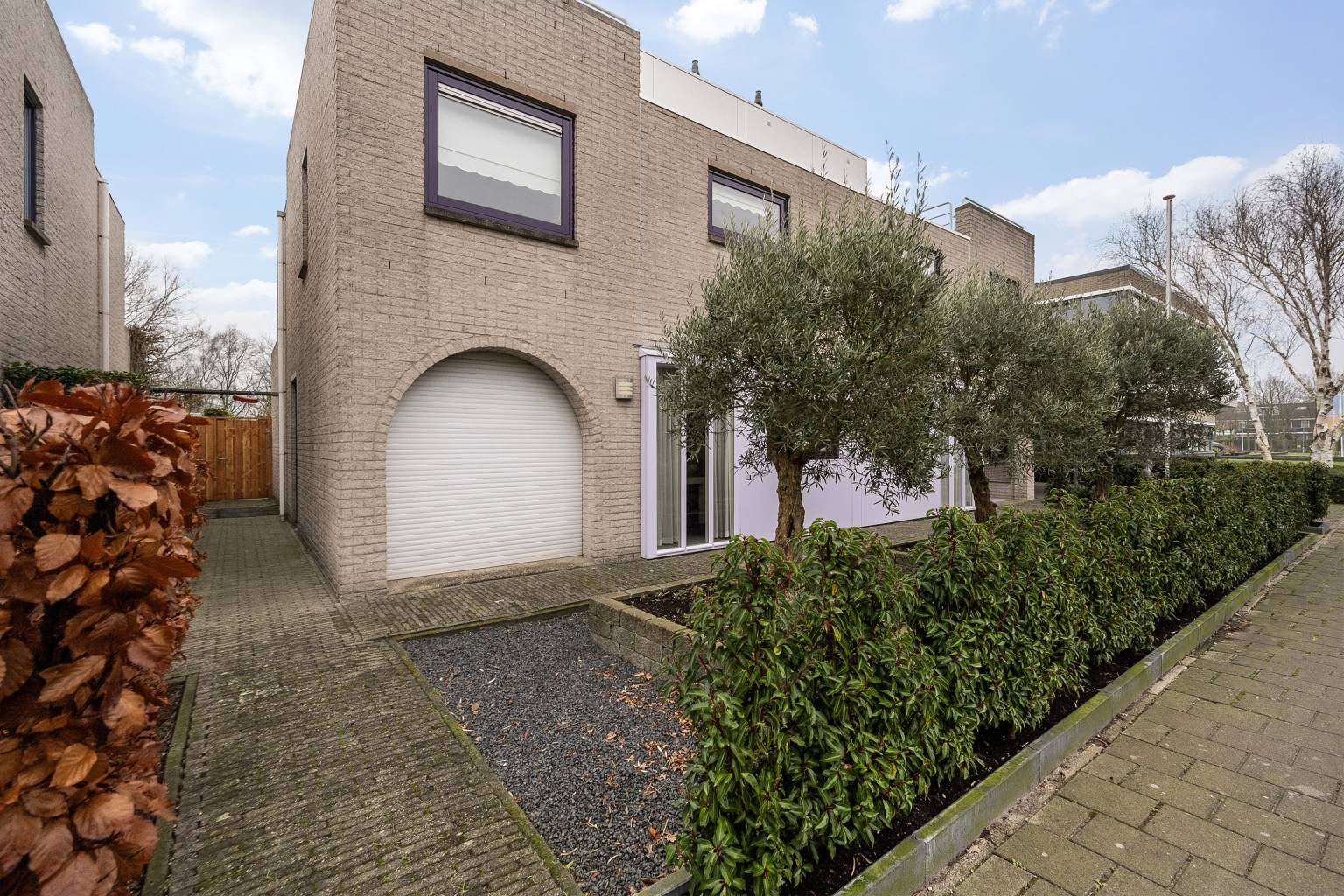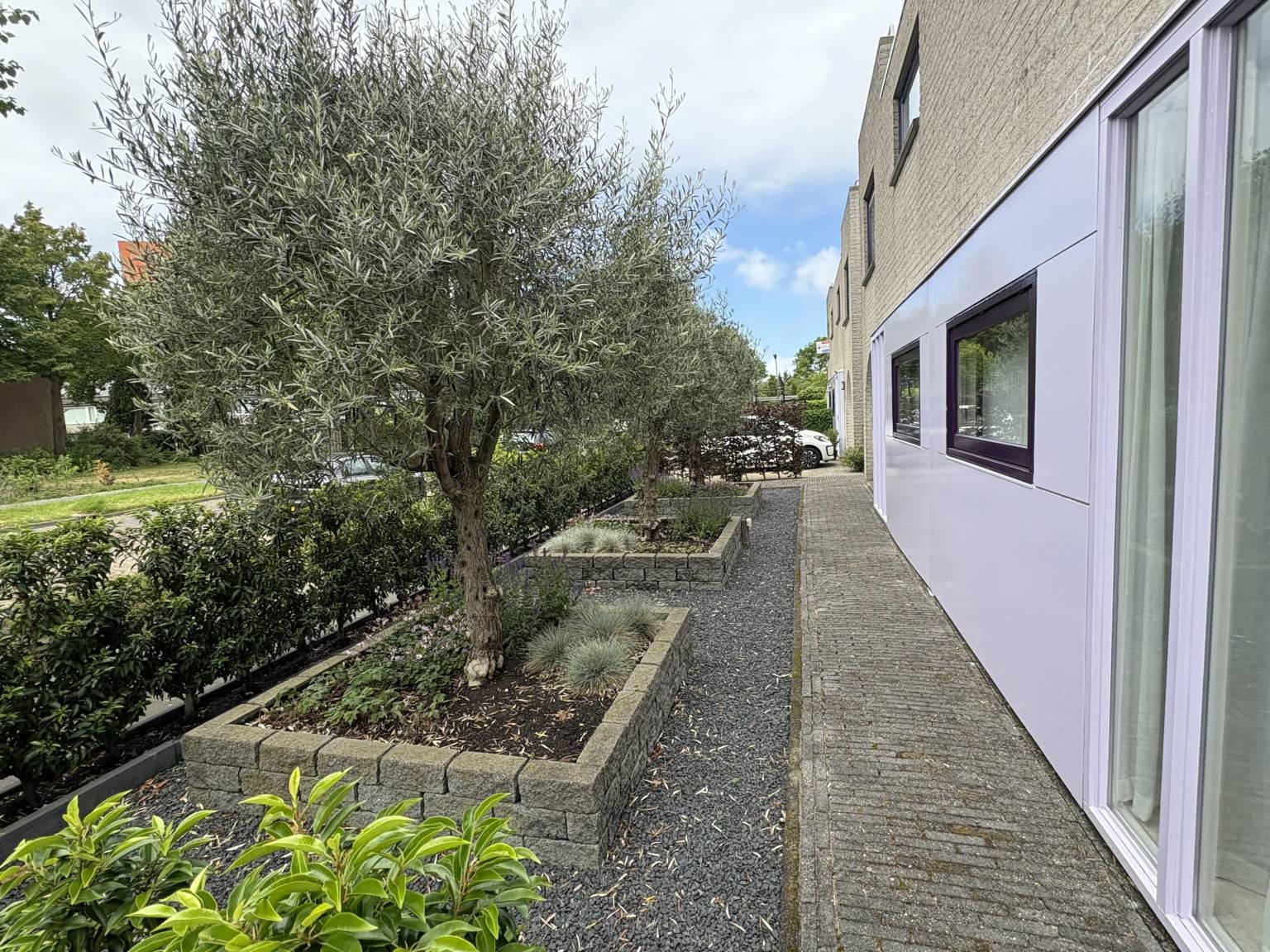 De woning beschikt over een voor- zij- en achtertuin en vanaf de straat is er over het trottoir toegang tot de dubbele carport met eigen laadpaal en verlichting. In de voortuin staan drie grote olijfbomen die mooi worden verlicht en daaromheen zijn de borders opgevuld met beplanting. Er ligt ook een los elektrapunt en via de voortuin zijn de overkapte voordeur en de garage bereikbaar. De garage beschikt niet over een oprit, maar wel over een pad en is ideaal te gebruiken als (fietsen) berging, maar ook zeker geschikt als werkplaats.
