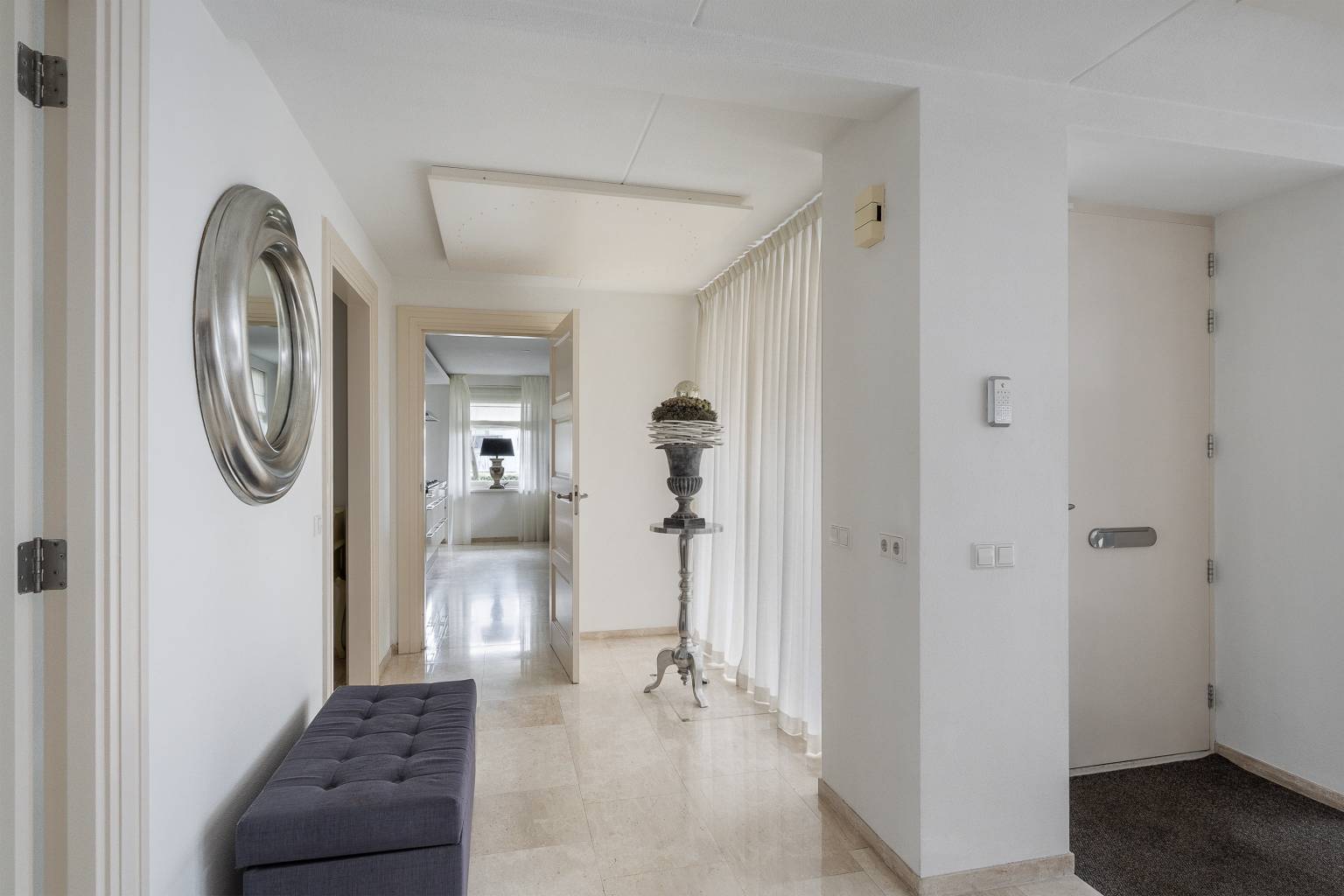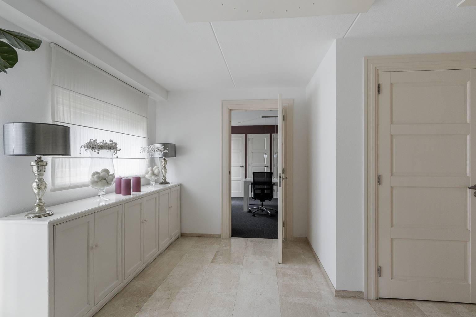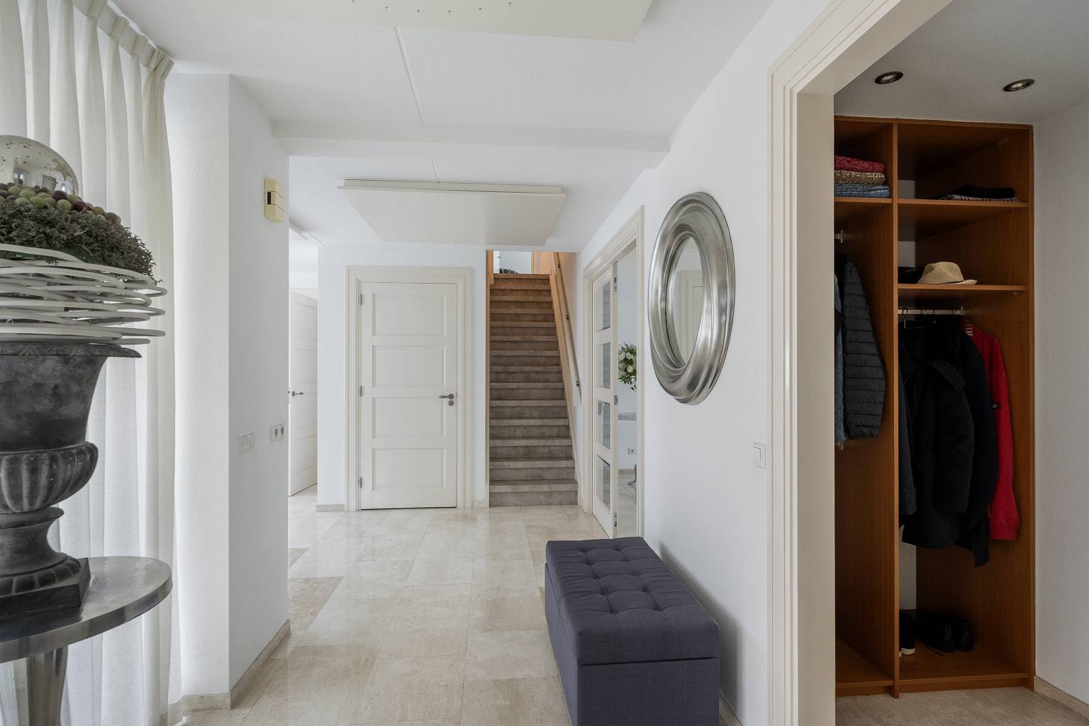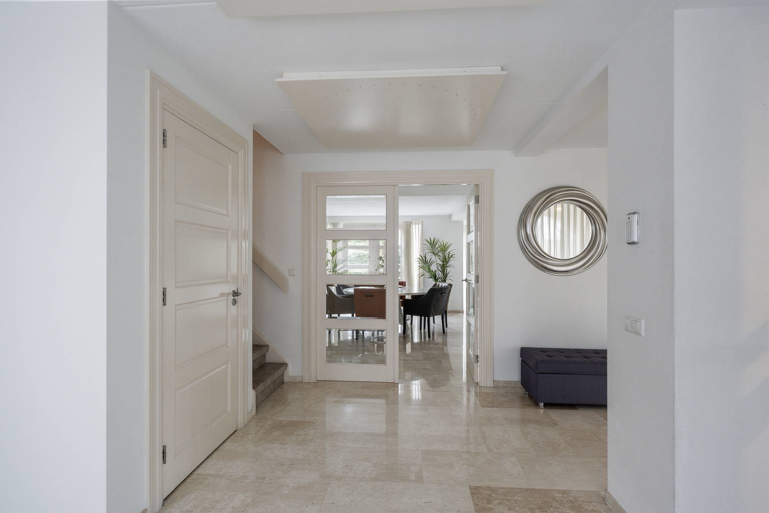 Na de voordeur is er toegang tot de ruime entreehal. De prachtige lichte marmeren vloer is drempelloos doorgetrokken naar de woonkamer, de keuken en het toilet. De houten paneeldeuren zijn mooi verwerkt in een houten kozijn met een brede omlijsting en er is een aparte ruimte voor de garderobe. Vanuit de entreehal is er toegang tot het kantoor, de woonkamer, de keuken, het toilet en de trap naar de eerste verdieping.