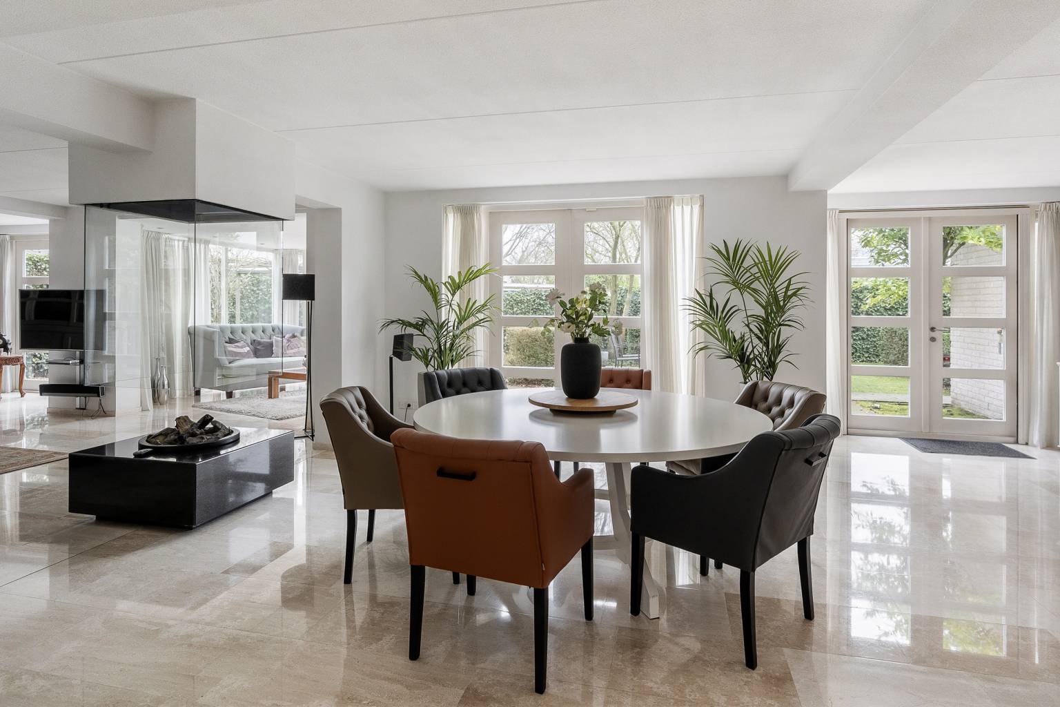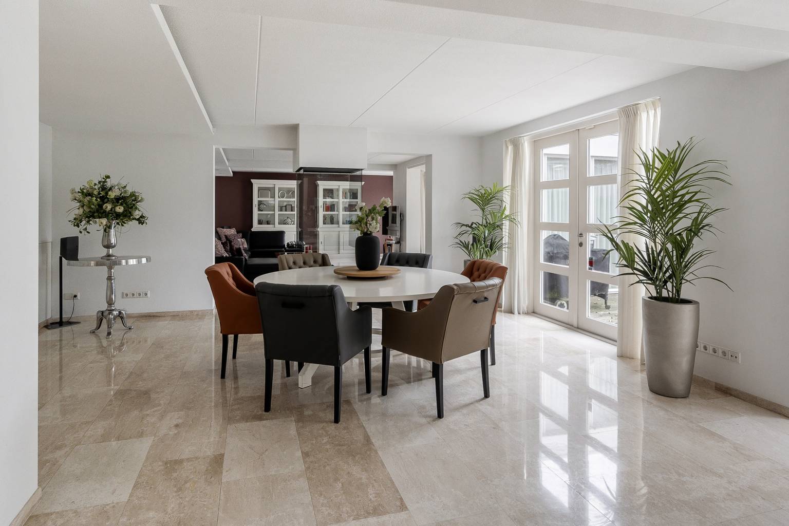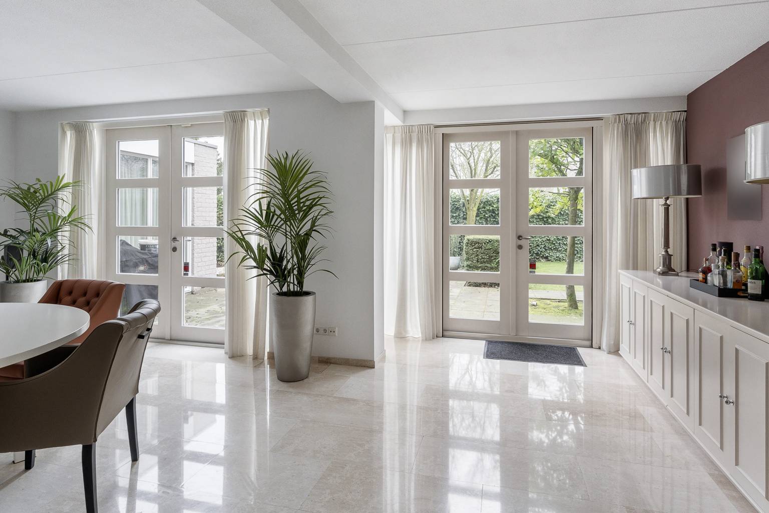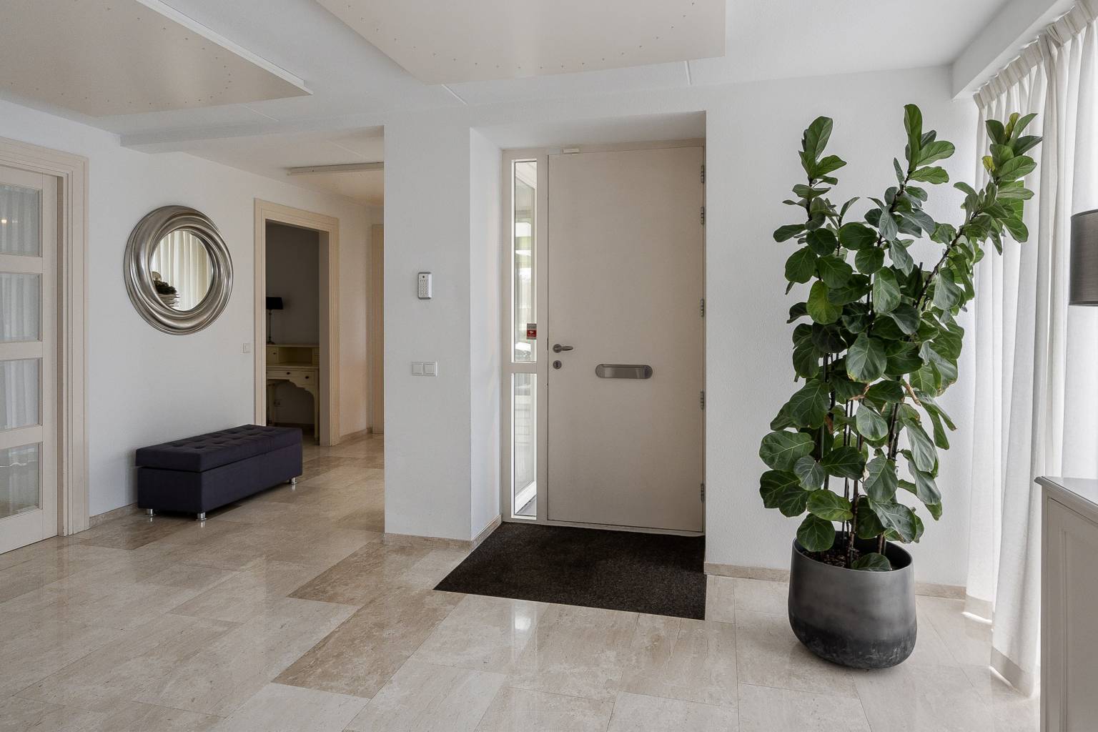 Na de voordeur is er toegang tot de ruime entreehal. De prachtige lichte marmeren vloer is drempelloos doorgetrokken naar de woonkamer, de keuken en het toilet. De houten paneeldeuren zijn mooi verwerkt in een houten kozijn met een brede omlijsting en er is een aparte ruimte voor de garderobe. Vanuit de entreehal is er toegang tot het kantoor, de woonkamer, de keuken, het toilet en de trap naar de eerste verdieping.