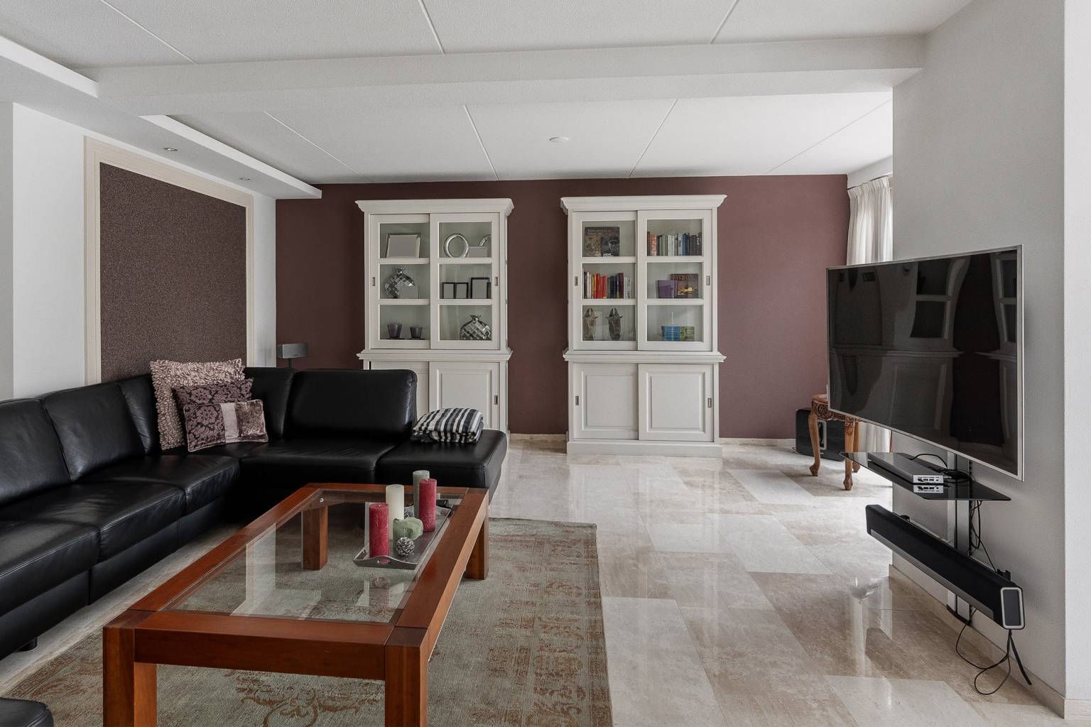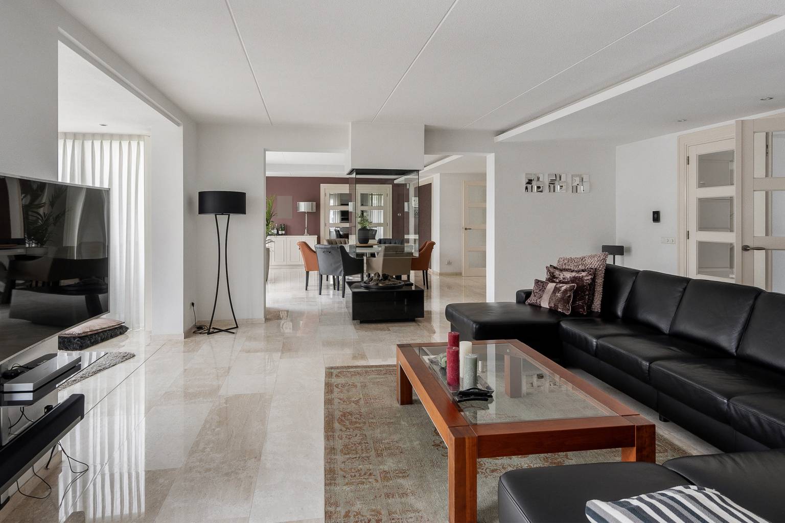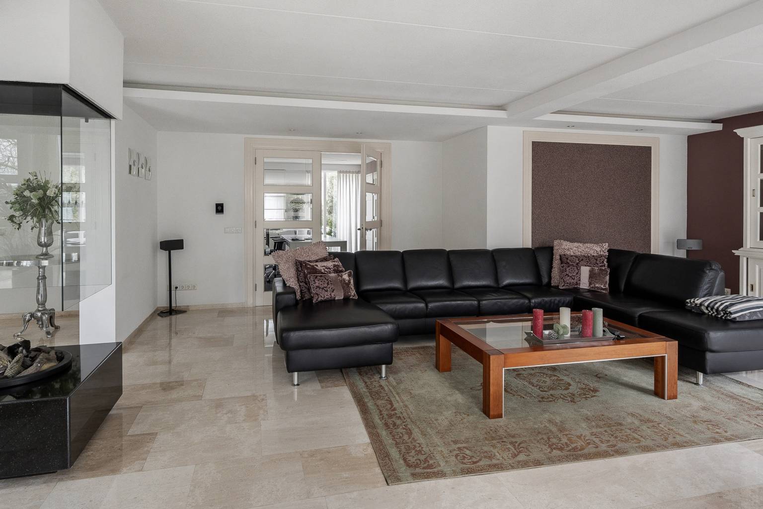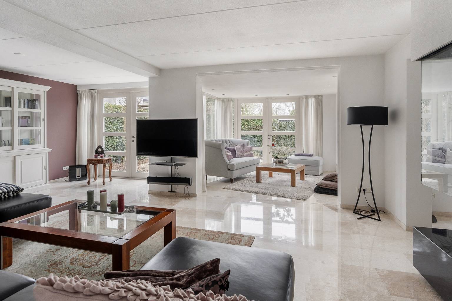 Na de voordeur is er toegang tot de ruime entreehal. De prachtige lichte marmeren vloer is drempelloos doorgetrokken naar de woonkamer, de keuken en het toilet. De houten paneeldeuren zijn mooi verwerkt in een houten kozijn met een brede omlijsting en er is een aparte ruimte voor de garderobe. Vanuit de entreehal is er toegang tot het kantoor, de woonkamer, de keuken, het toilet en de trap naar de eerste verdieping.