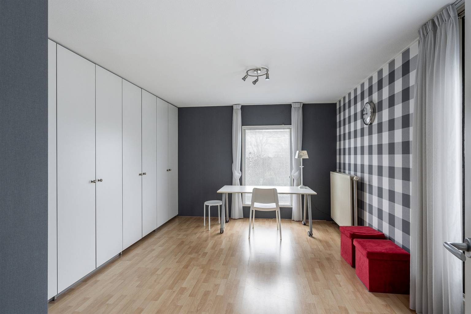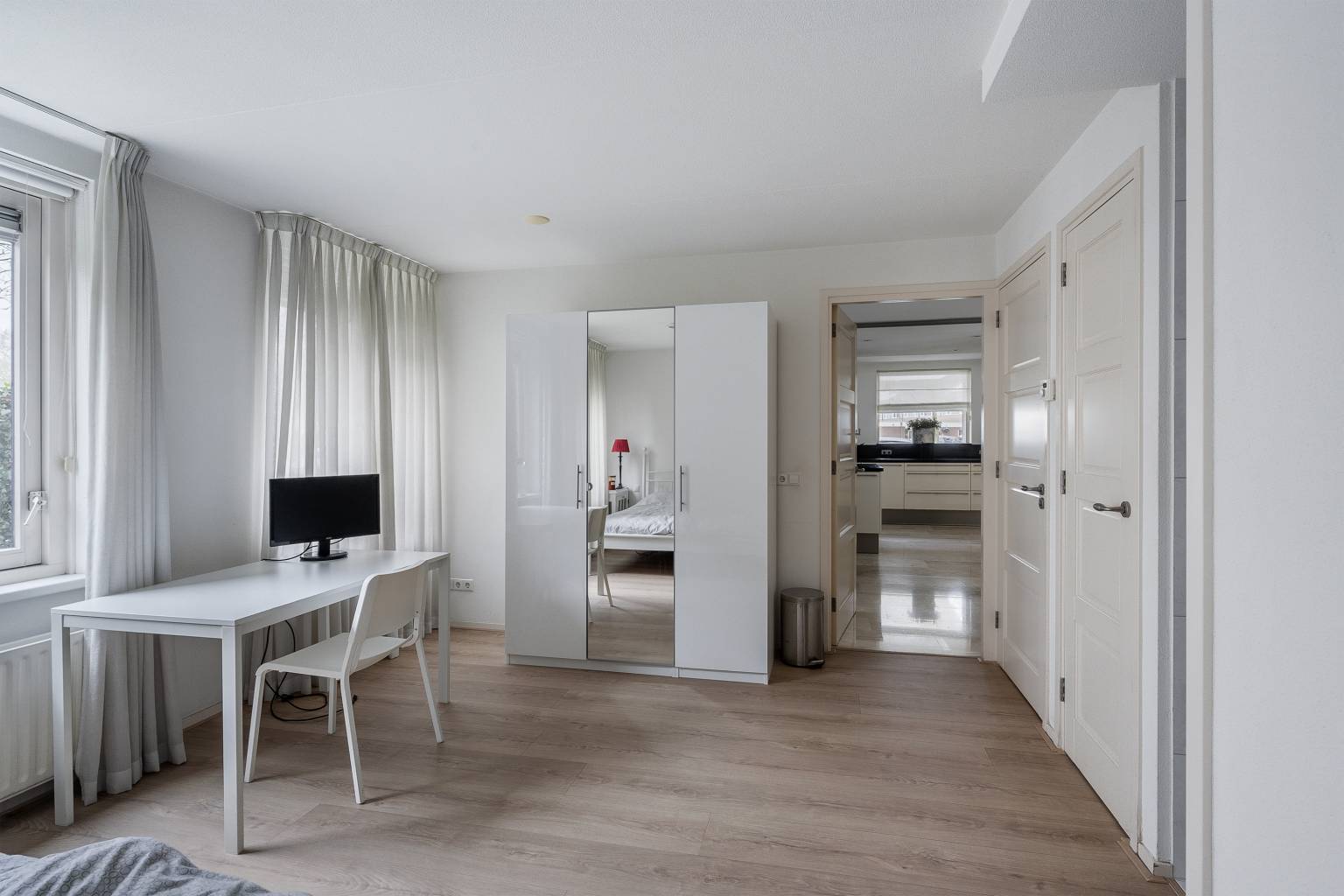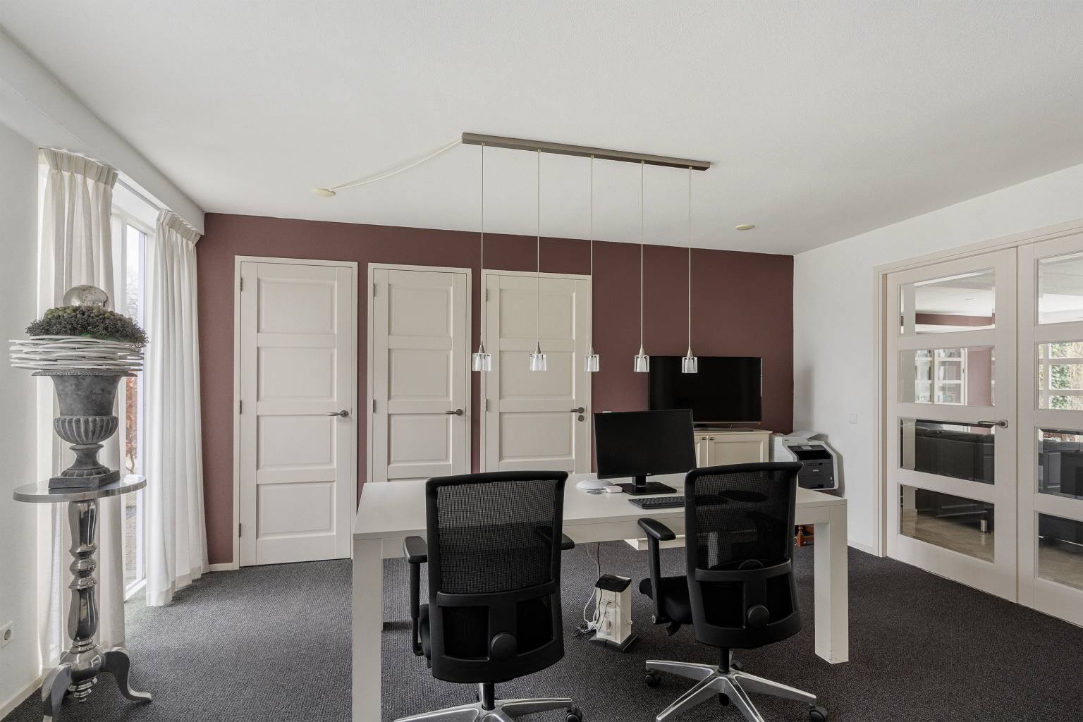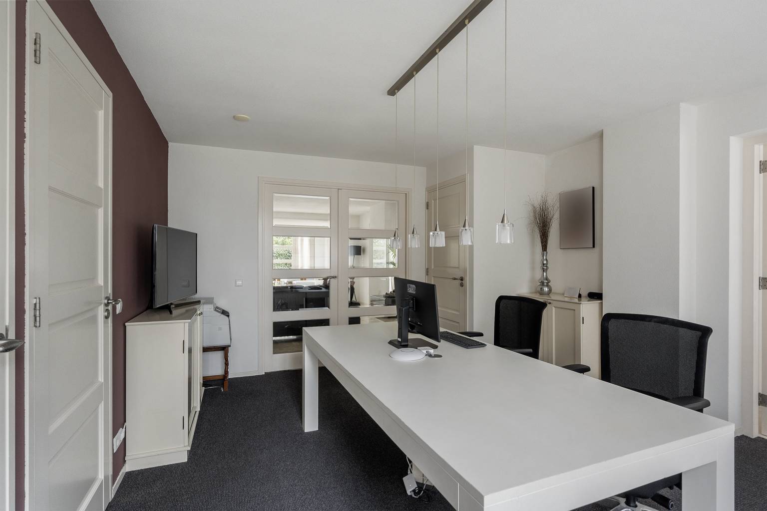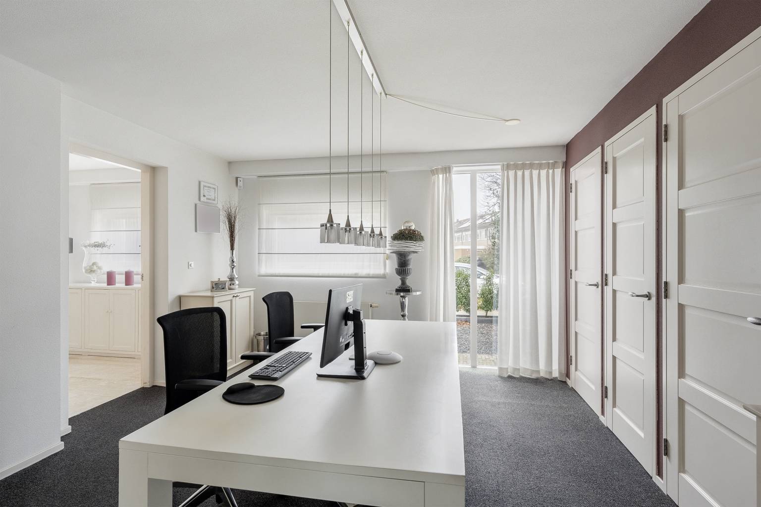 De werkkamer is een rustige ruimte met veel lichtinval door de ramen tot aan de vloer. De vloer is voorzien van vloerbedekking, wat zorgt voor geluidsdemping. In deze ruimte bevinden zich twee vaste kasten met planken en één kast is tevens ook de meterkast. Vanuit hier is er toegang tot de garage.