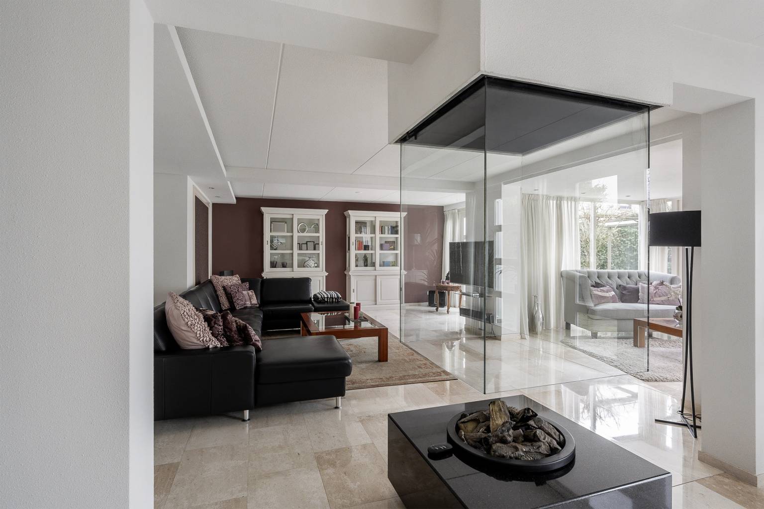 De woonkamer heeft een speelse indeling en door de mooie gashaard in het midden van de ruimte is er een fijne verdeling tussen de zitkamer en de eetkamer. Doordat de haard vrij is geplaatst en is voorzien van glas maakt het dat deze ruimtes samen een mooi geheel vormen. Aan de zitkamer is een serre aangebouwd. Deze zorgt naast de viertal openslaande deuren naar achtertuin voor veel lichtinval en is daardoor een heerlijke plek om te ontspannen. Het plafond is hier glad afgewerkt en voorzien van inbouw spots. In zowel de zitkamer als de eetkamer is er een wand voorzien van een mooie brede omlijsting en er is gedeeltelijk een verlaagd plafond gemaakt met inbouw spots. Door middel van openslaande deuren is er vanuit de eetkamer toegang tot de keuken.