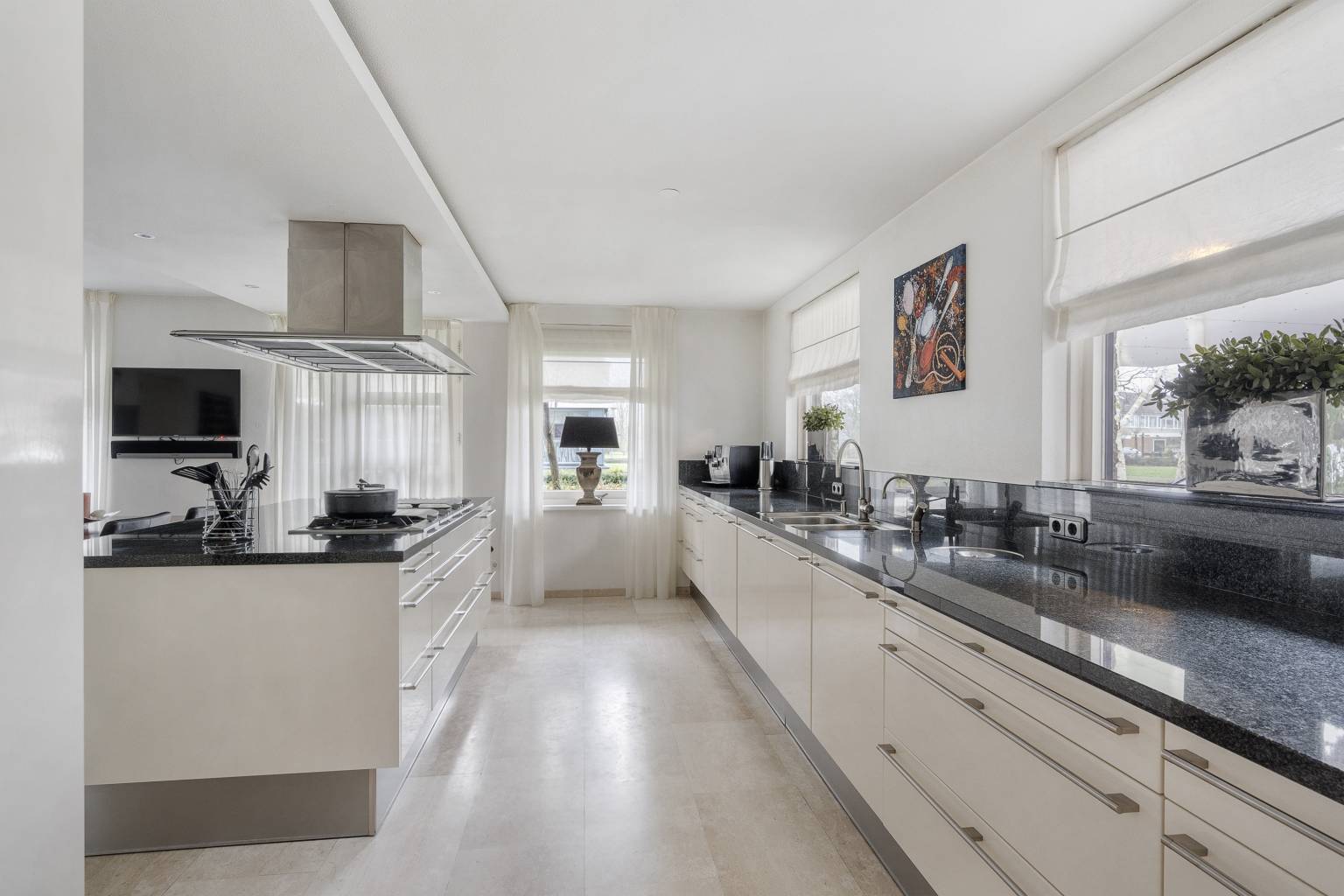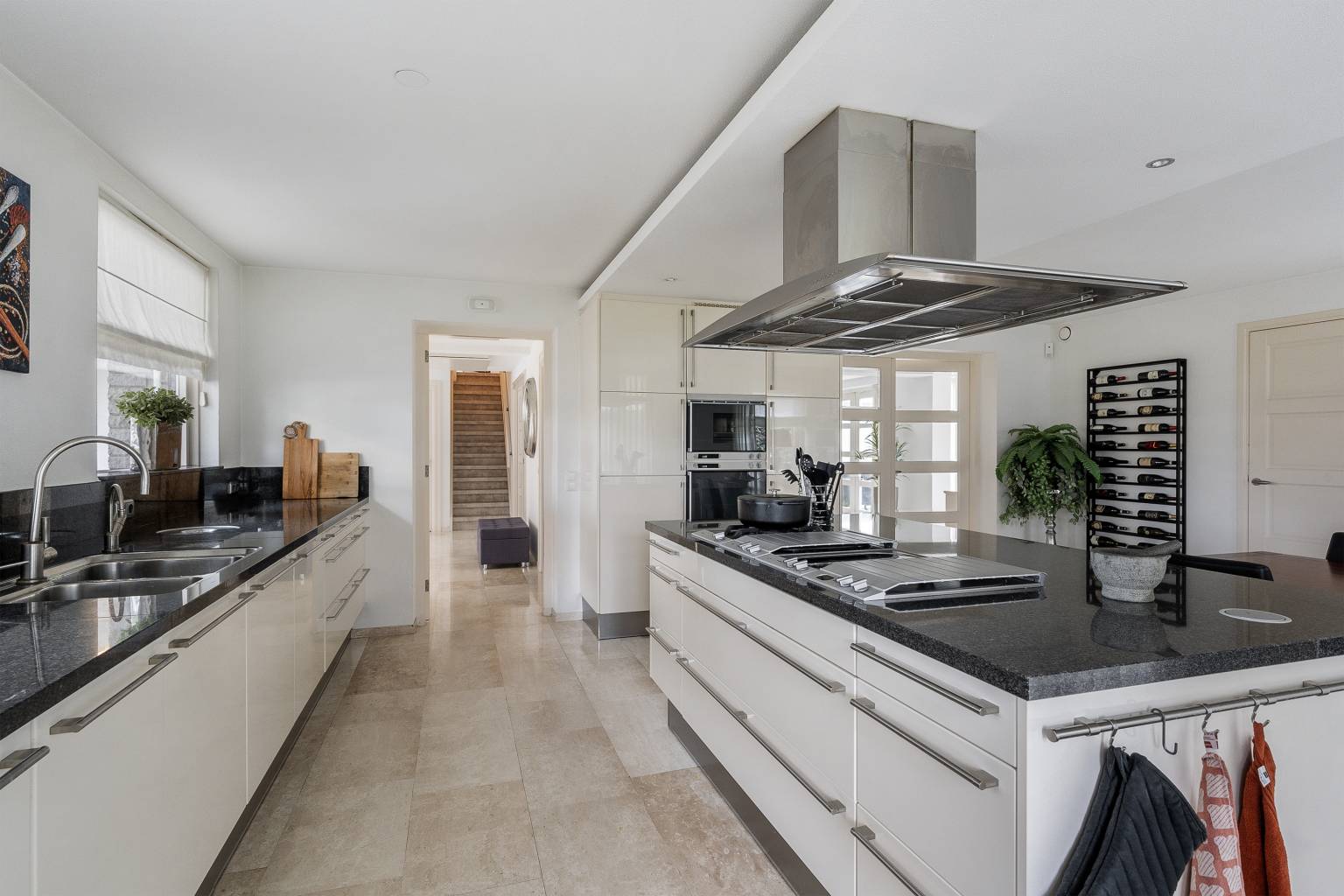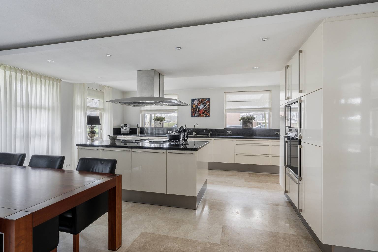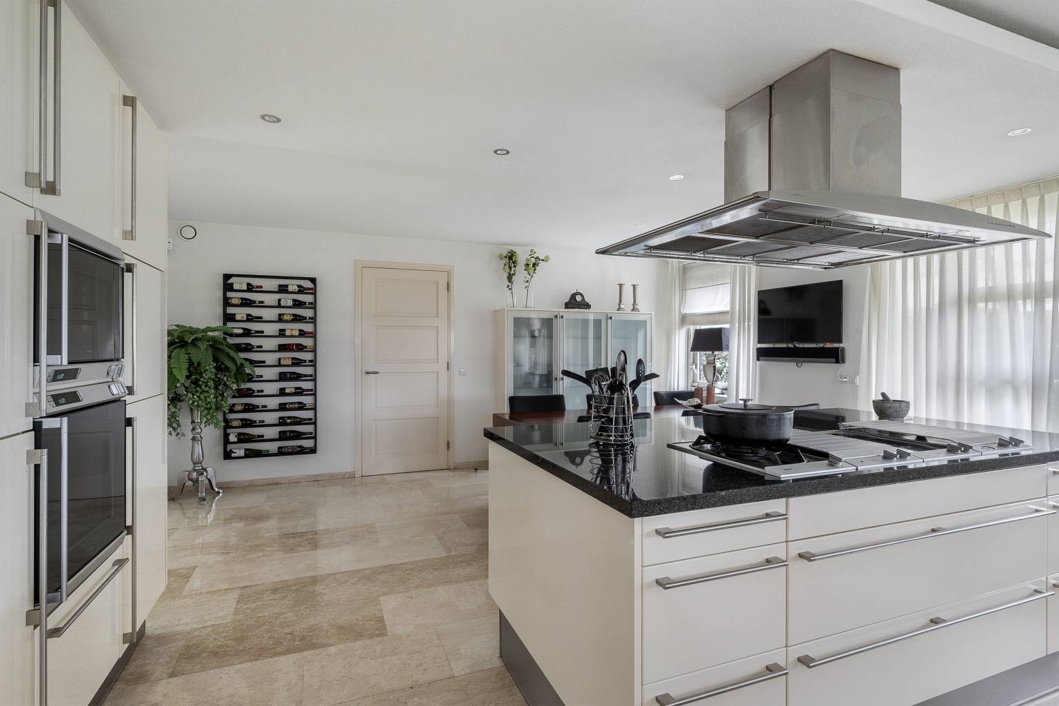 De Siematic keuken is ruim opgezet en is een echte leefkeuken. Het beschikt over een recht keukenblok, een kookeiland, een kastenwand en daarnaast biedt het nog voldoende ruimte voor een grote eettafel. Het aanrechtblad is van natuursteen en loopt door naar de achterwand. Hierin zijn stopcontacten verwerkt. Naast dat de keuken over veel opbergruimte beschikt is er ook diverse inbouwapparatuur aanwezig, te weten een oven, een stoomoven, een magnetron, een vriezer, een koelkast, een vaatwasser, een Quooker kraan, een wokbrander, een grill, twee inductiekookplaten, een inbouw friteuse (momenteel niet werkend) en er hangt een afzuigkap met verlichting. Rondom is er veel lichtinval door de ramen en vanuit de keuken is er een deur naar de zijtuin.