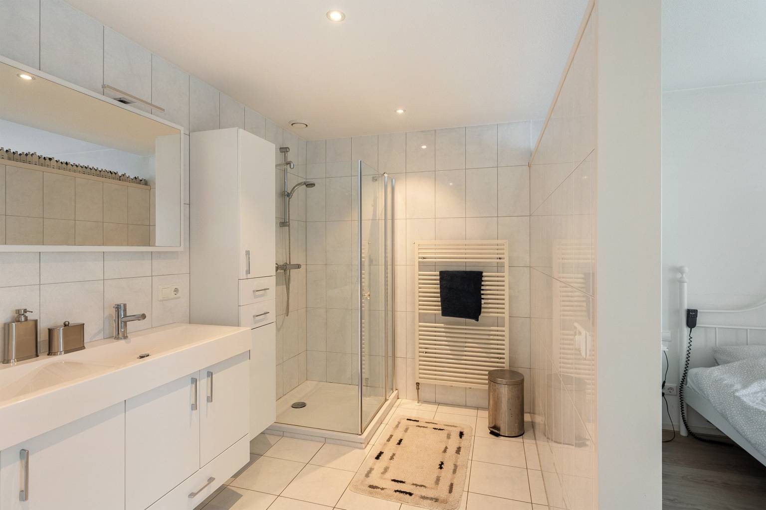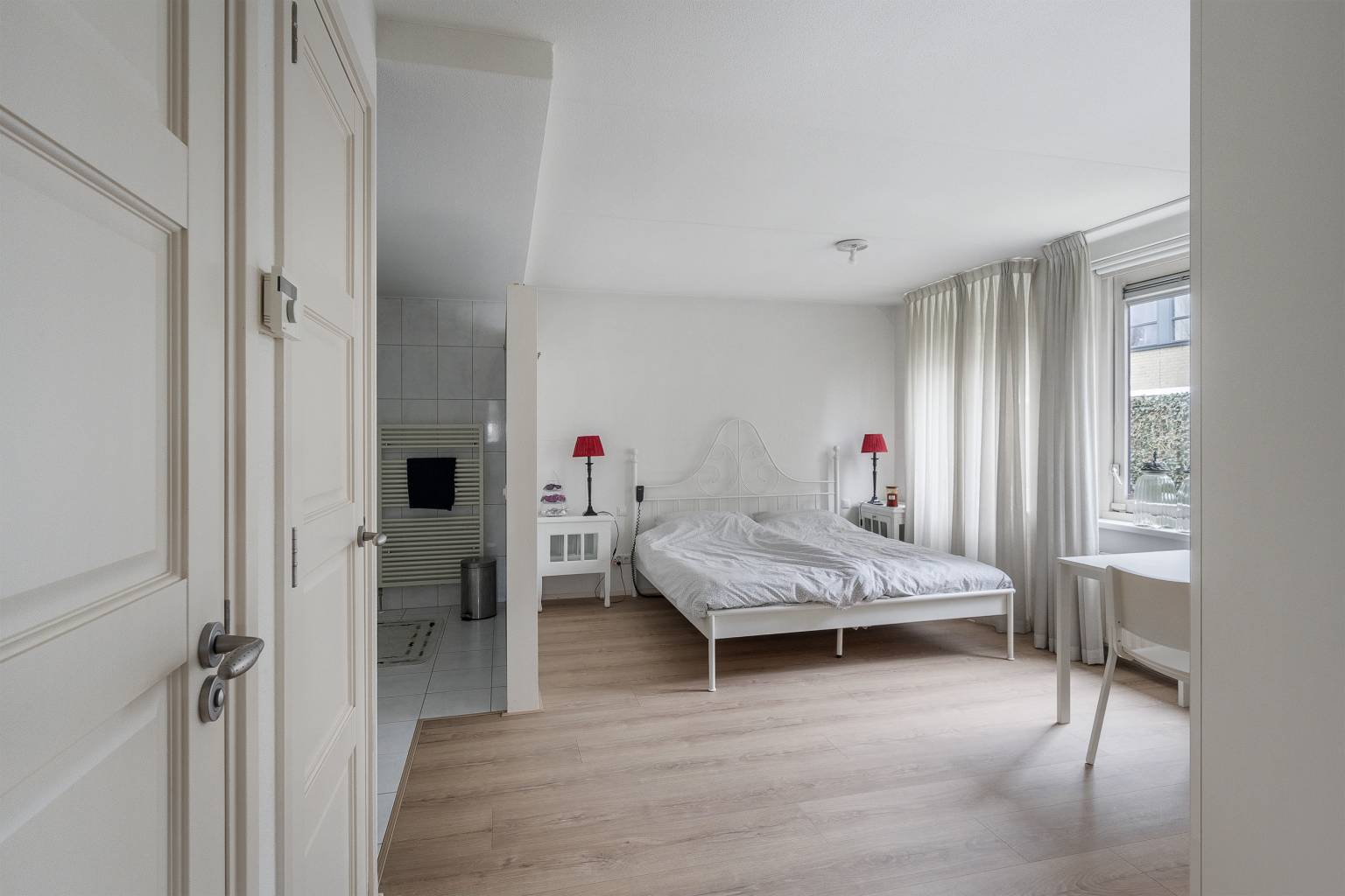De eerste slaapkamer is ook bereikbaar vanuit de keuken en voorziet in alle comfort. Het beschikt over een eigen toilet en een en-suite badkamer. In deze kamer is een meterkast aanwezig en in het toilet is een schuifdeur naar de technische ruimte waar zich de opstelling van de Cv-ketel, de unit van de mechanische ventilatie en de omvormer van de zonnepanelen bevinden. Het toilet is evenals de badkamer volledig betegeld en voorzien van een zwevende toiletpot, een fonteintje en in het plafond is een inbouw spot en een afzuigpunt verwerkt. De badkamer heeft een douchecabine, een dubbel wastafelmeubel met twee hoge kasten en een handdoekenradiator. Het plafond is voorzien van inbouw spots en er is een afzuigpunt aanwezig. Door al deze gemakken is deze kamer ideaal voor gasten, maar ook zeker voor mantelzorg. De ruimte kan ook uitstekend dienen als praktijkruimte aan huis.