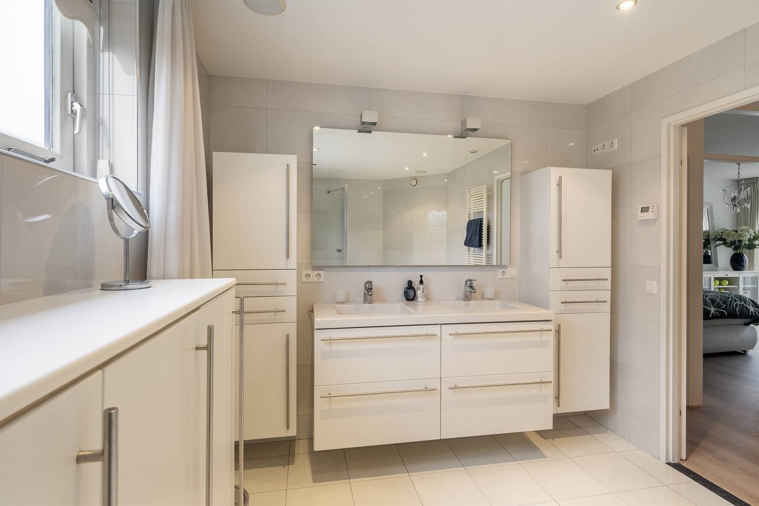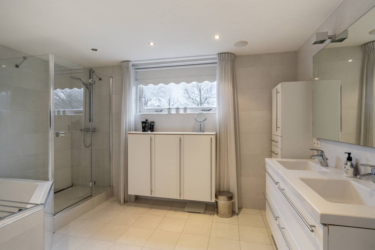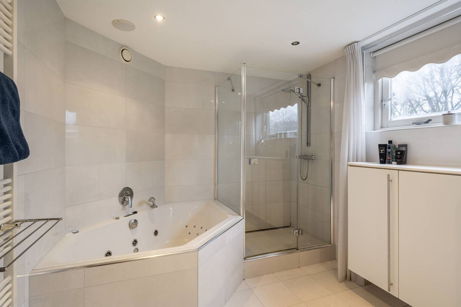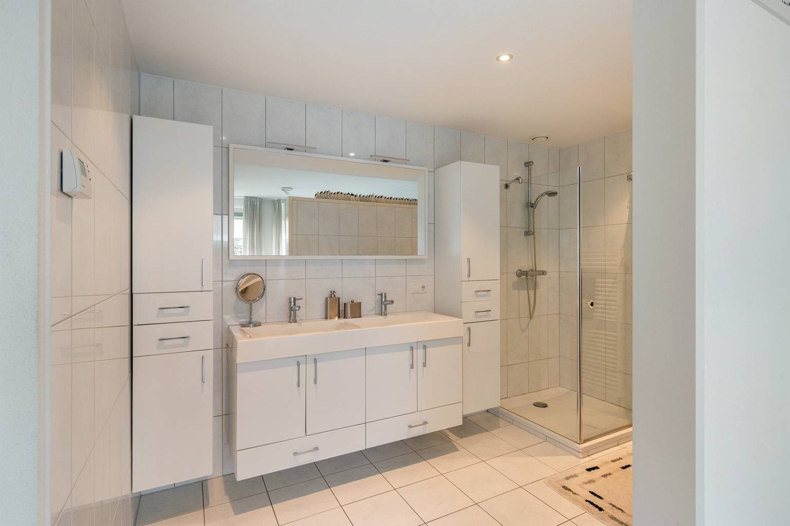 De tweede badkamer is in dezelfde stijl uitgevoerd als de eerste badkamer en zeer compleet met een tweepersoons whirlpool, een douchecabine en een wastafelmeubel met een dubbele spoelbak. Daarnaast is er veel kastruimte en er hangt een handdoeken radiator. Deze ruimte is eveneens volledig betegeld, het plafond is voorzien van inbouw spots, er is een afzuigpunt aanwezig en een te openen raam voor natuurlijke ventilatie.