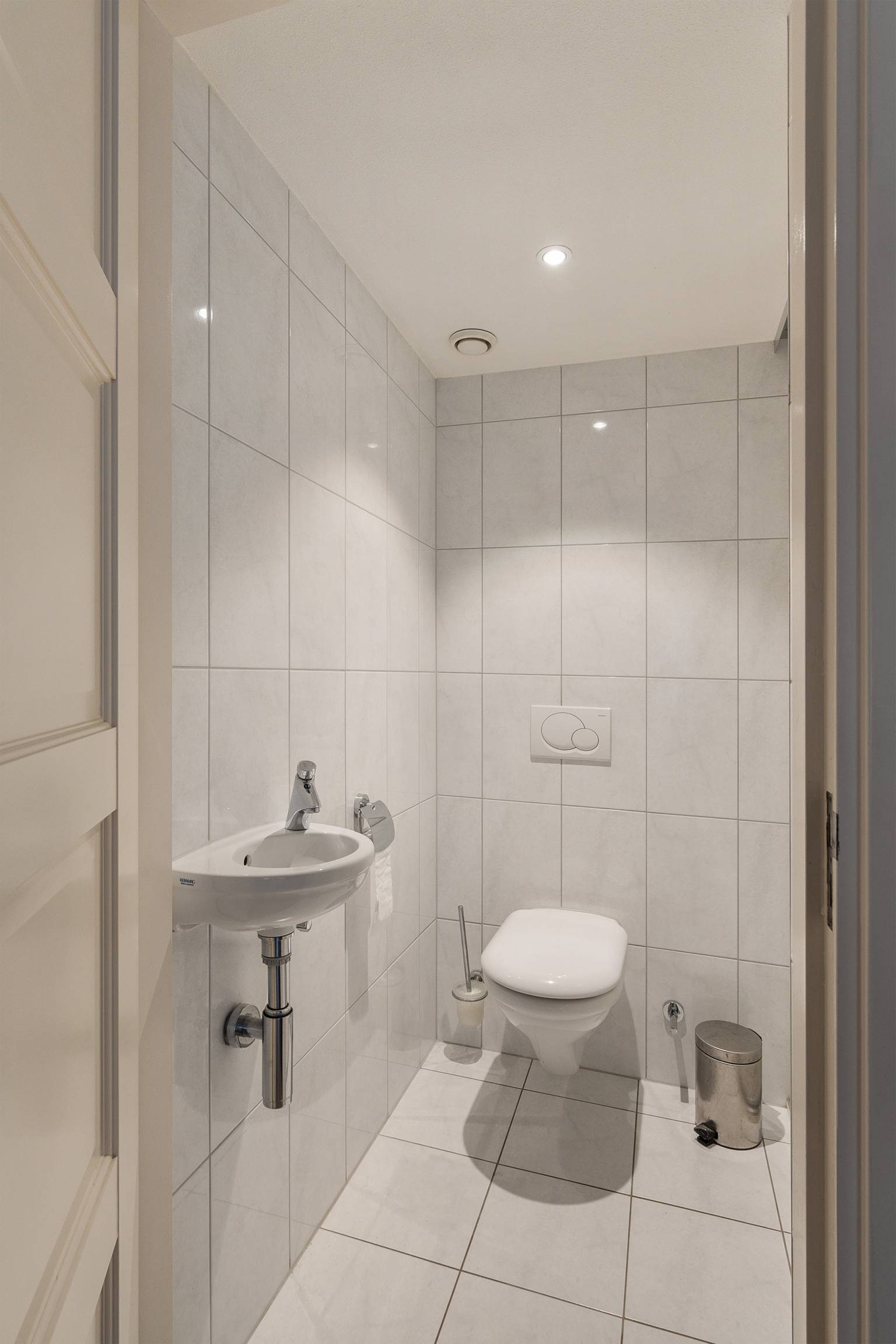 Het aparte toilet is eveneens uitgevoerd in dezelfde stijl als de twee badkamers en heeft een zwevende toiletpot en een fonteintje. In het plafond bevindt zich het afzuigpunt van de mechanische ventilatie en een inbouw spot.