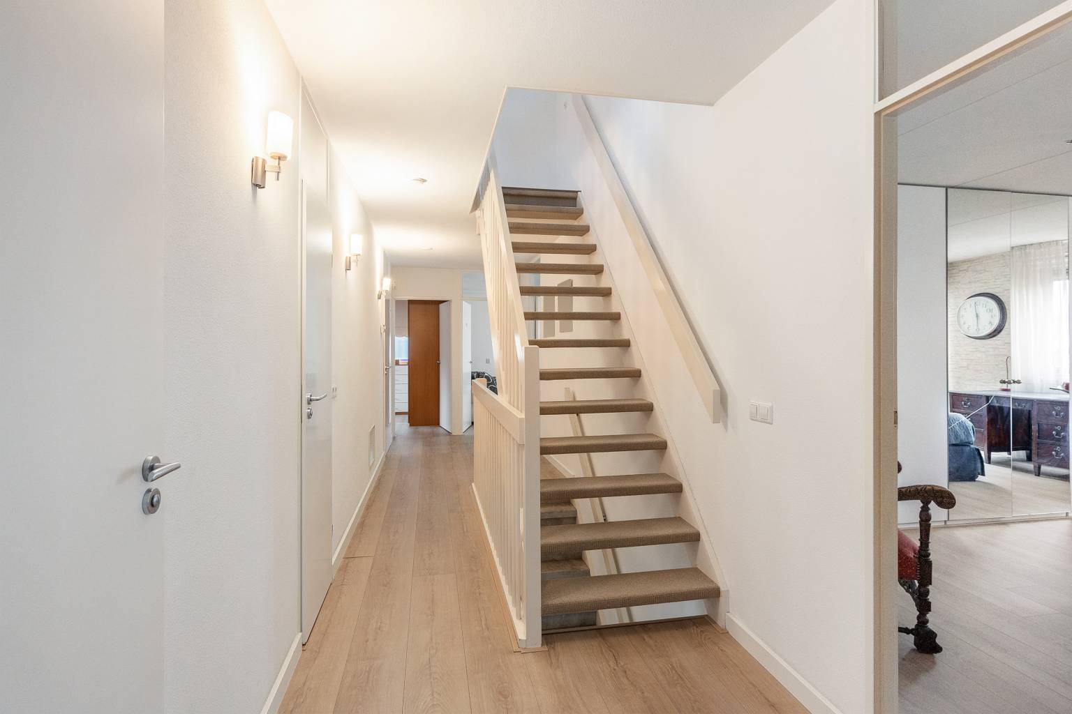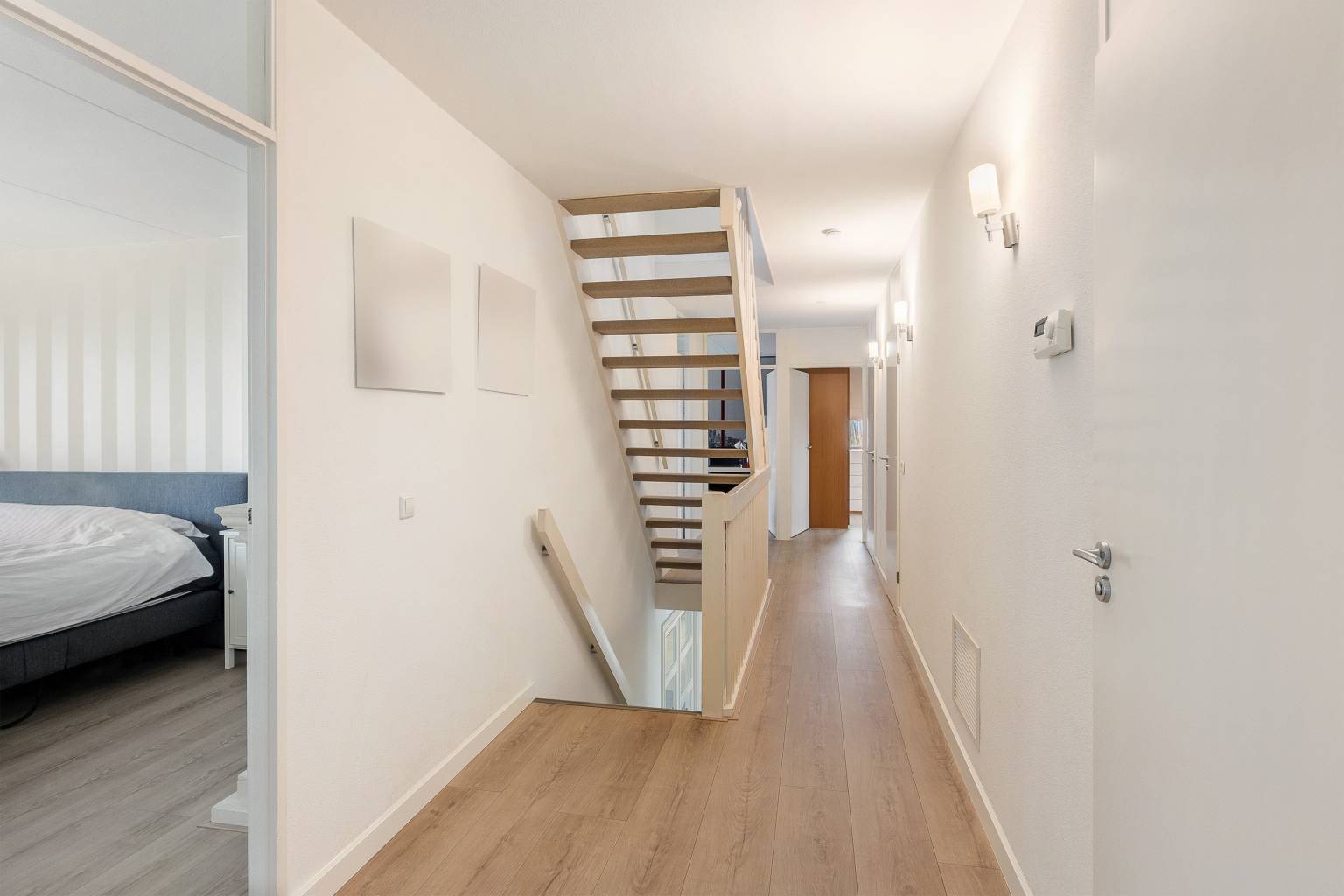 Vanaf de ruime overloop is er toegang tot vier slaapkamers en twee kamers die ingericht zijn als inloopkasten, twee badkamers, een apart toilet en de gestoffeerde open trap naar de tweede verdieping.
