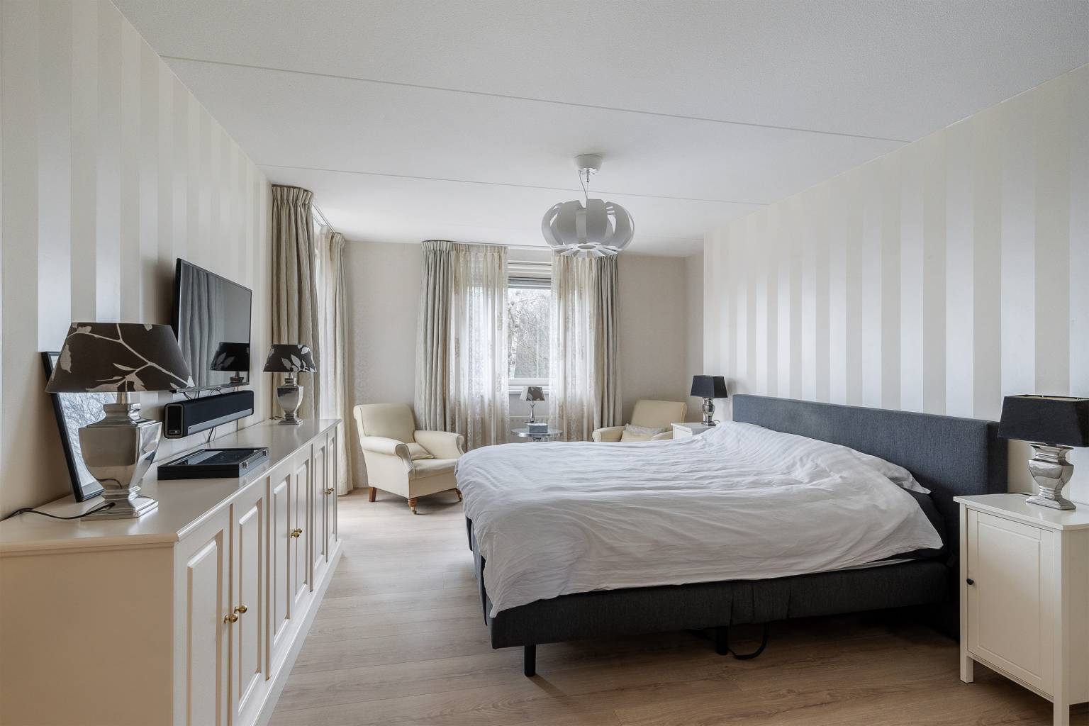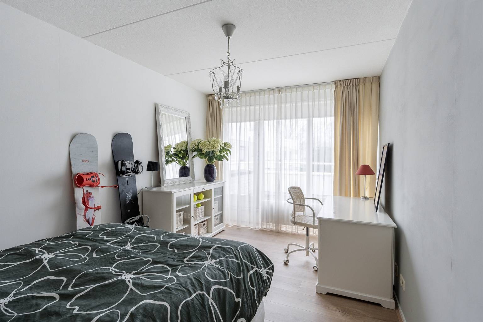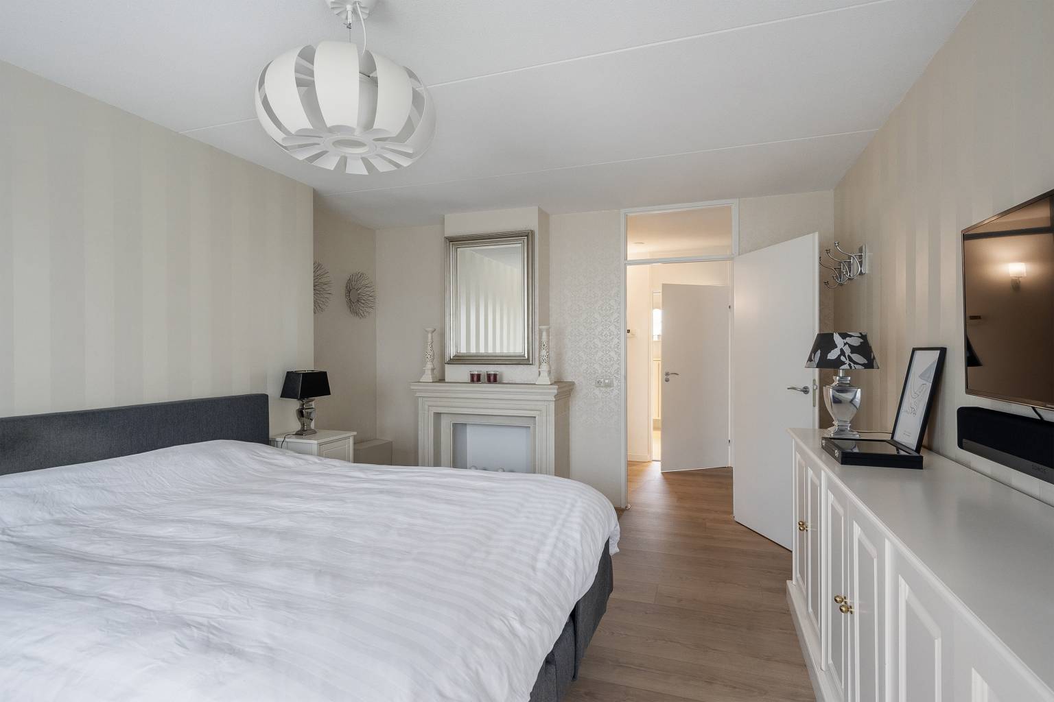 Alle slaapkamers hebben toegang tot een balkon en één slaapkamer is voorzien van een grote kastenwand. De hoofdslaapkamer is daarnaast ook nog voorzien van een mooie schouw met een sierhaard.