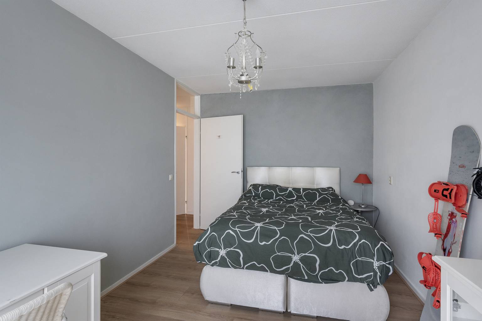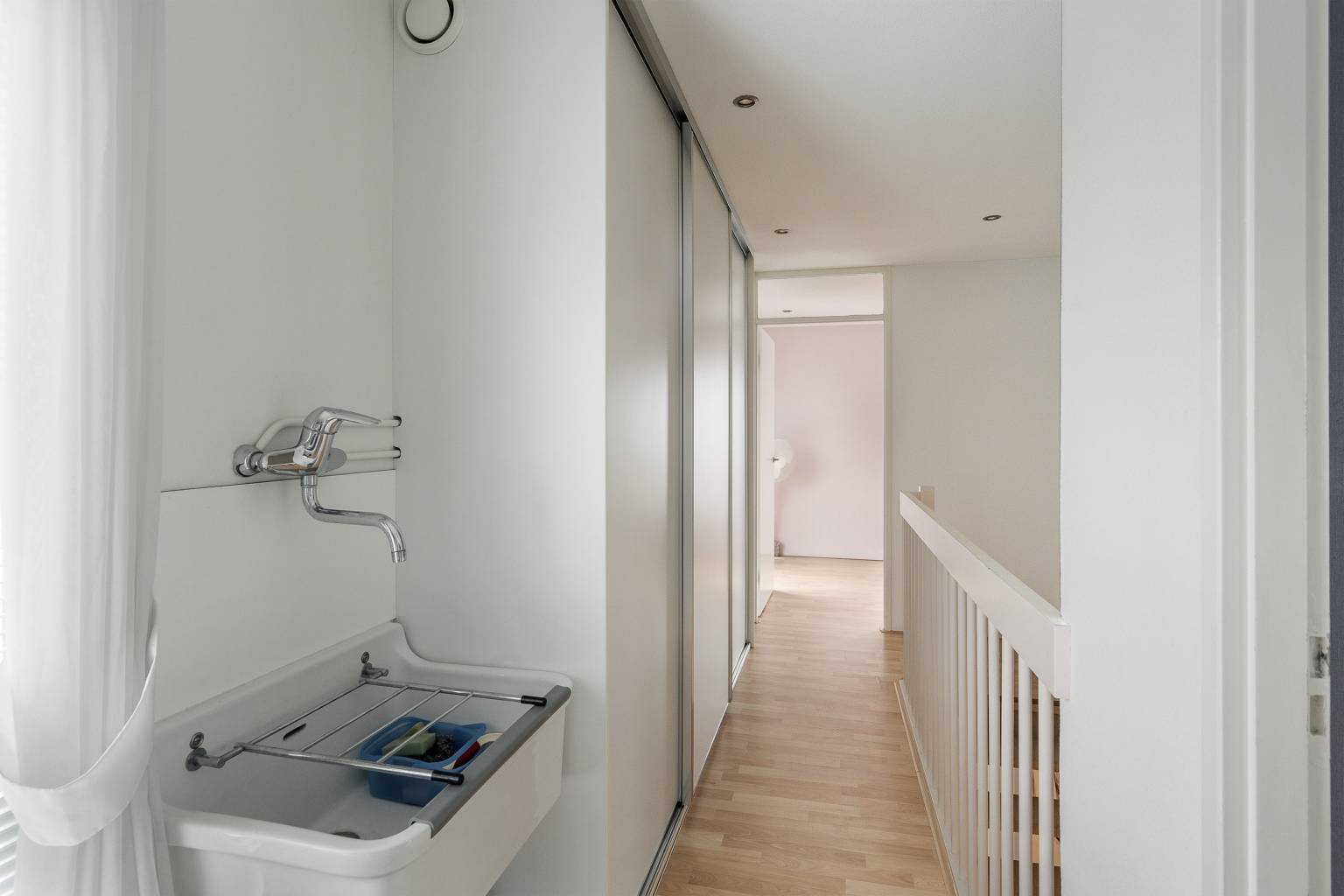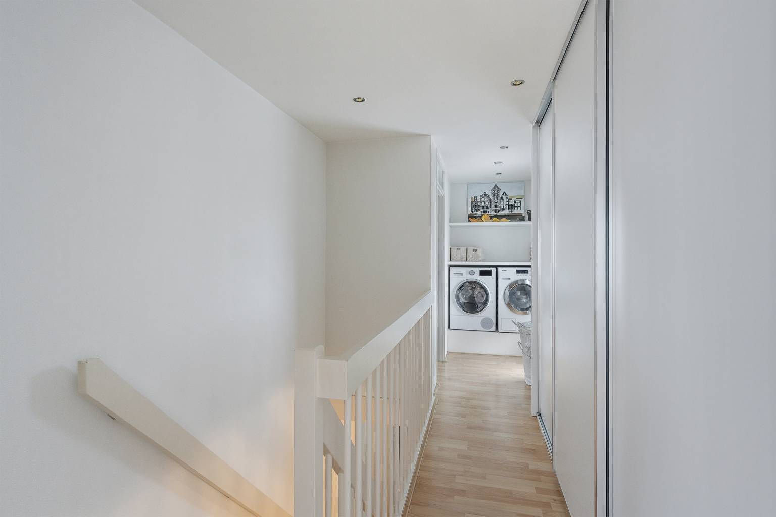 De overloop op deze verdieping biedt dankzij de grote vaste kast met schuifdeuren veel opbergruimte. De twee extra Cv-ketels zijn hier netjes in weggewerkt. Er is een aparte hoek voor de wasmachine en de droger met een handig werkblad met daarboven een plank. Hiernaast hangt ook een stortbak met een waterkraan. De vloer is voorzien van laminaat die drempelloos overloopt naar de twee slaapkamers op deze verdieping.
