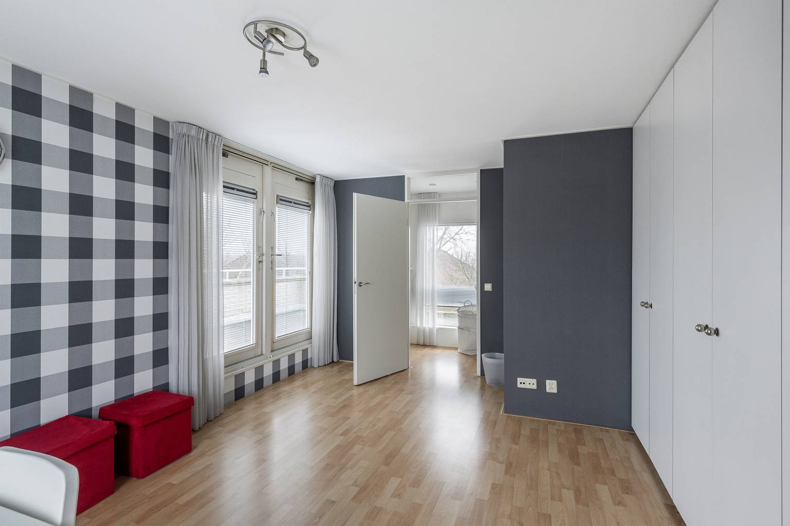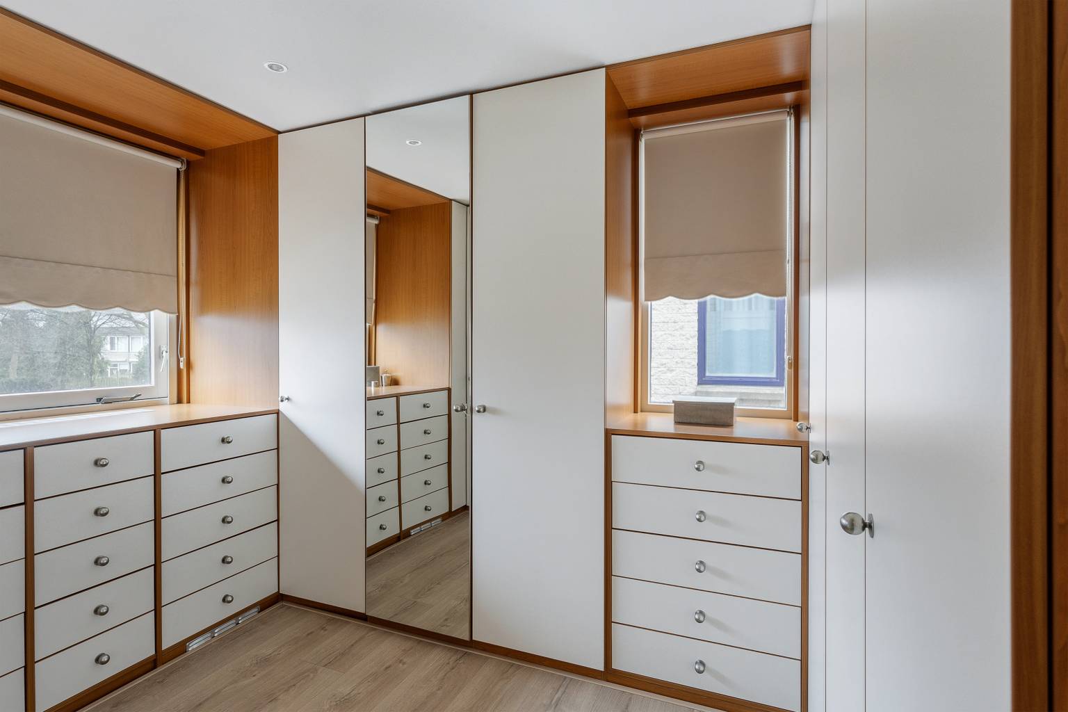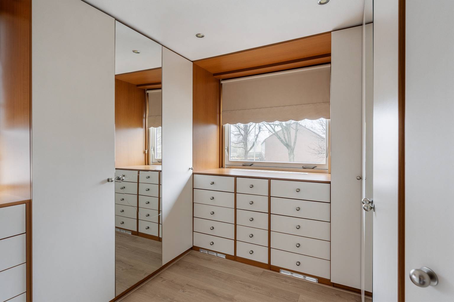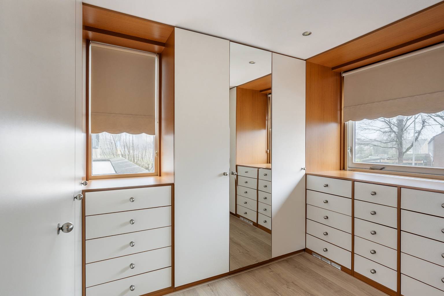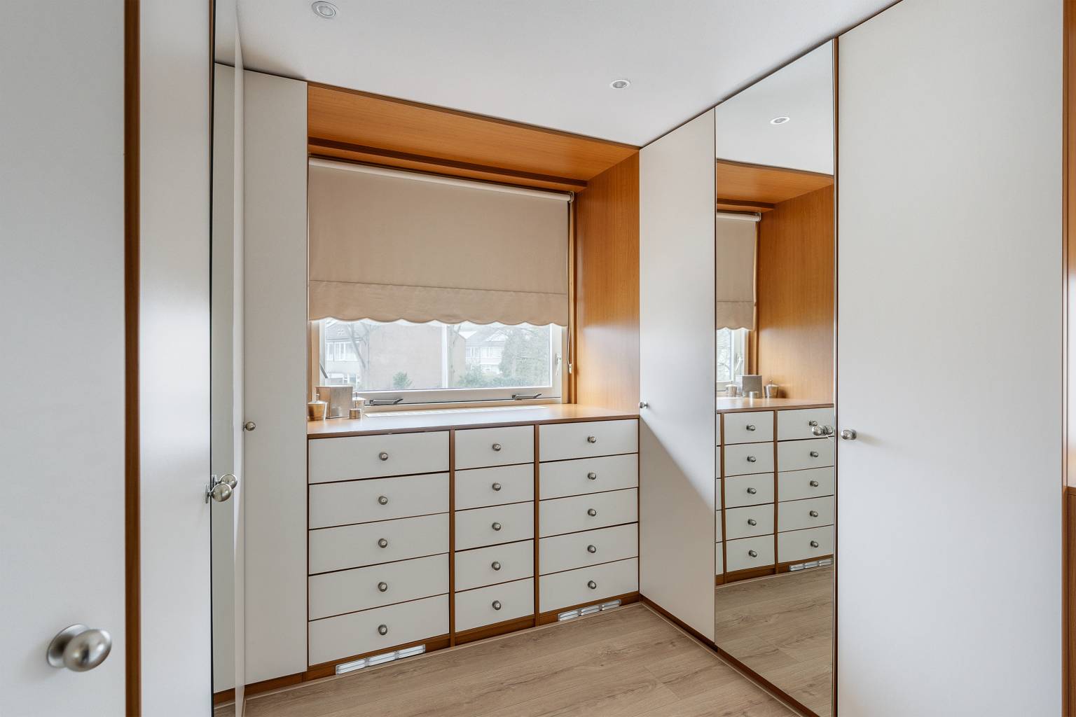 De inloopkasten zijn beide voorzien van veel kastruimte en hebben inbouw spots in het plafond.