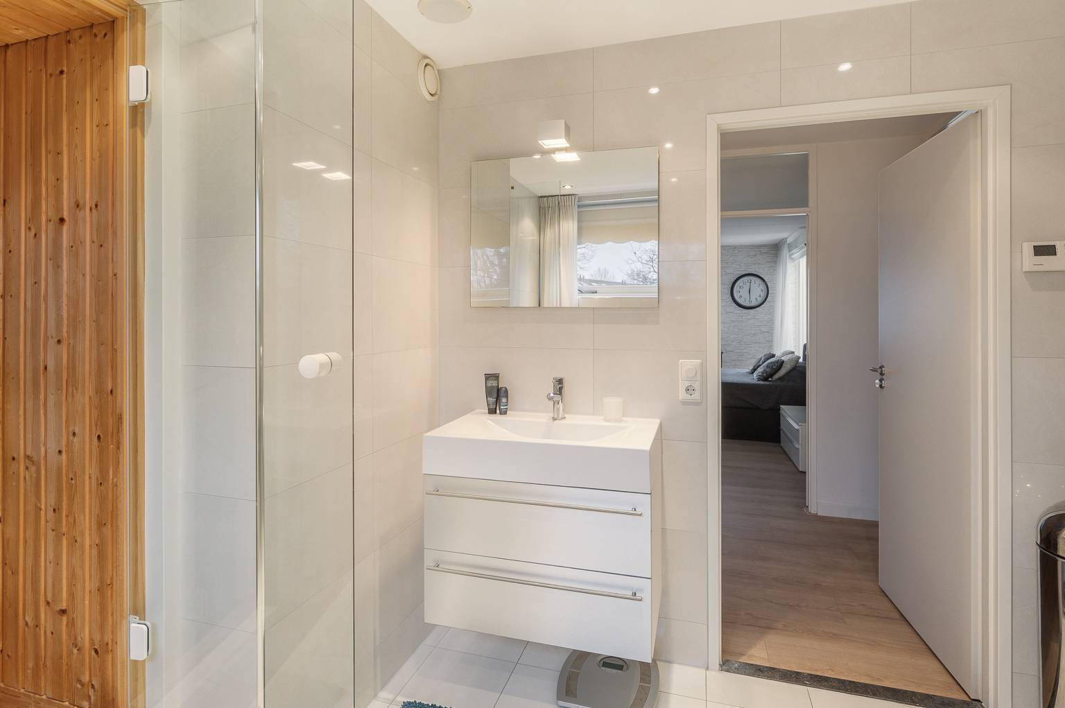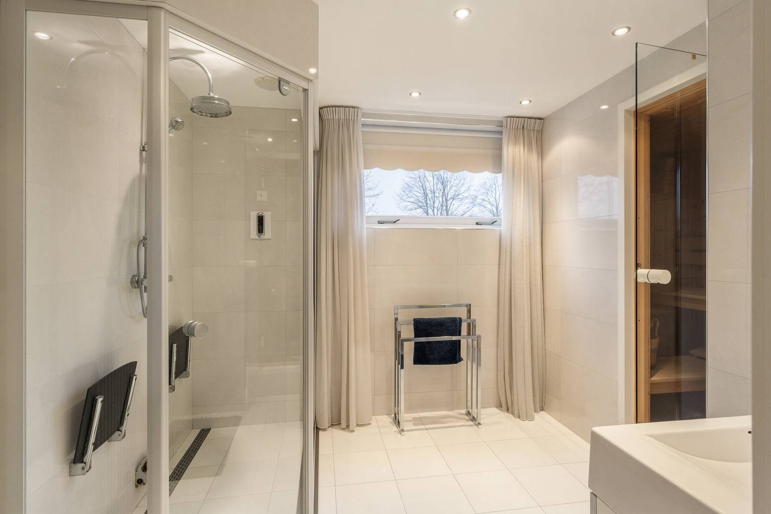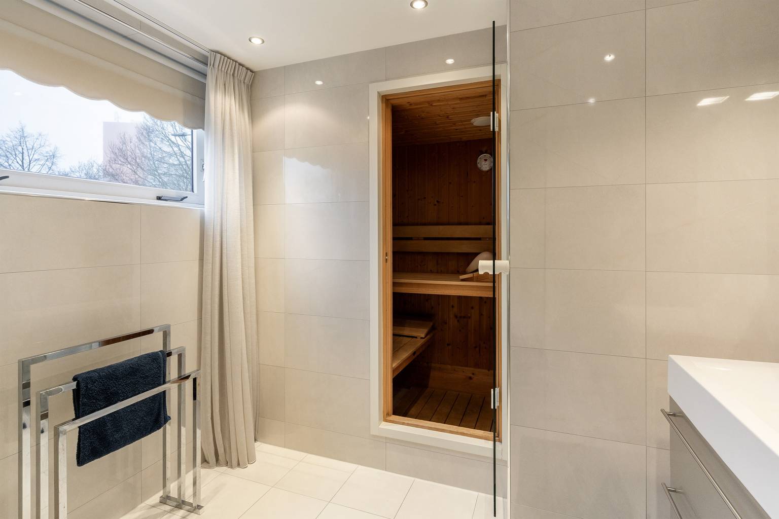 De eerste badkamer is een heerlijke wellness ruimte. Deze is voorzien van een sauna, een stoomdouche, een wastafelmeubel en een design radiator. De ruimte is volledig betegeld en het plafond is voorzien van inbouw spots. Daarnaast is er een afzuigpunt aanwezig en een te openen raam voor natuurlijke ventilatie.