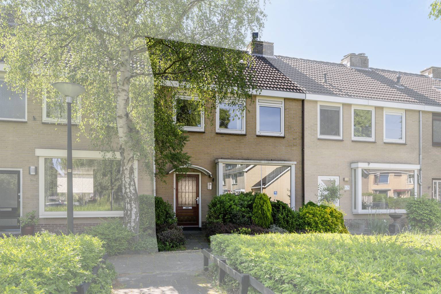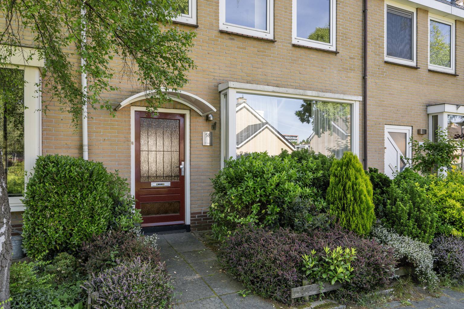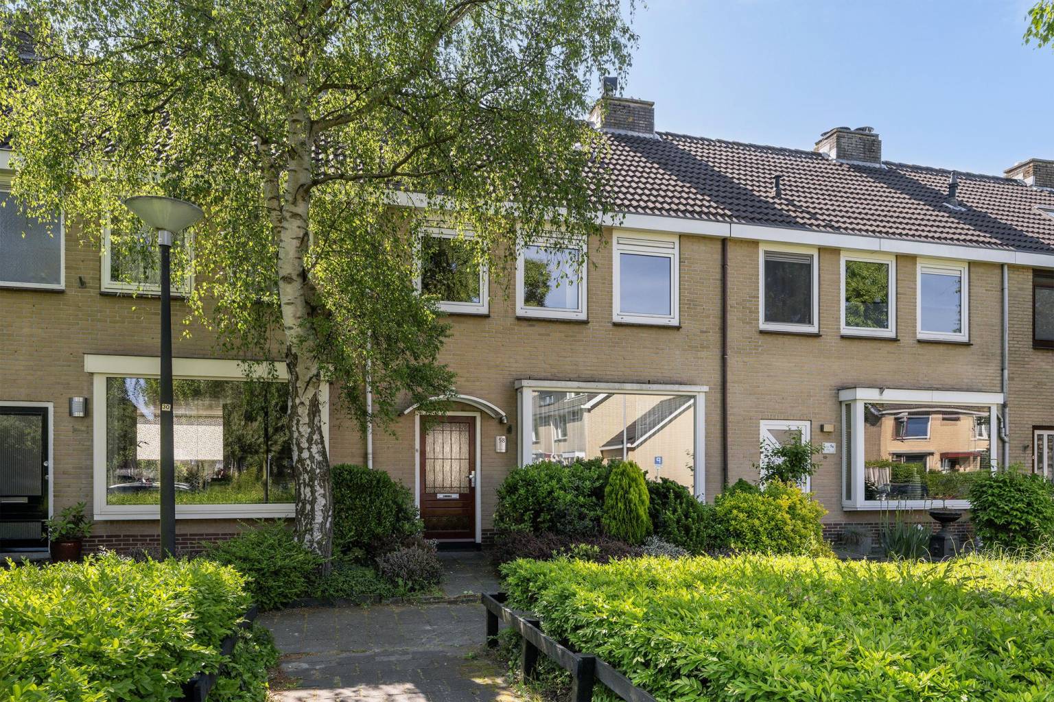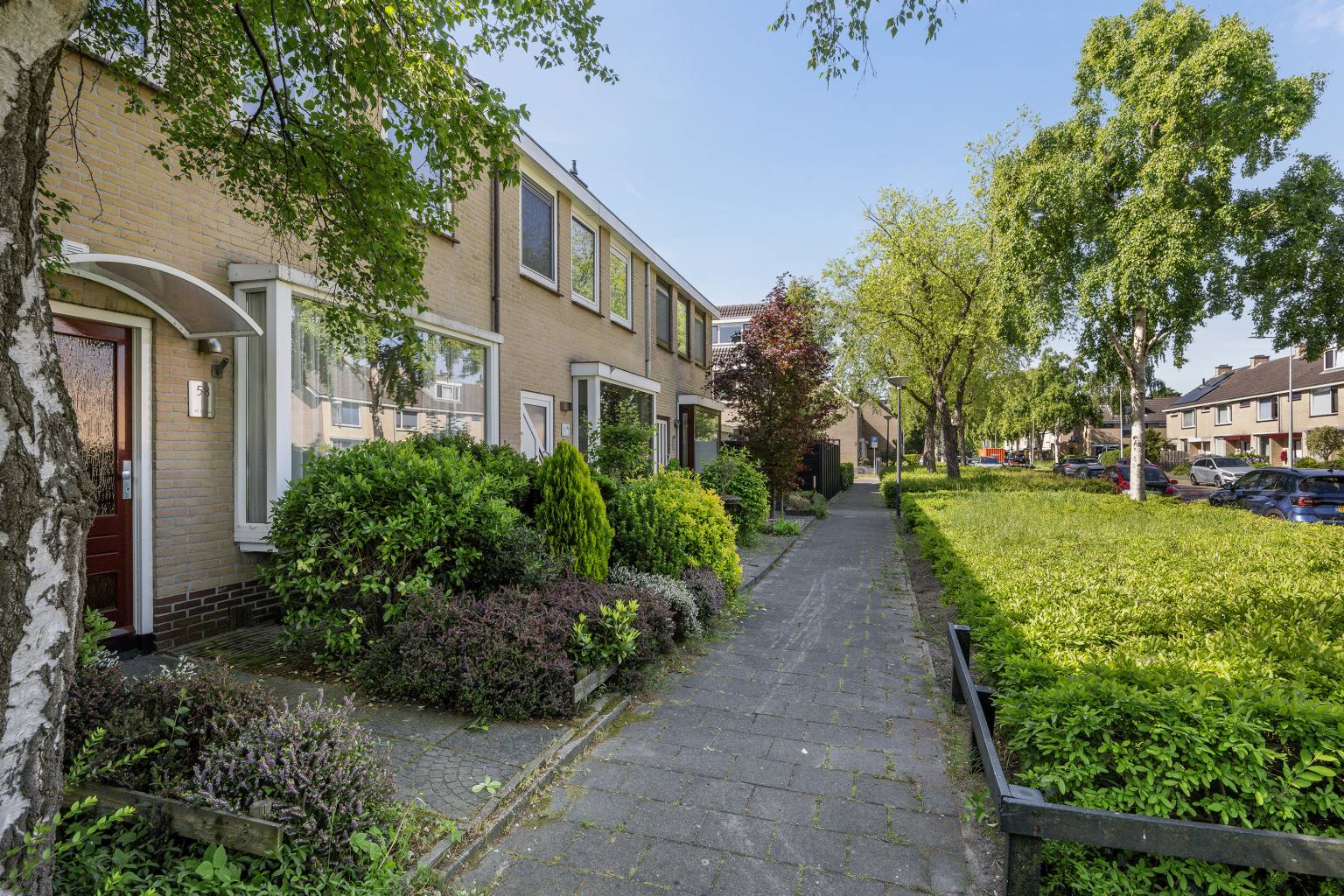De voortuin is openlijk te betreden met een stenen pad naar de voordeur en veel groene beplanting. Aan de gevel hangt een waterkraantje en de voordeur is praktisch overkapt met een glazen luifel.
