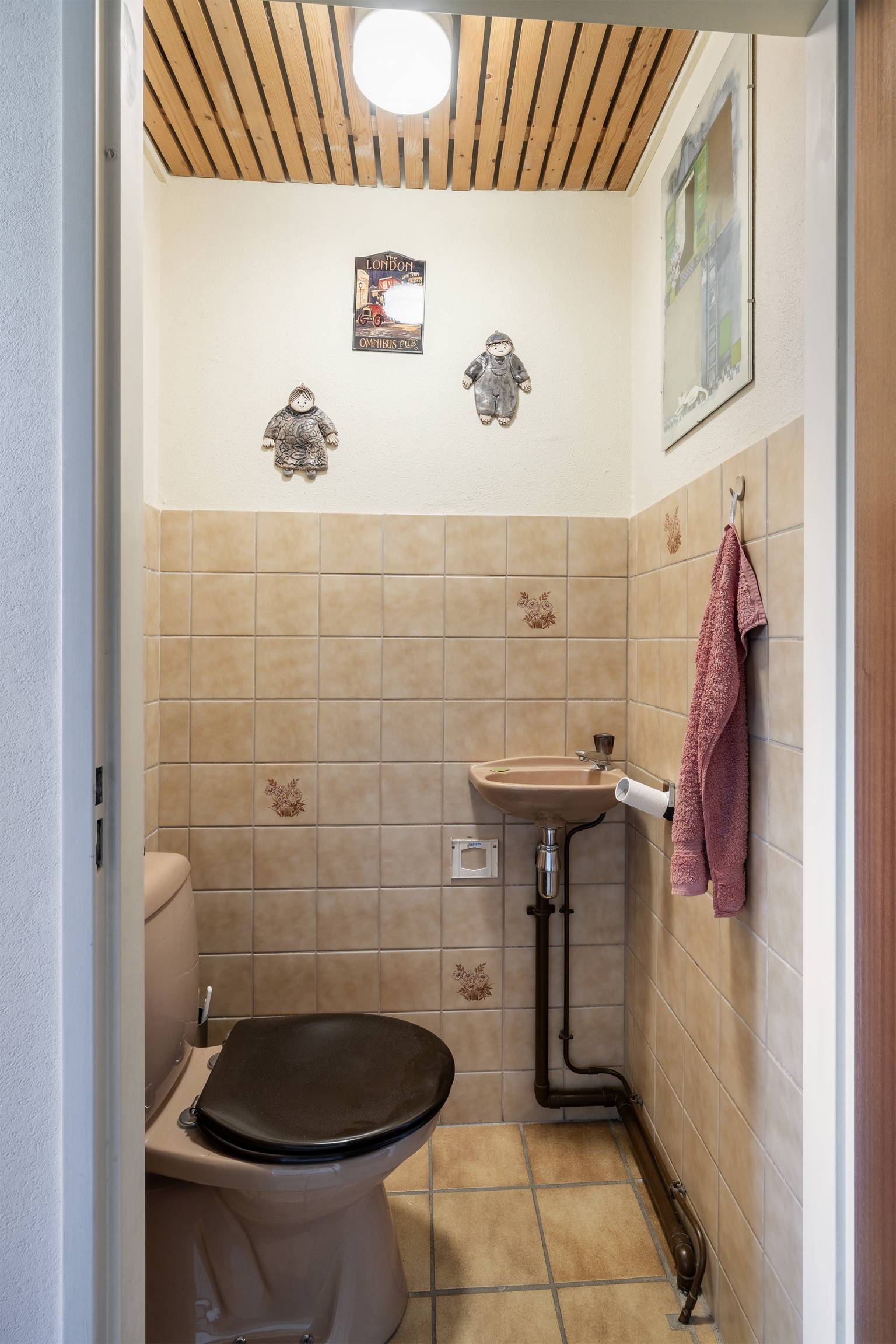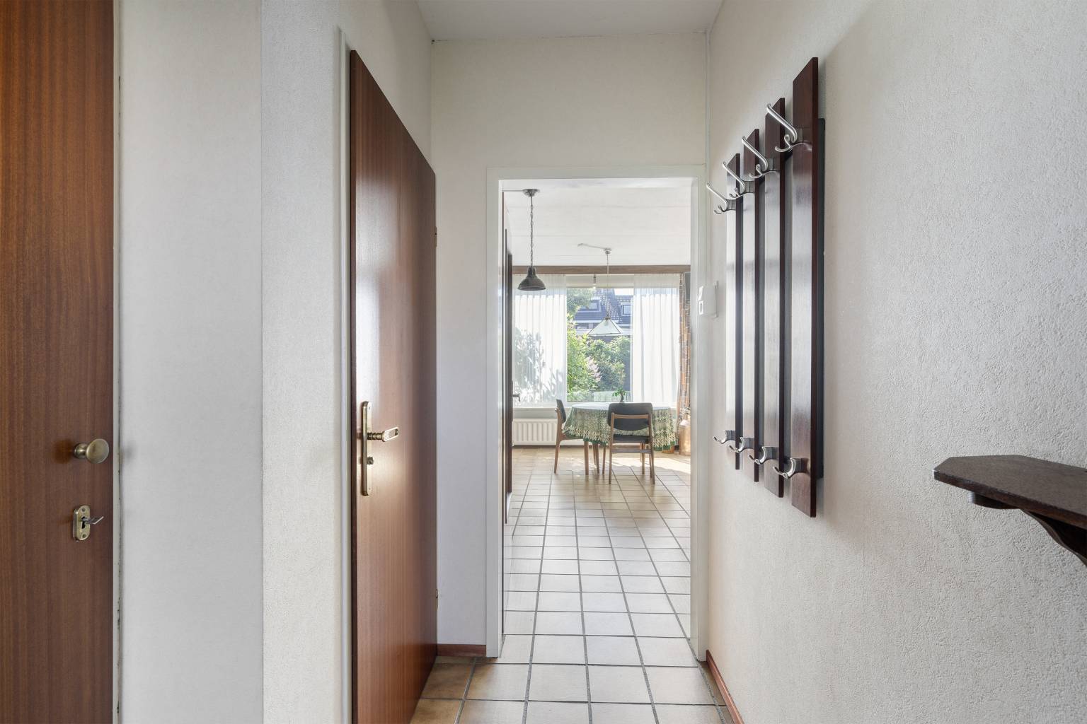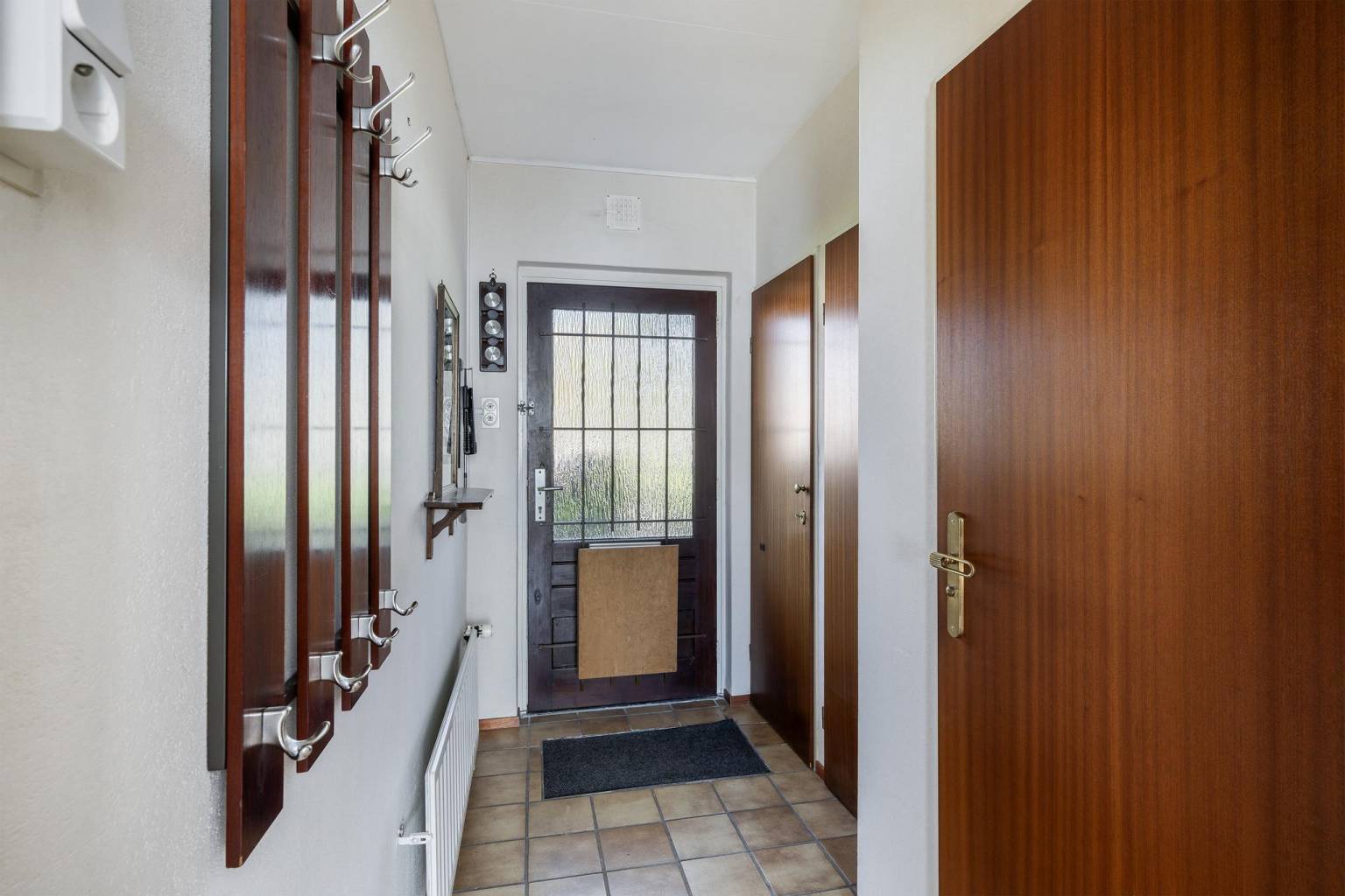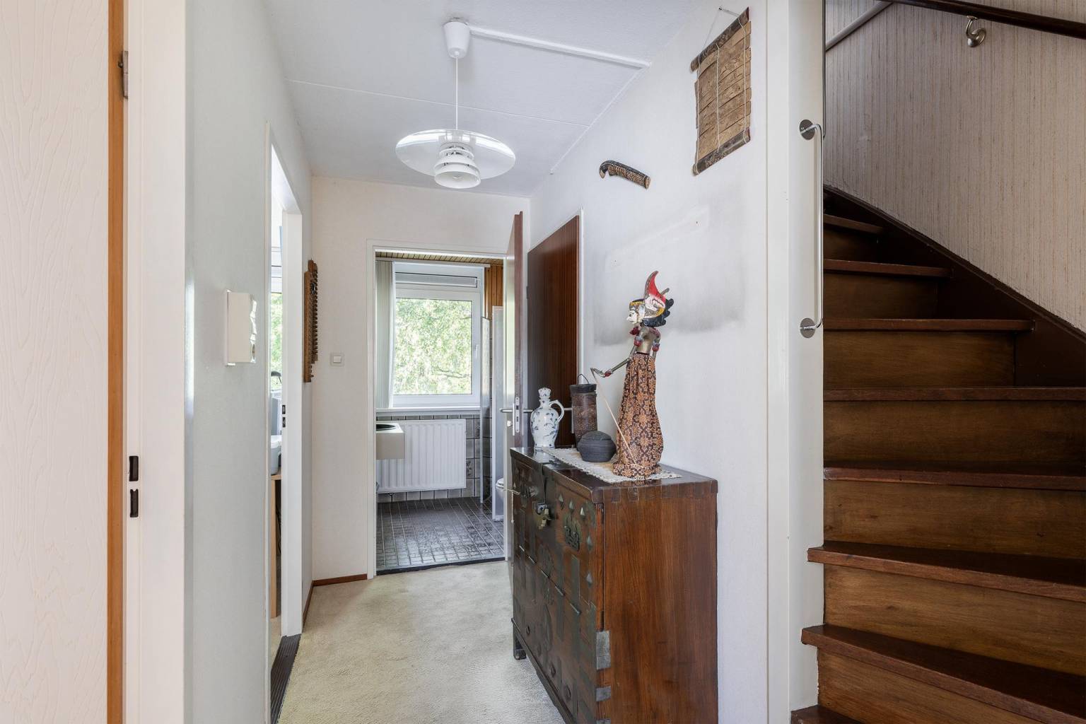 Binnenkomst in de entreehal. Deze is achter de voordeur voorzien van een schoonloop mat met daaronder een luik naar de kruipruimte. De wanden zijn afgewerkt met granol en de vloer, voorzien van plavuizen met daaronder vloerverwarming, is drempelloos doorgetrokken naar de woonkamer en de keuken. In de hal bevindt zich de meterkast, een bergkast en het gedeeltelijk betegelde toilet met een fonteintje en vanuit de hal is er toegang tot de woonkamer.