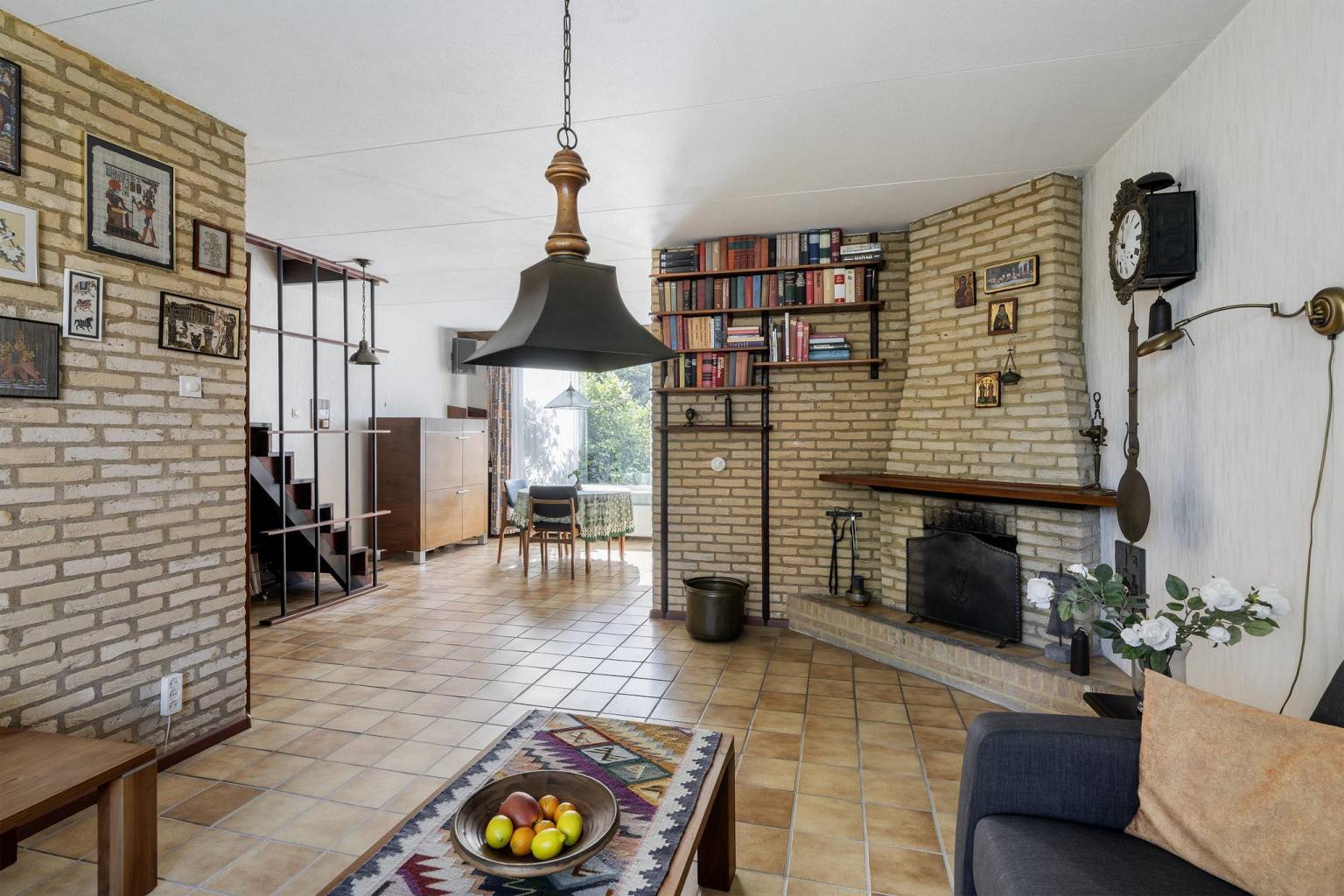 De woonkamer is met de zithoek gesitueerd aan de voorzijde en beschikt over een grote stenen schouw met een open haard. In het verlengde van de woonkamer is er een open trap naar de 1e verdieping en is er aan de achterzijde plaats voor een eethoek met zicht naar de achtertuin en vanwaar er een open toegang is tot de keuken. In de woonkamer zijn de wanden gedeeltelijk voorzien van steenstrips en behang en het plafond is gespoten.