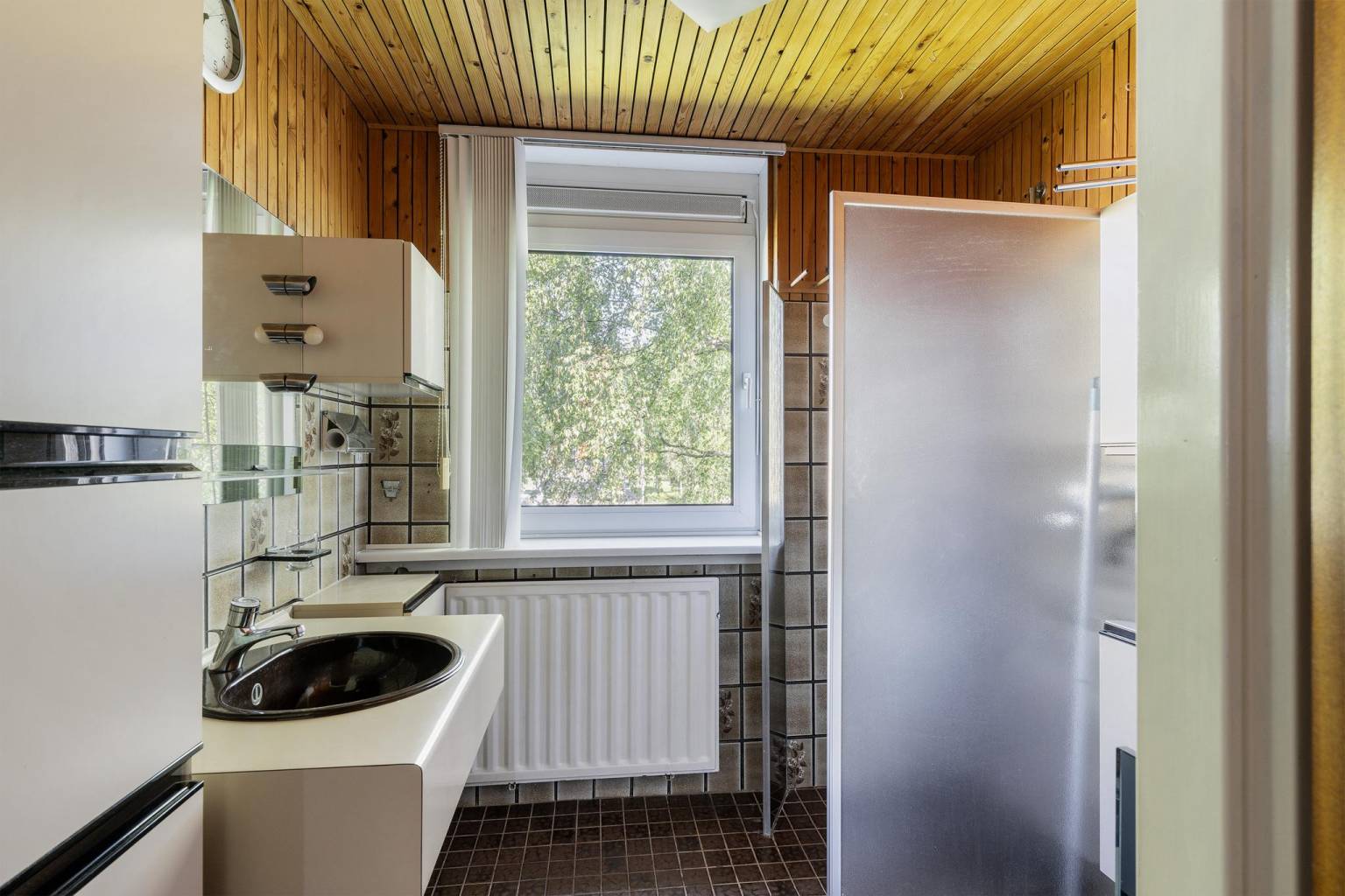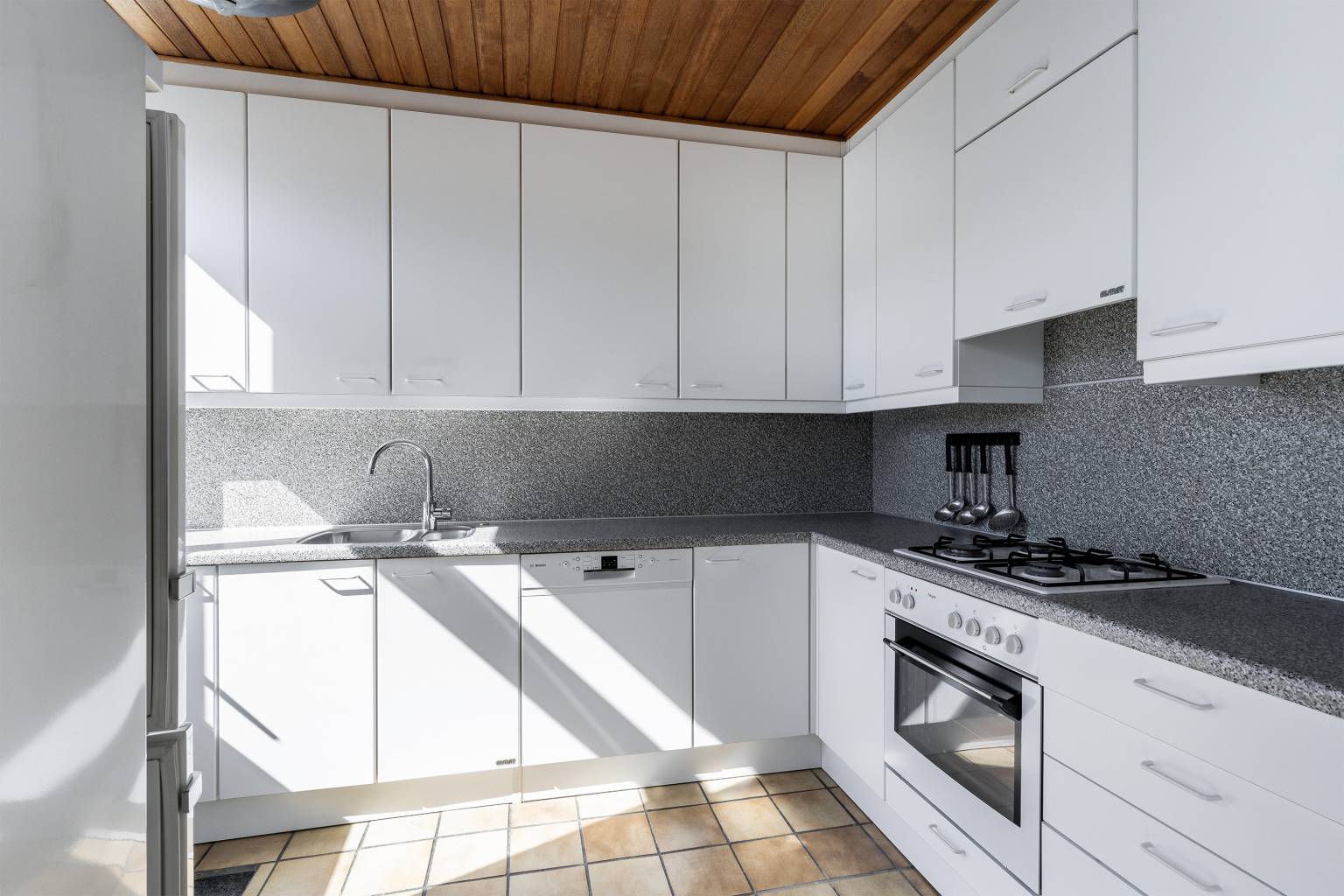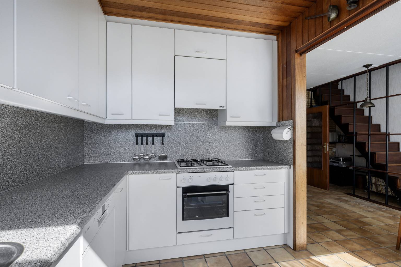 De keuken, opgesteld in een L-vorm, is voorzien van een kunststof aanrechtblad dat doorloopt naar de achterwand. De aanwezig bovenkasten zijn voorzien van verlichting en stopcontacten en daarnaast is er diverse apparatuur aanwezig, zoals een oven, een 4-pits gaskookplaat met een geïntegreerde afzuigkap en een vaatwasser. Het plafond is afgewerkt met houten schroten en vanuit de keuken is er een deur naar de achtertuin.