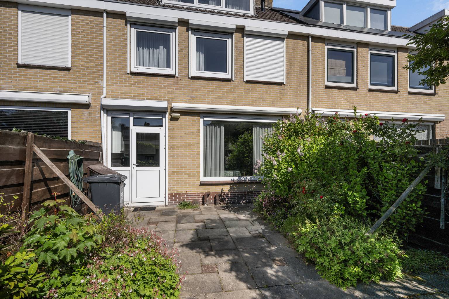 De zonnige achtertuin is fraai aangelegd met een groot diversiteit aan planten die zijn geplaatst in stenen borders. Daaromheen is de grond voorzien van bestrating en zorgen de houten schuttingen met een waterkraantje voor de nodige privacy. Er is een handige plaatst voor houtopslag en achterin de tuin is er een poort naar het achterpand, die toegang geeft tot de ruime garage die is voorzien van elektra en verlichting. Aan de gevel van de woning zijn er rolluiken geplaatst en daarboven hangt een zonnescherm.