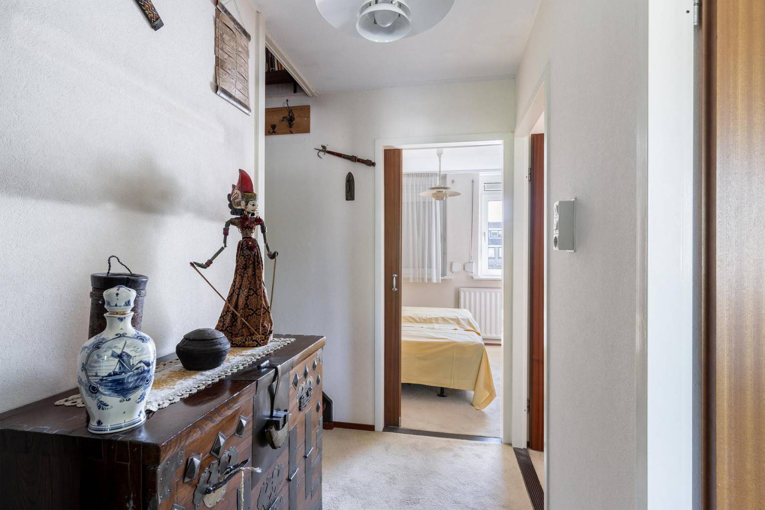 Na de afsluitbare trapopgang is er toegang tot de overloop die is voorzien van spachtelputz wanden en vloerbedekking, dat is terug te vinden in alle drie de slaapkamers. Deze zijn voorzien van vaste kasten en de twee slaapkamers aan de achterzijde zijn daarnaast extra voorzien van hand bedienbare rolluiken. Ook is er vanaf de overloop toegang tot de trap naar de 2e verdieping en de gedeeltelijk betegelde badkamer met een douche, een toilet, een wastafelmeubel en een te openen raam voor natuurlijke ventilatie.