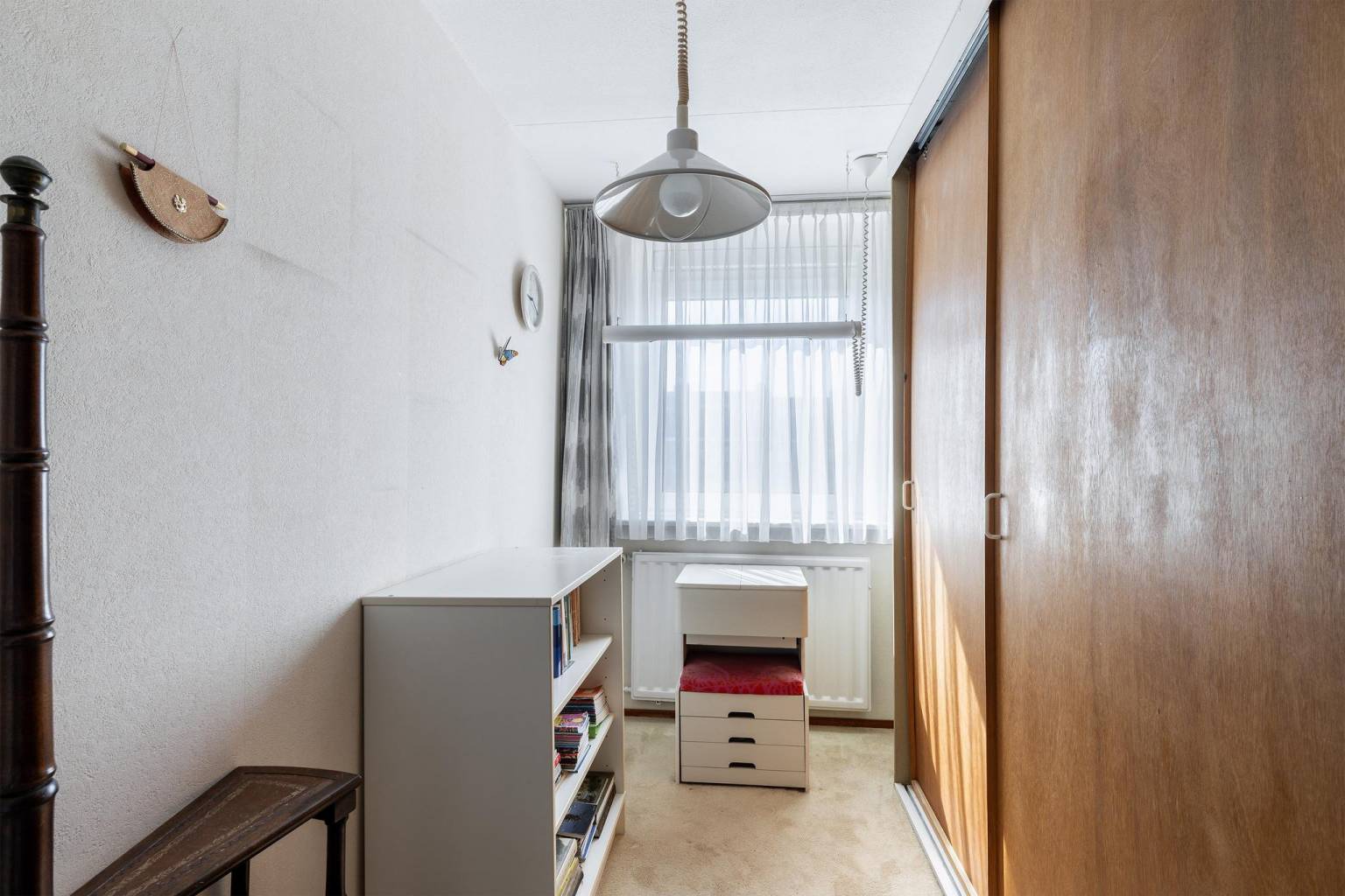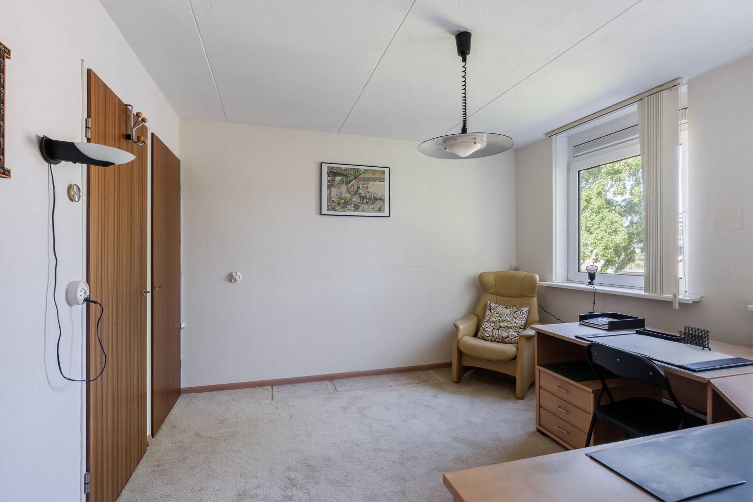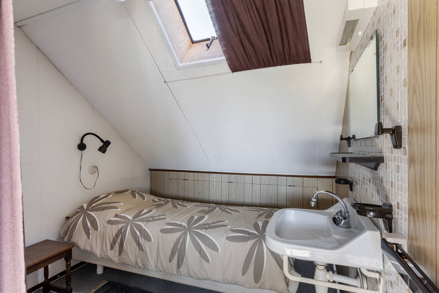 De extra slaapkamer is voorzien van een wastafel, een vaste kast en een dakraam. De vloer is voorzien van vloerbedekking en en onder de schuine kap zijn knieschotten aanwezig.