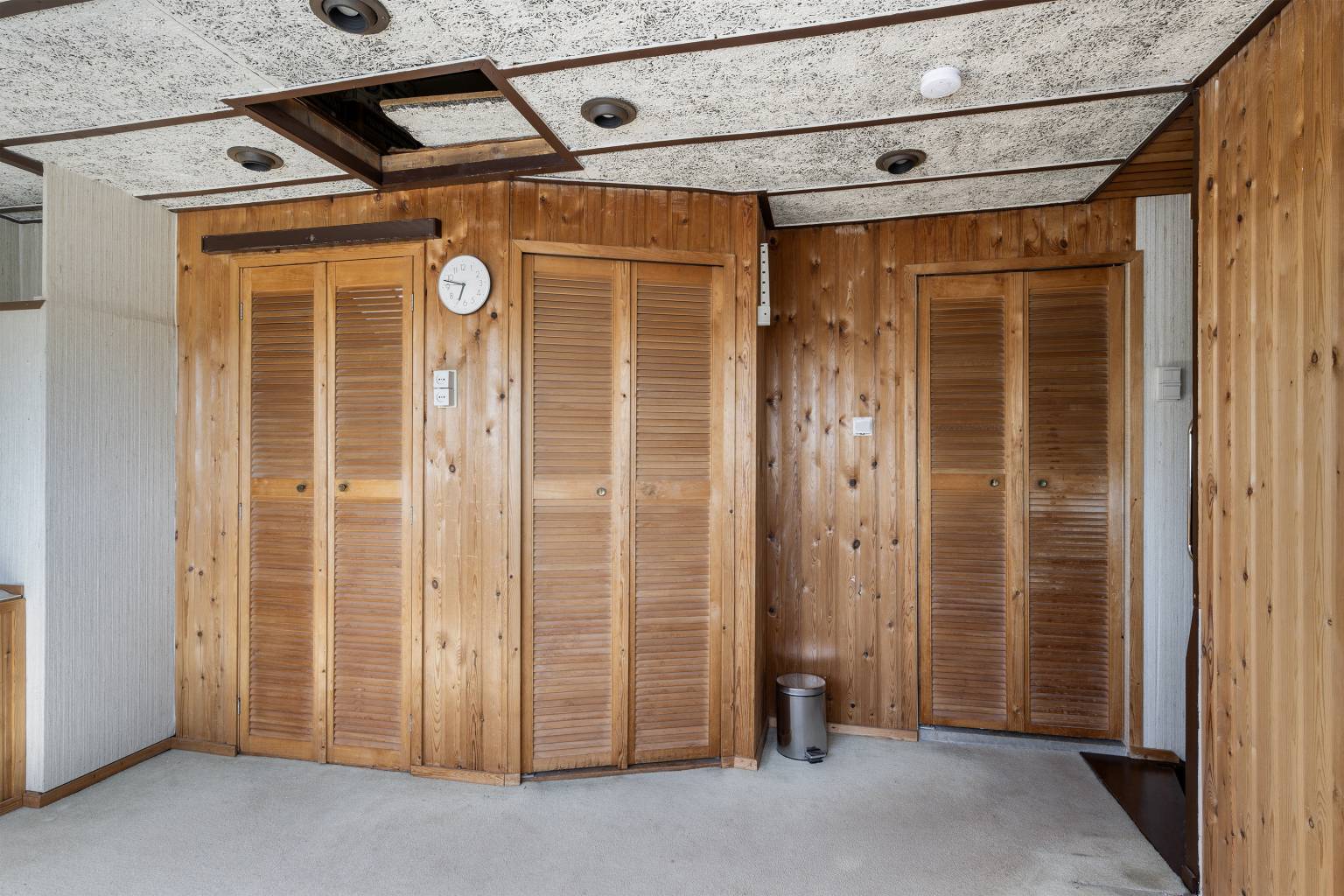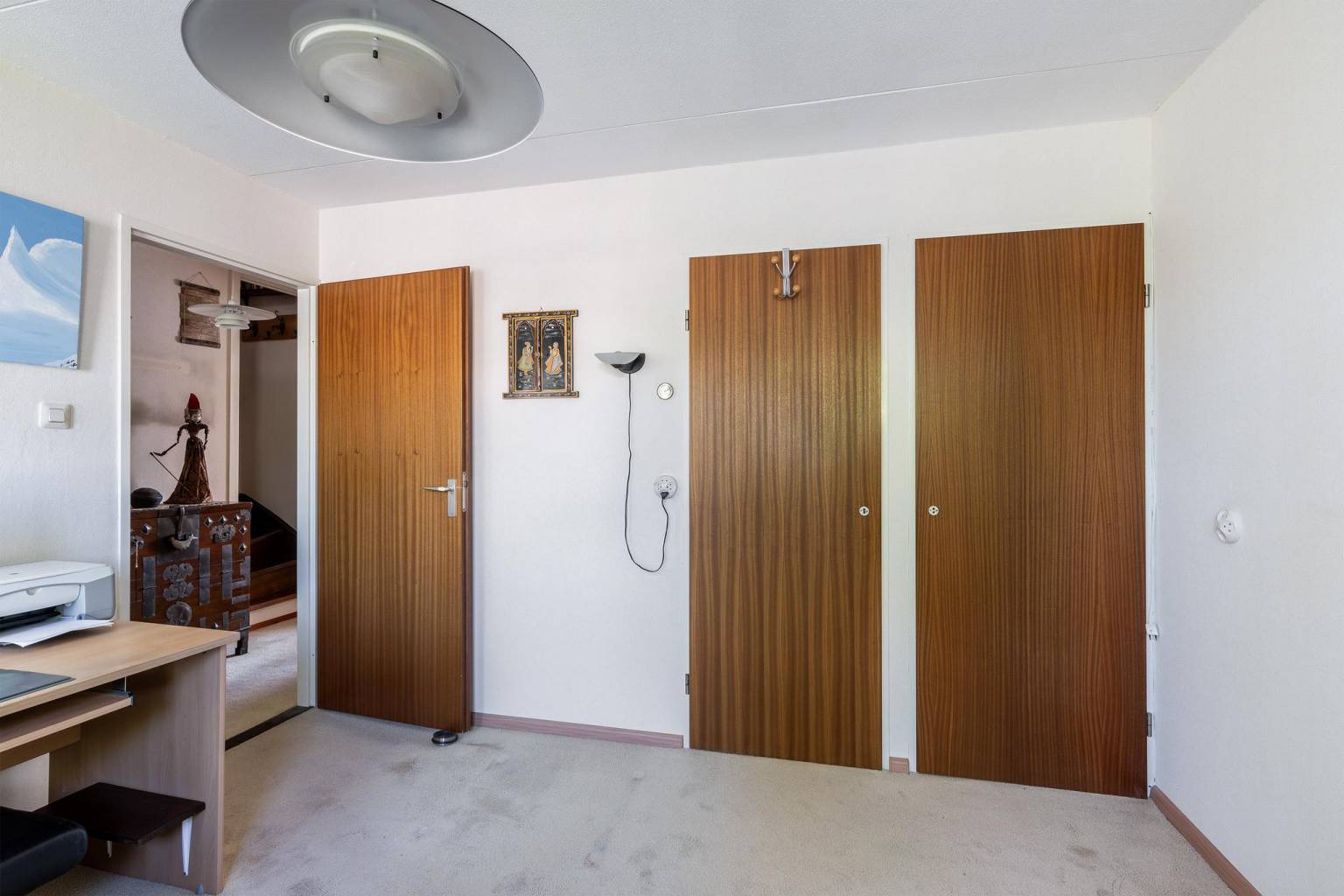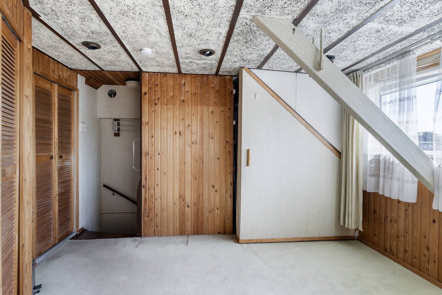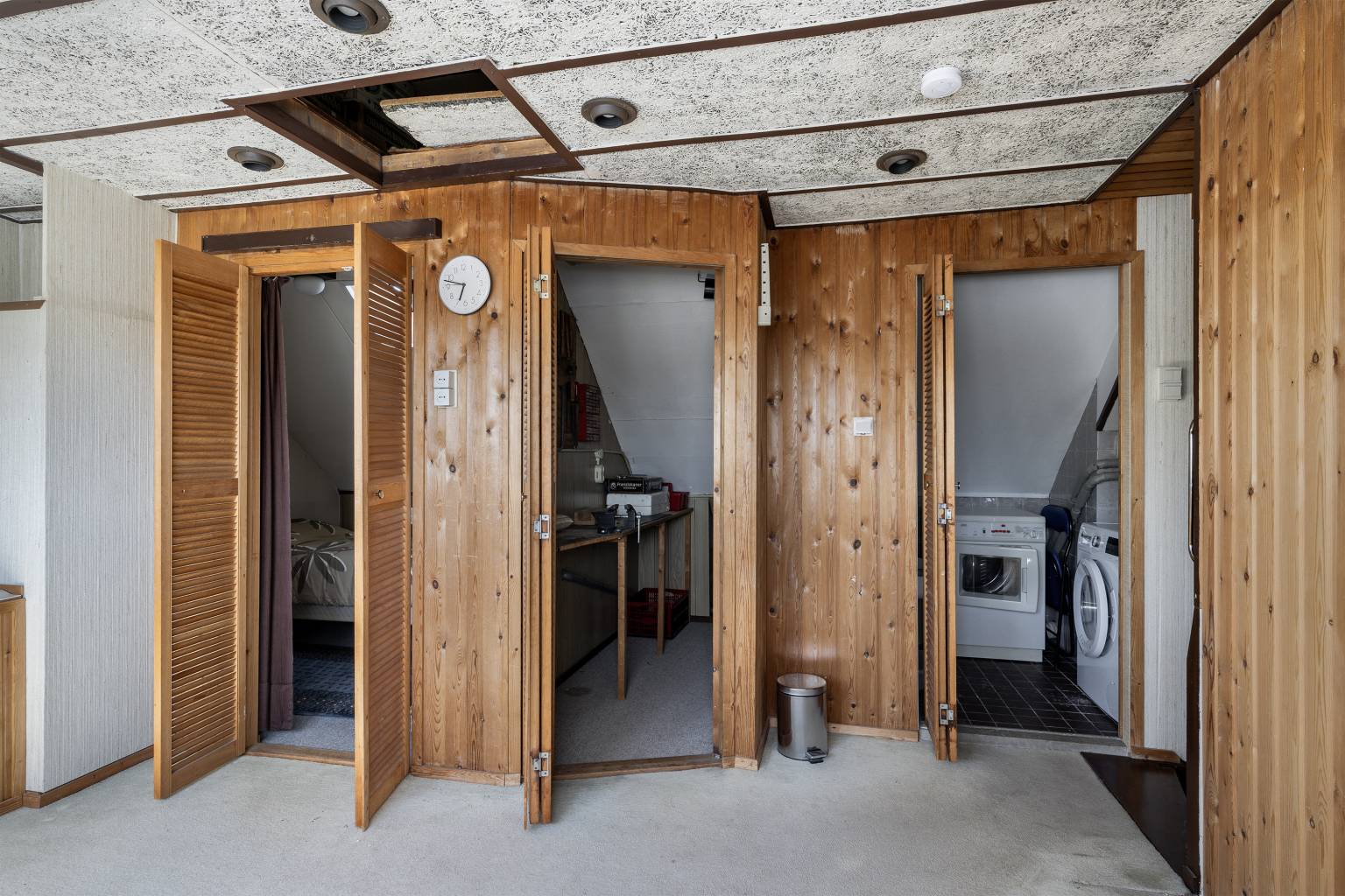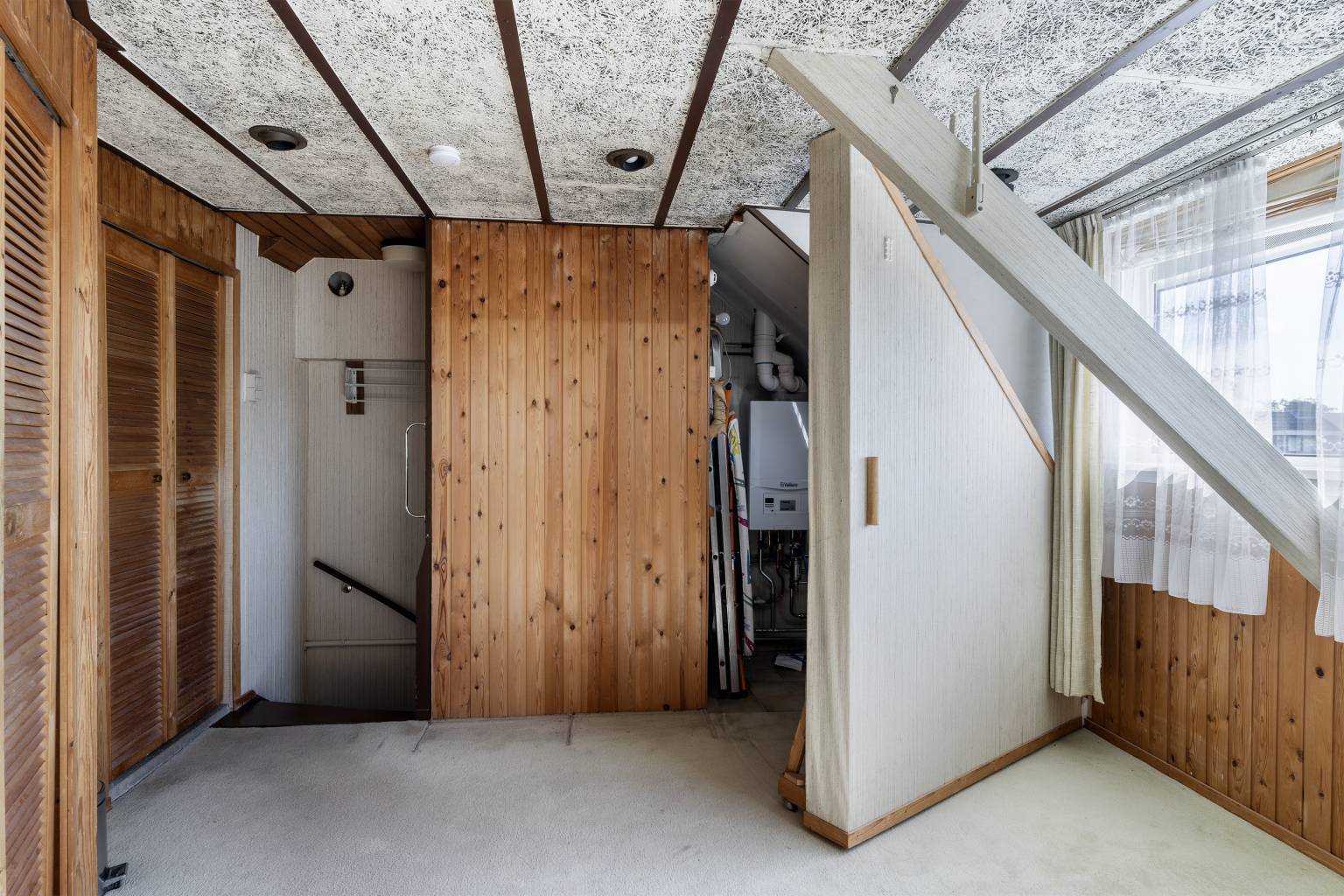 Dit is een grote ruimte met een dakkapel en de opstelling van de Cv-ketel, die netjes is weggewerkt. Op de vloer ligt vloerbedekking en de wanden zijn afgetimmerd met houten schroten. Het plafond is voorzien van inbouw spots en er is een luik naar de vliering. Vanuit deze ruimte is er middels louvredeurtjes ook toegang tot een extra slaapkamer, een werkkamer en een aparte wasruimte.