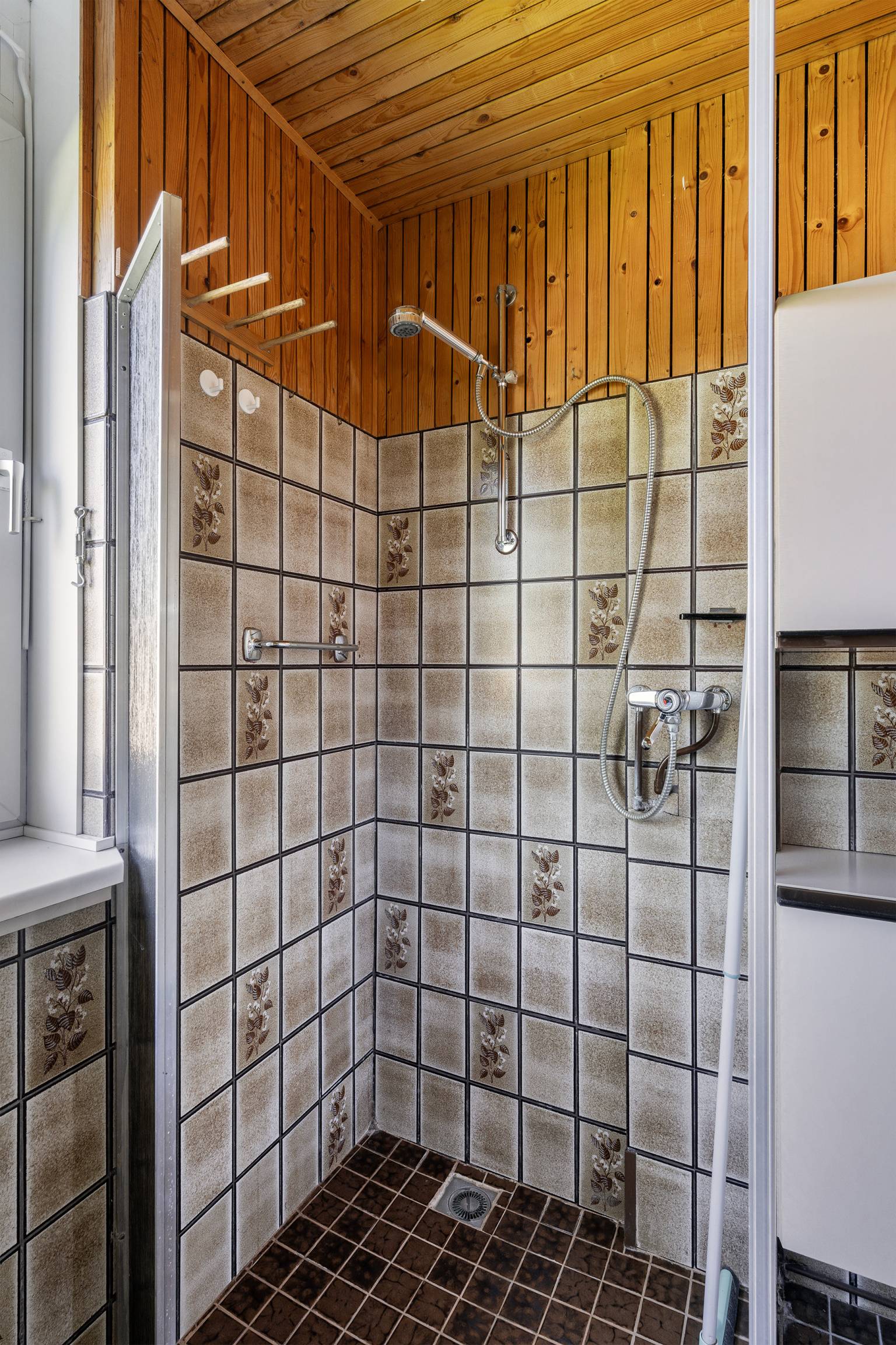 De wasruimte heeft een betegelde vloer en hier bevinden zich de aansluitingen voor de wasmachine en de droger.