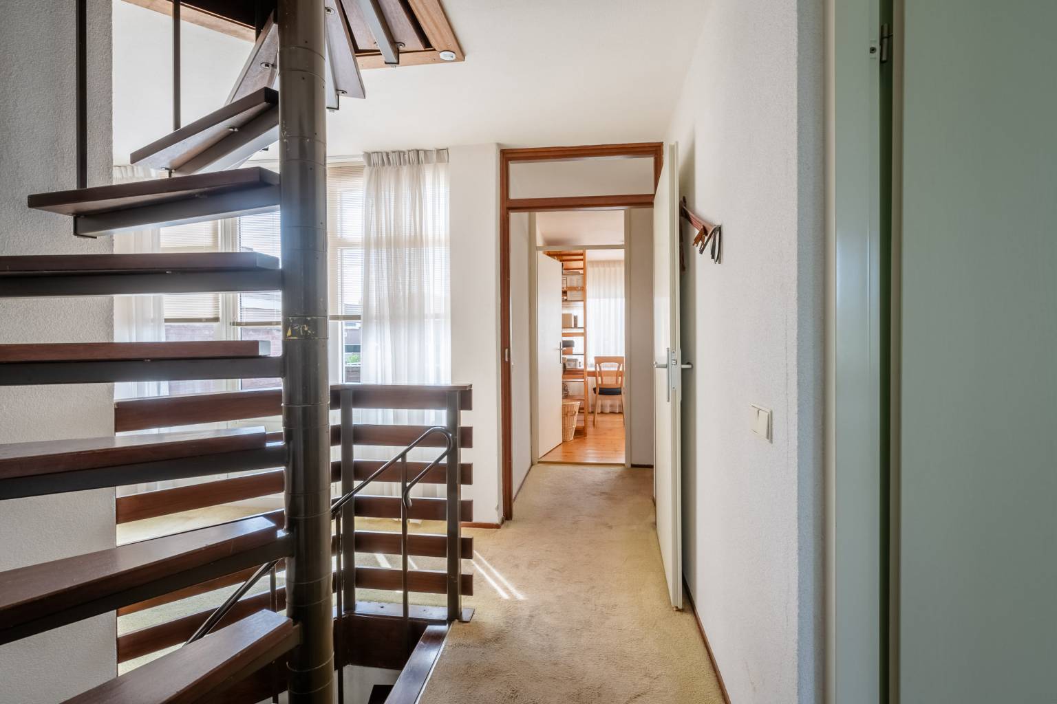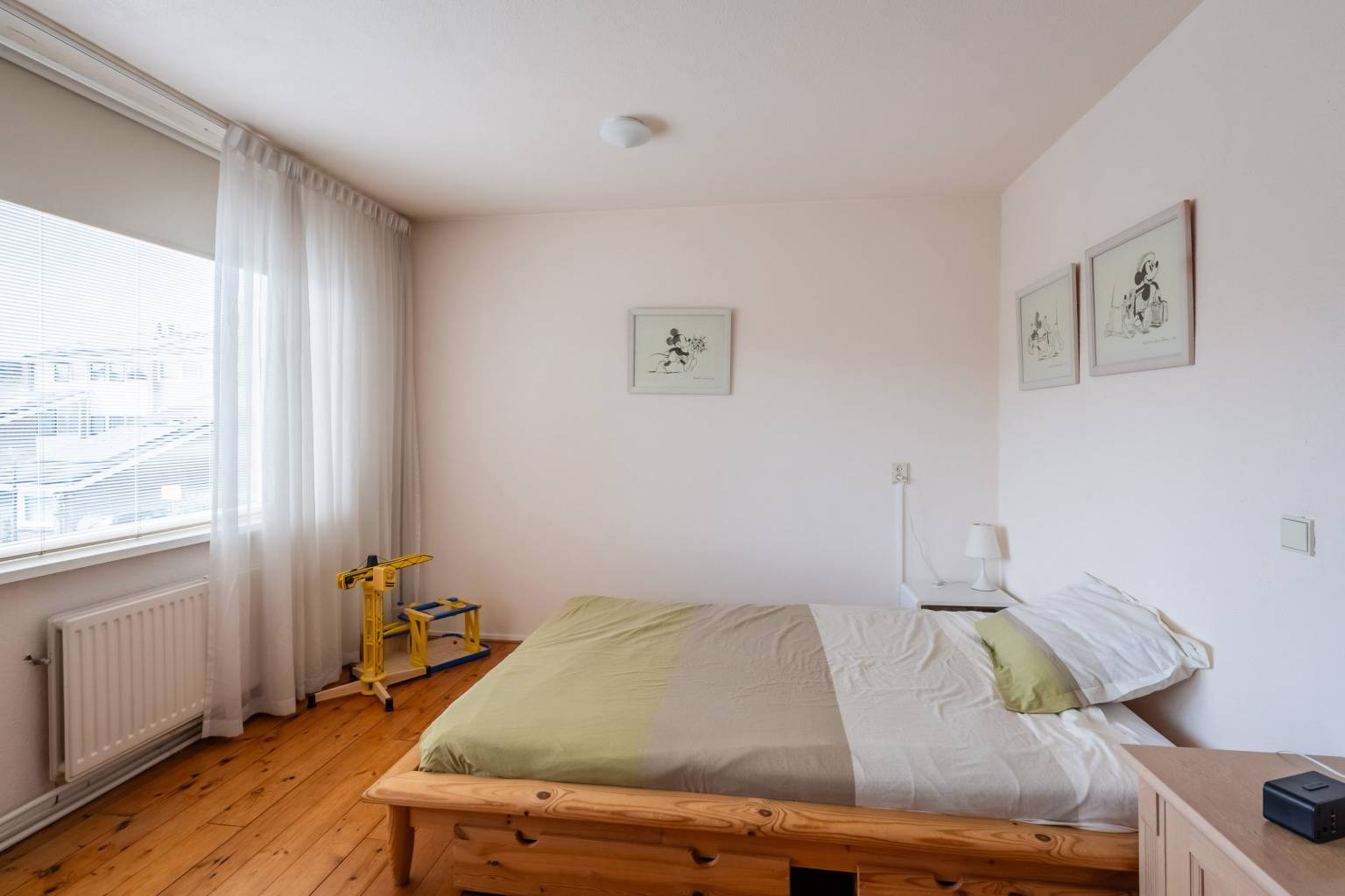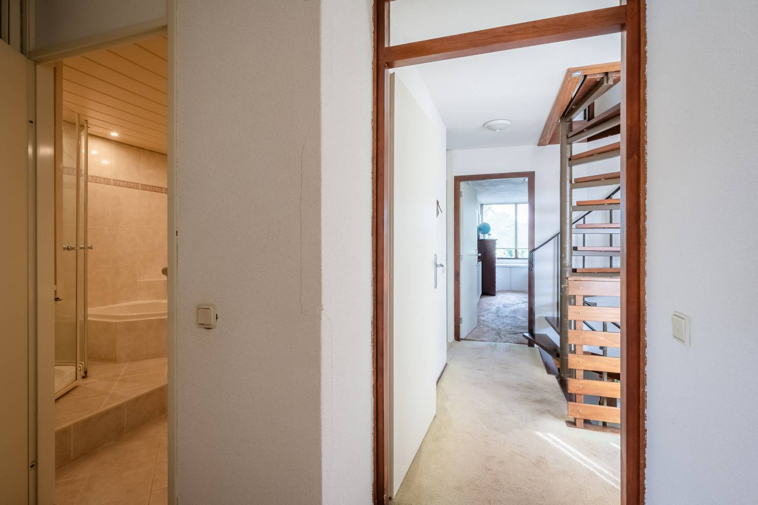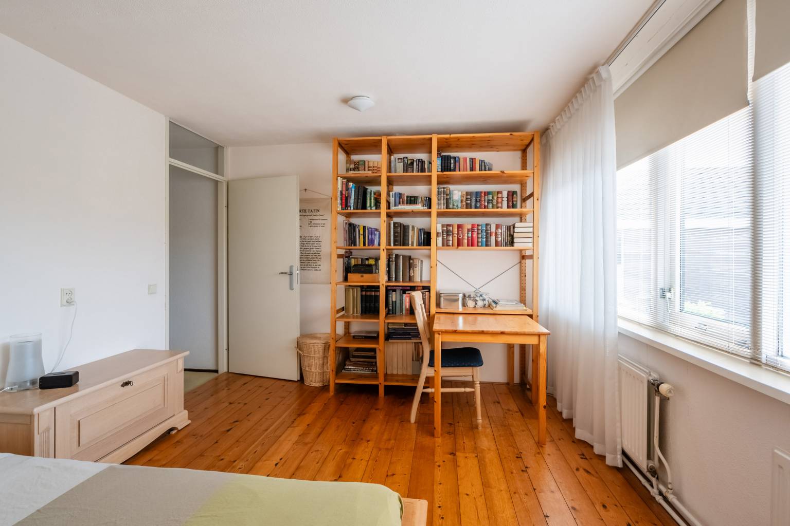De open wenteltrap in de woonkamer geeft een veelzijdige invulling van de ruimte en biedt toegang tot de overloop van de eerste verdieping. De overloop is goed bemeten en heeft plaats voor bijvoorbeeld een bureau. Zo kunt u hier bijvoorbeeld een werkplek creëren en tussentijds genieten van de frisse lucht op het terras. Verder bevinden zich op de eerste verdieping drie slaapkamers, de badkamer en een vaste kast. Eén van de slaapkamers is aan de voorzijde van de woning gelegen en biedt ruim voldoende plaats voor zowel een tweepersoonsbed als een vaste kast. Ditzelfde geldt voor de slaapkamers aan de achterzijde. Eén van deze twee is op dit moment ingericht als werkkamer en uitzonderlijk ruim te noemen. Zo wordt werken aan huis wel heel aantrekkelijk gemaakt. Natuurlijk kan deze kamer geheel naar eigen wens worden ingericht en ook dienen als bijvoorbeeld kinder-/speelkamer. Het laatste vertrek van deze verdieping is de volledig betegelde badkamer. Ook hier is een zee aan ruimte en daardoor een fijne plek om in alle rust de dag te kunnen starten en te eindigen. De badkamer is voorzien van een ligbad, een douchecabine, een wastafelmeubel met dubbele wasbak, een zwevend toilet, handdoeken radiator en mechanische ventilatie.