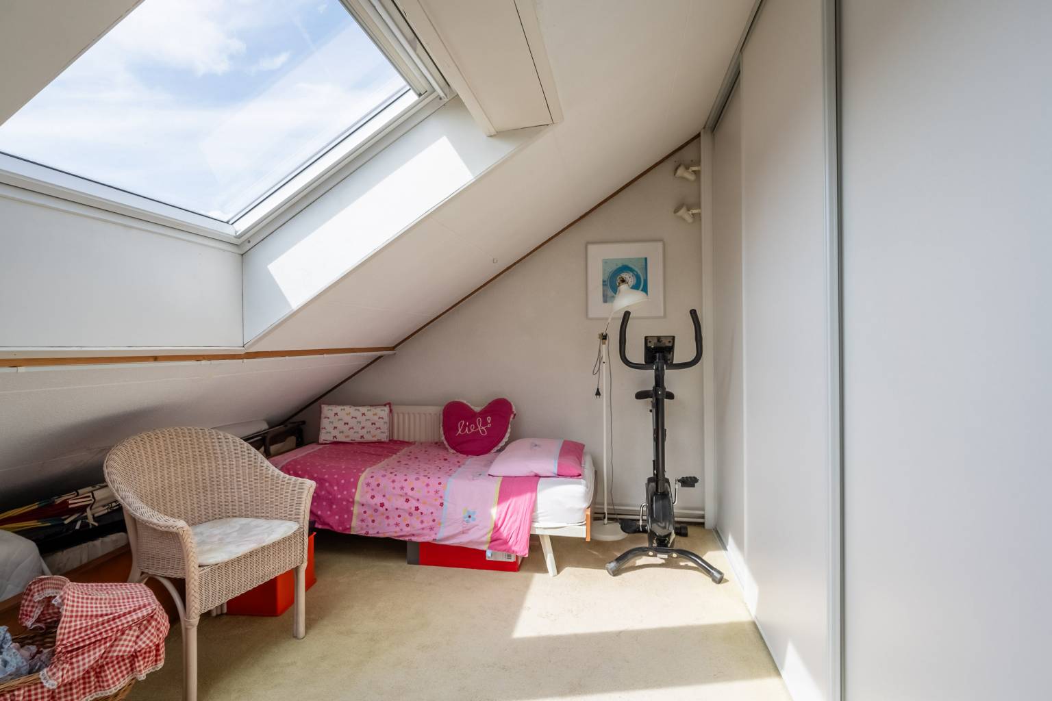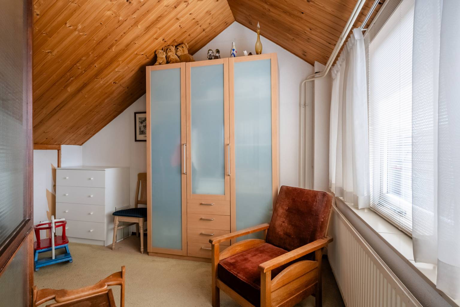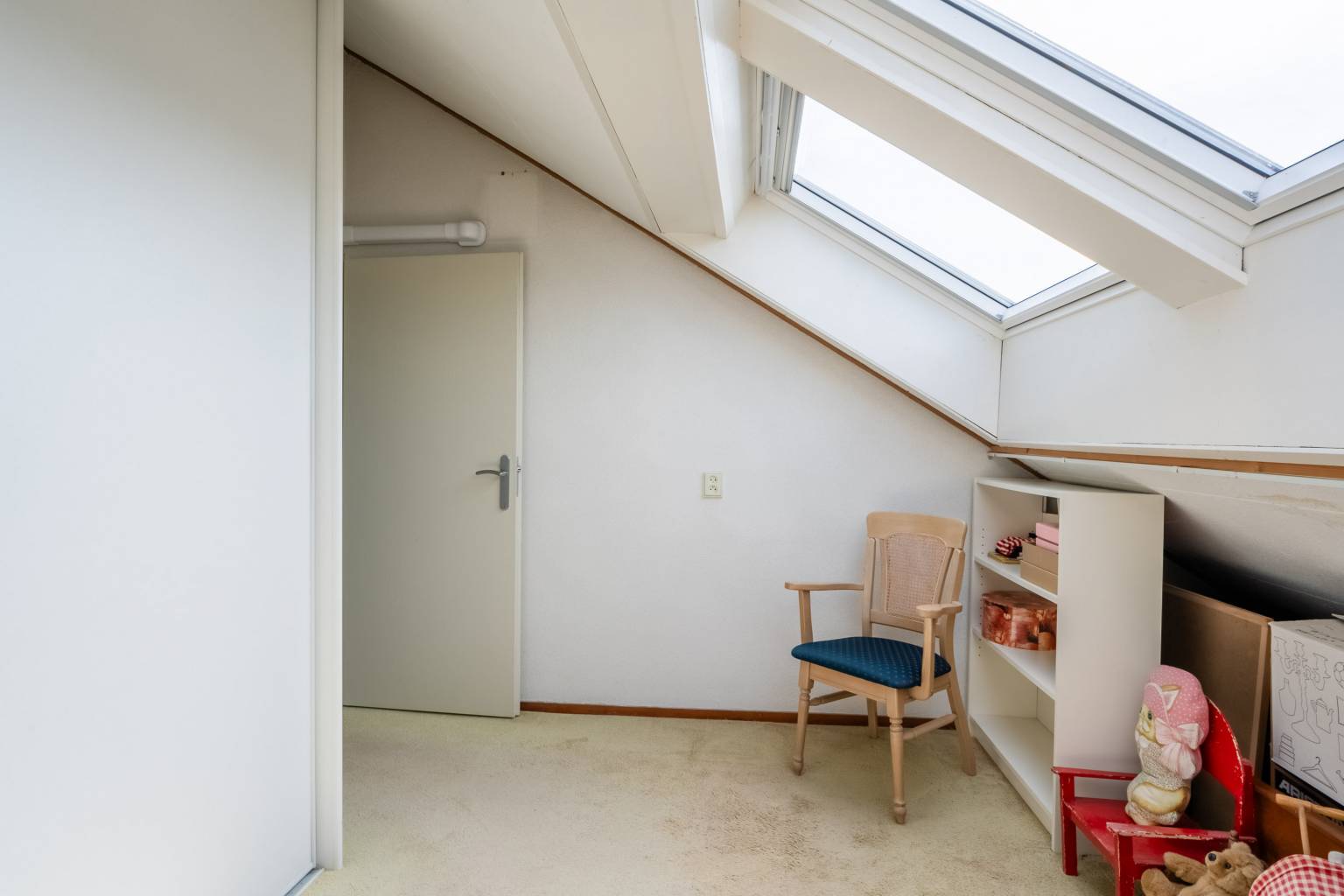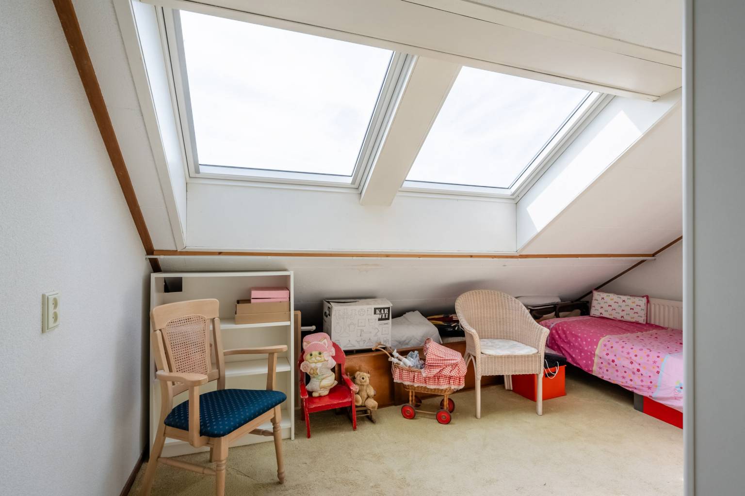 Het glas in de wanden op de tweede verdieping zorgt voor een fijne verbinding tussen de overloop en de kamer. Deze kamer is voorzien van knieschotten waar u veel spullen achter kunt opbergen. Daarnaast heeft de tweede verdieping nog twee slaapkamers en een vaste kast met de opstelling van de cv-ketel en de warmtepomp. Boven de hal naar deze slaapkamer is er nog een vliering met extra bergruimte. De slaapkamers bevinden zich aan weerszijde van elkaar en beschikken allebei over VELUX-dakramen.
