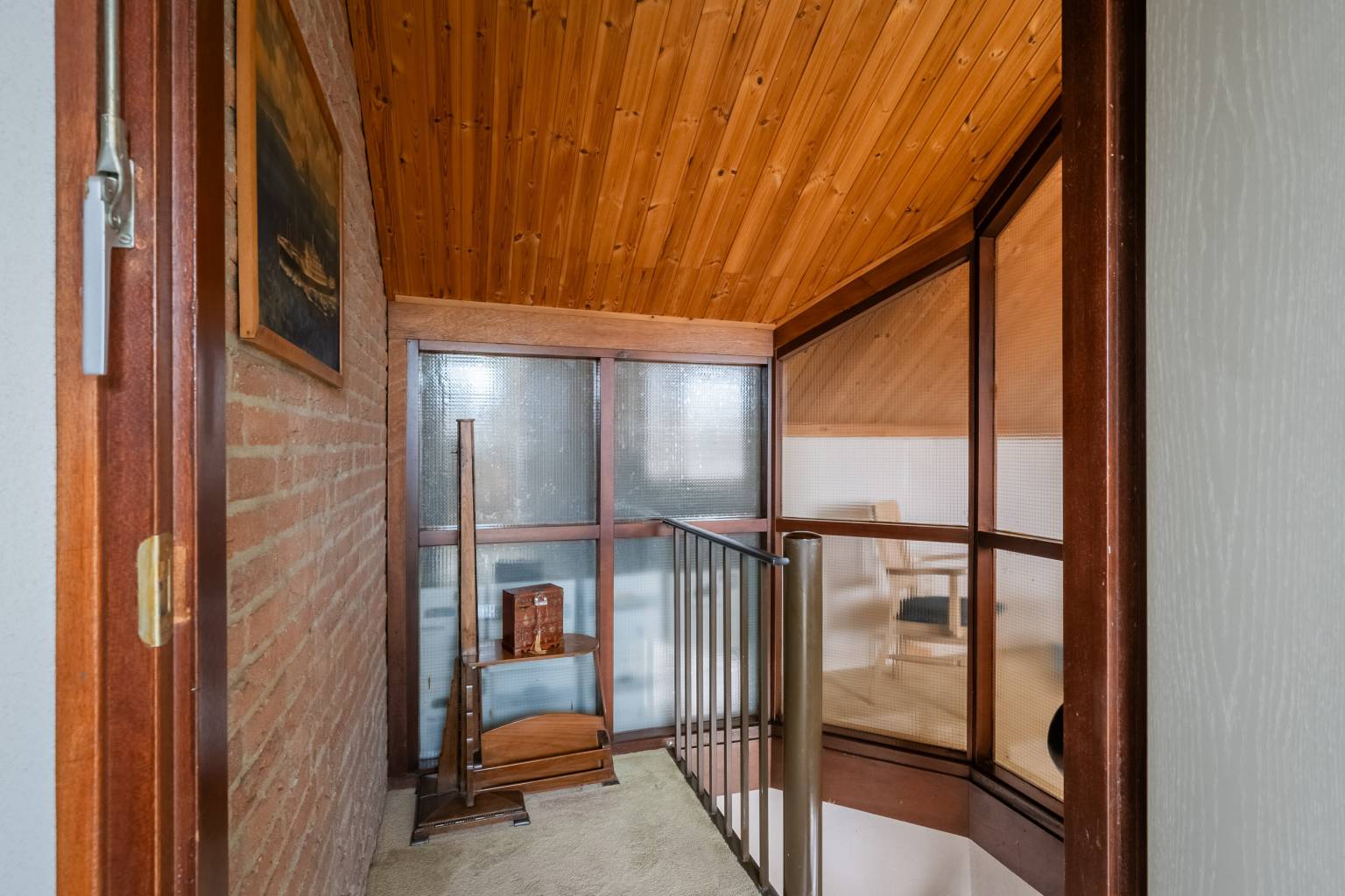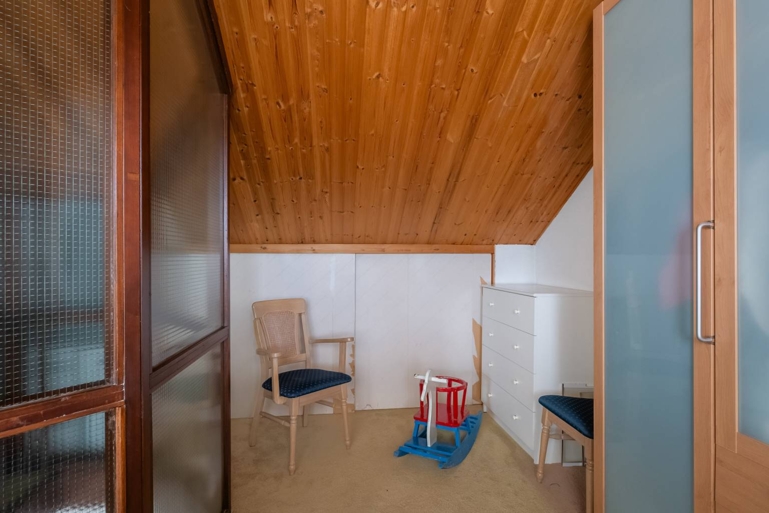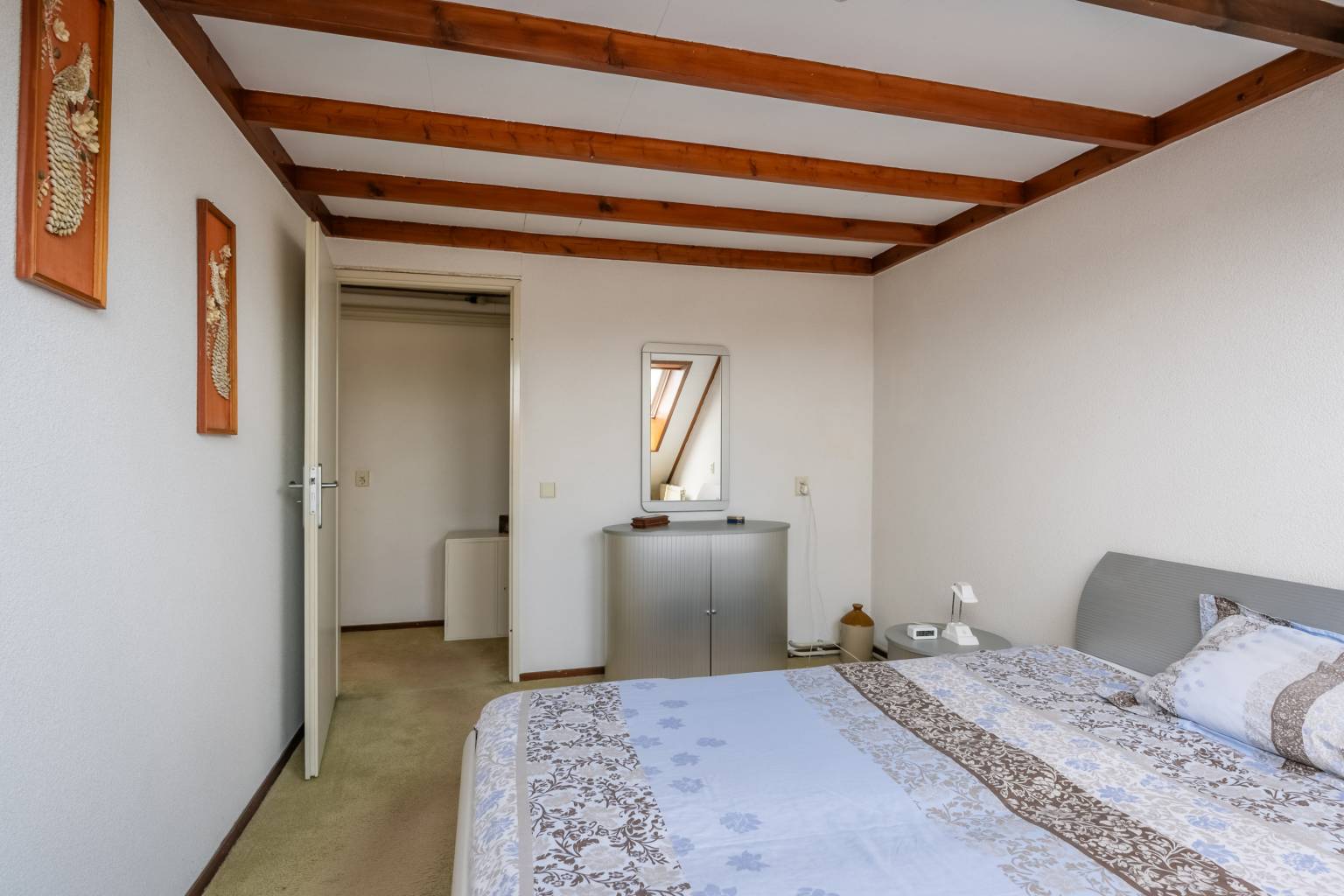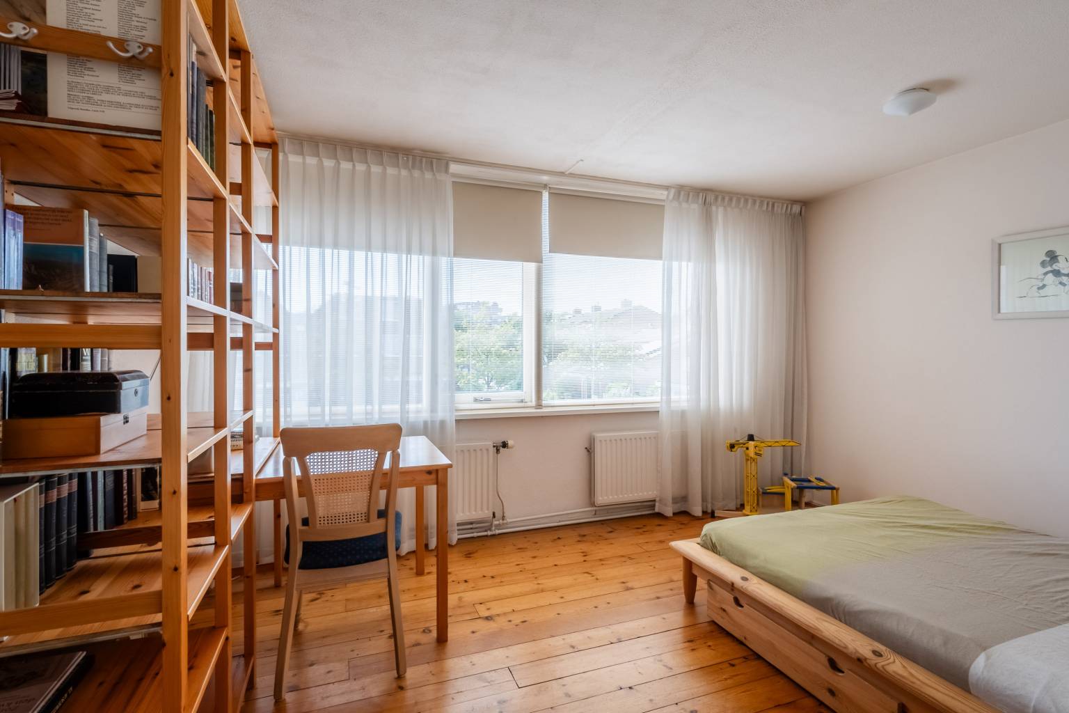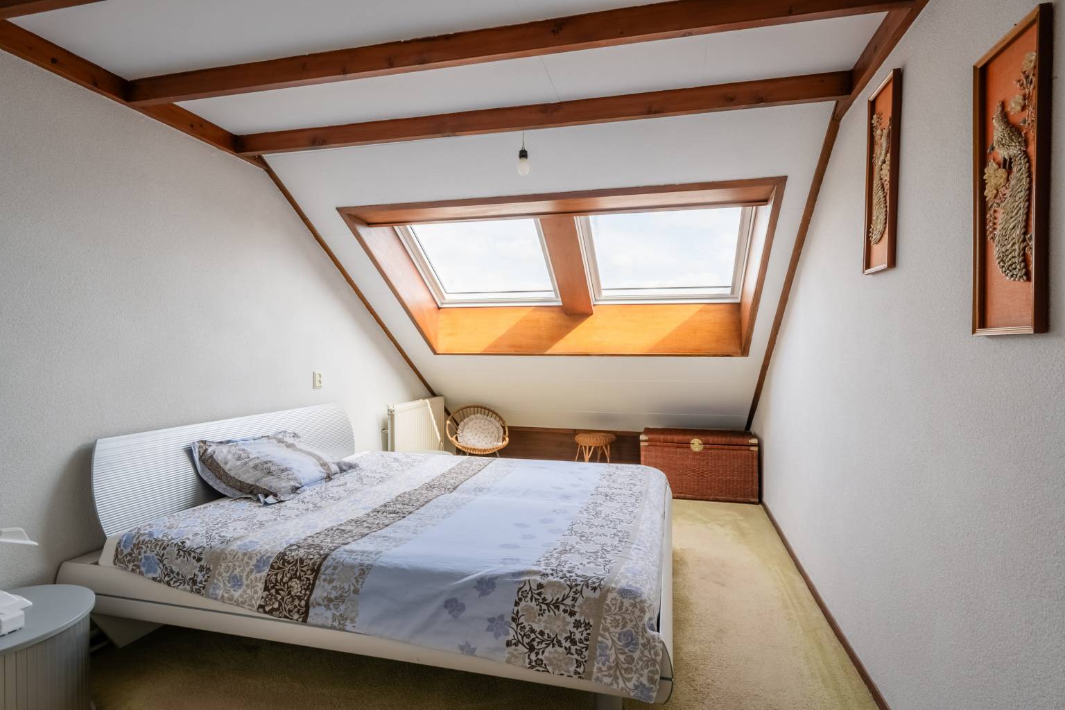 Het glas in de wanden op de tweede verdieping zorgt voor een fijne verbinding tussen de overloop en de kamer. Deze kamer is voorzien van knieschotten waar u veel spullen achter kunt opbergen. Daarnaast heeft de tweede verdieping nog twee slaapkamers en een vaste kast met de opstelling van de cv-ketel en de warmtepomp. Boven de hal naar deze slaapkamer is er nog een vliering met extra bergruimte. De slaapkamers bevinden zich aan weerszijde van elkaar en beschikken allebei over VELUX-dakramen.