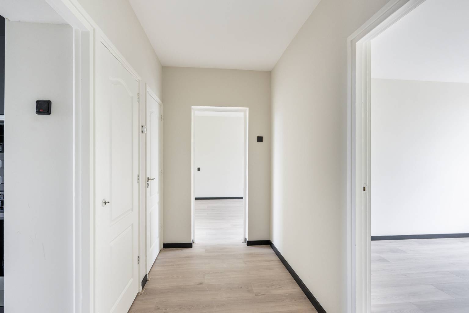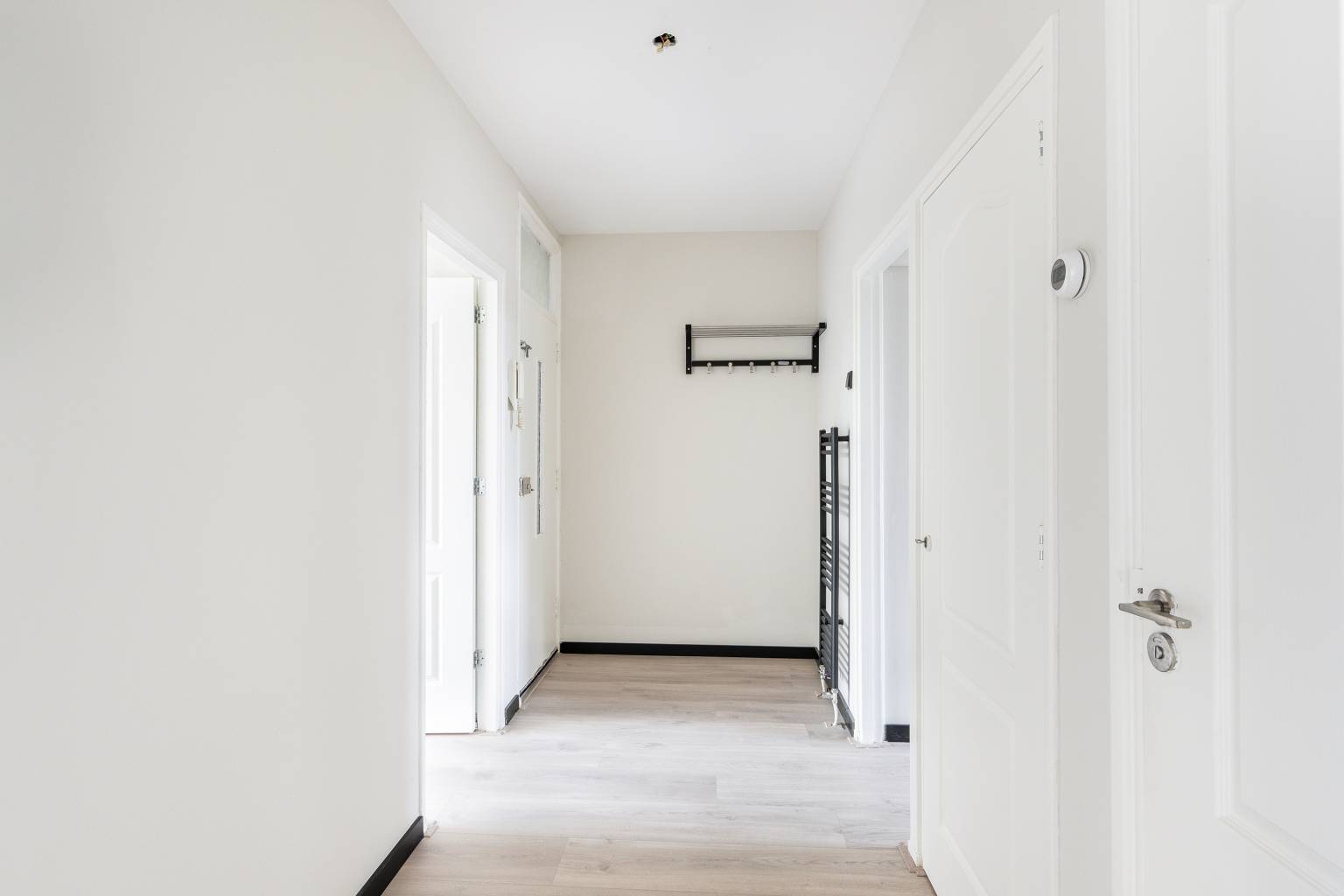 Na de voordeur is er toegang tot de hal. Deze is voorzien van glad afgewerkte wanden en een lichte laminaatvloer die is terug te vinden in het gehele appartement. In de hal bevindt zich de meterkast en is er toegang tot het toilet, de keuken, de eerste slaapkamer en de woonkamer.
