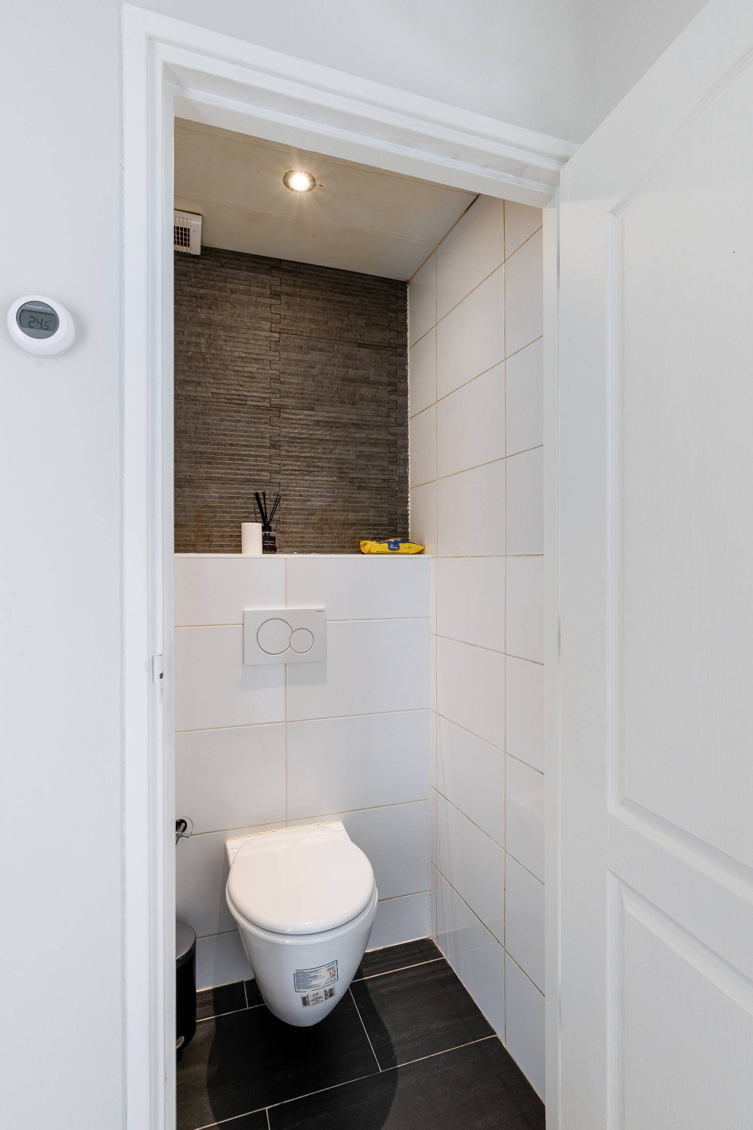 Het volledig betegelde toilet is voorzien van een zwevend toilet en heeft in het plafond een inbouw spot en een afzuigpunt.