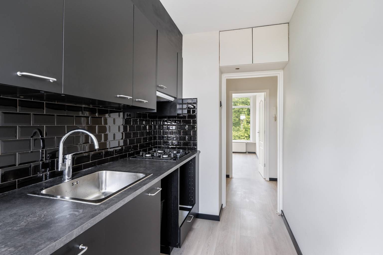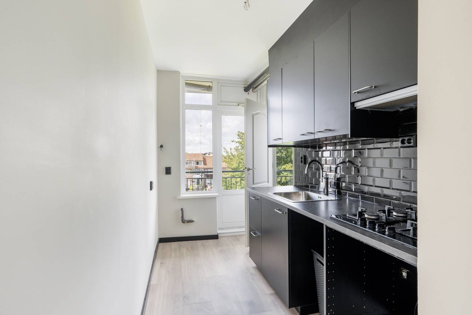 De keuken is gelegen aan de achterzijde en is uitgerust met een recht keukenblok. Deze is uitgevoerd in een donkere teint en heeft een betegelde achterwand en bovenkasten. In het aanrechtblad bevindt zich een spoelbak met een kraan en een 4-pits gaskookplaat met daarboven een afzuigkap, die is geïntegreerd in een bovenkast. Boven de open toegang vanuit de hal is een kast met deurtjes gemaakt en daarin zit een inbouw spot. Er is een aansluiting voor de wasmachine en vanuit de keuken is er toegang tot het balkon en de badkamer.