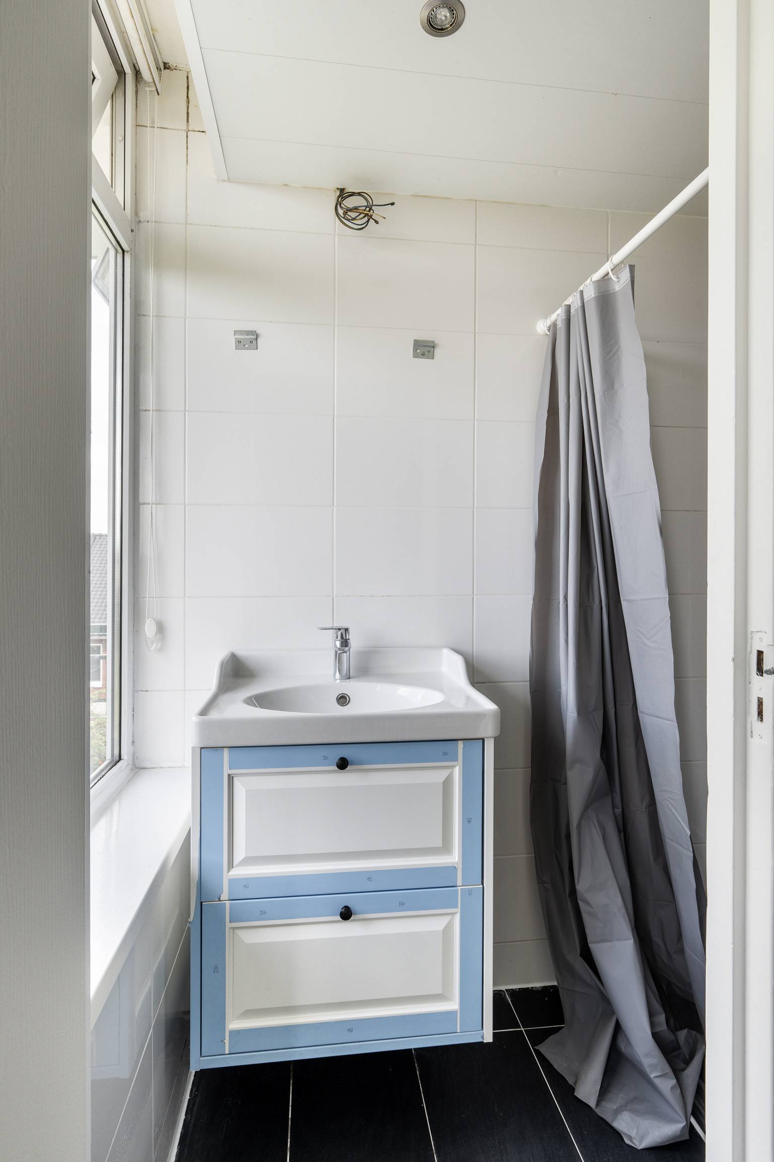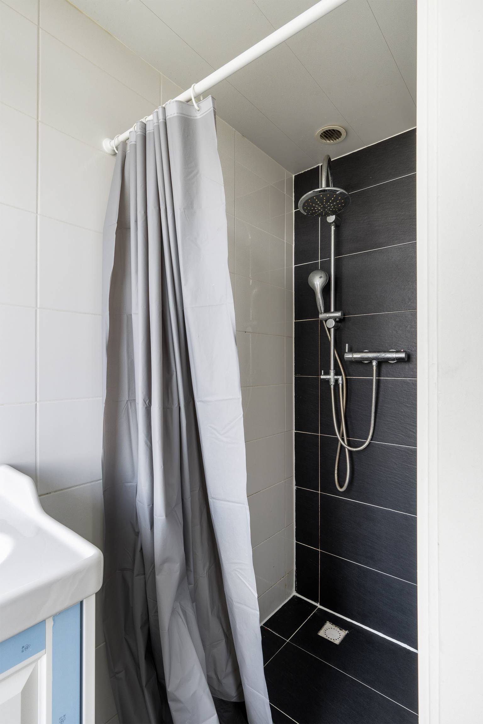 De praktische badkamer is volledig betegeld en voorzien van een douche en een wastafelmeubel. In het plafond is een inbouw spot en een afzuigpunt verwerkt en er is een raam met daarboven een klepraampje voor natuurlijke ventilatie.