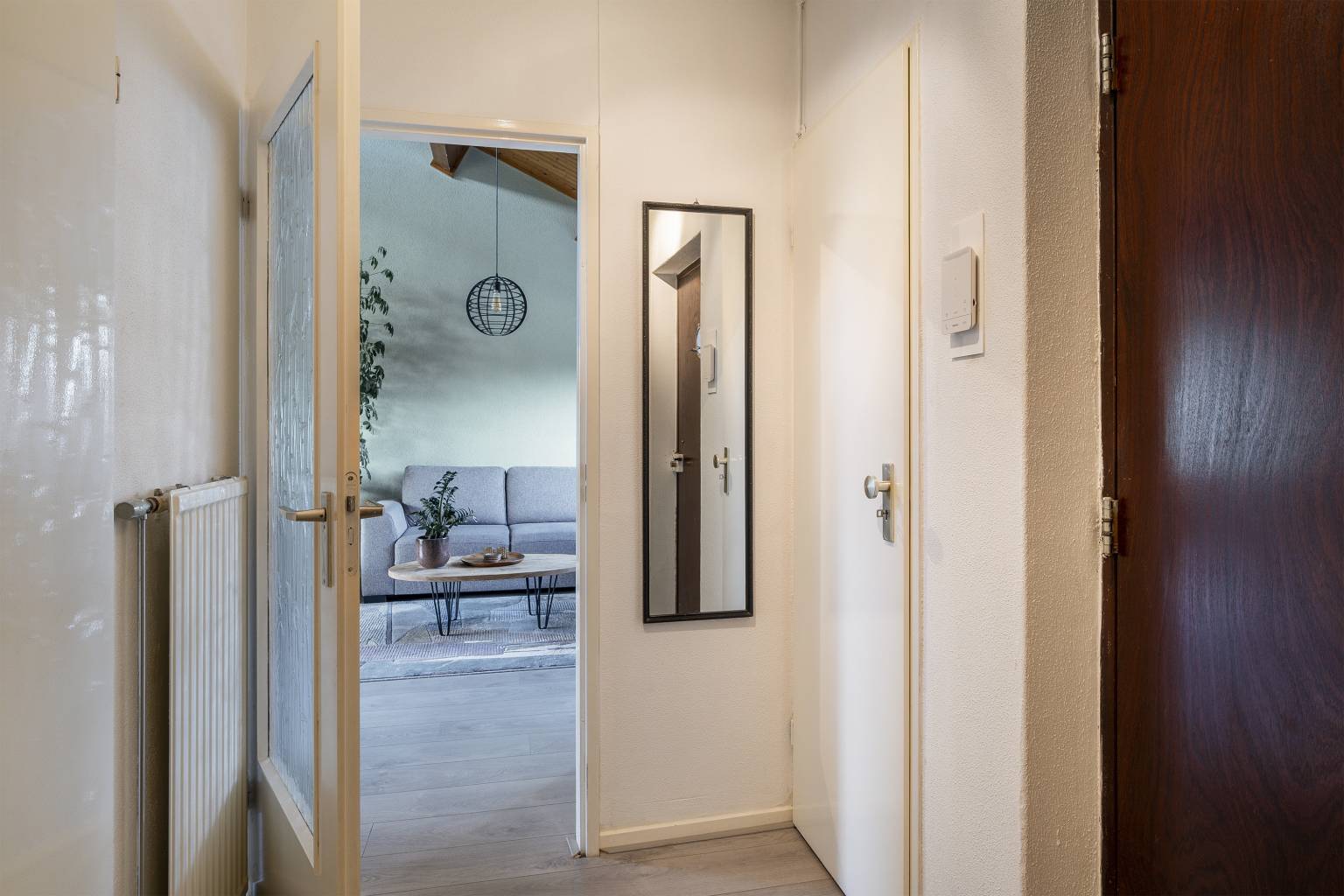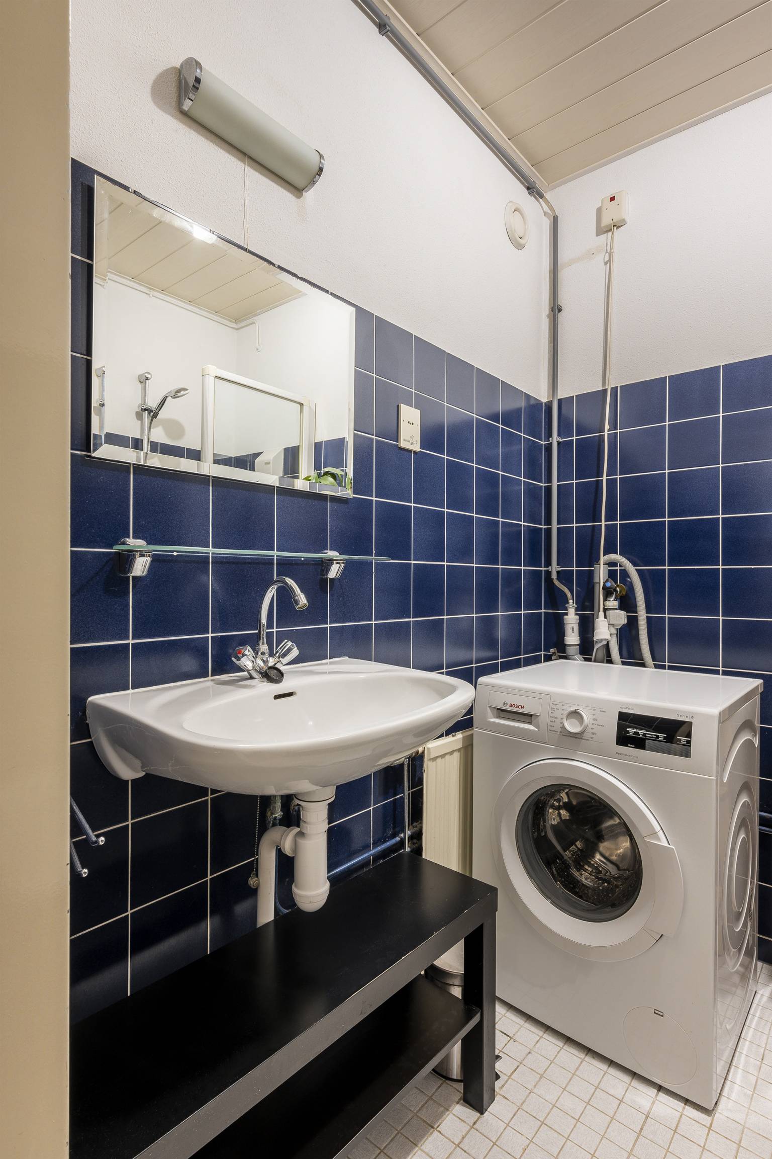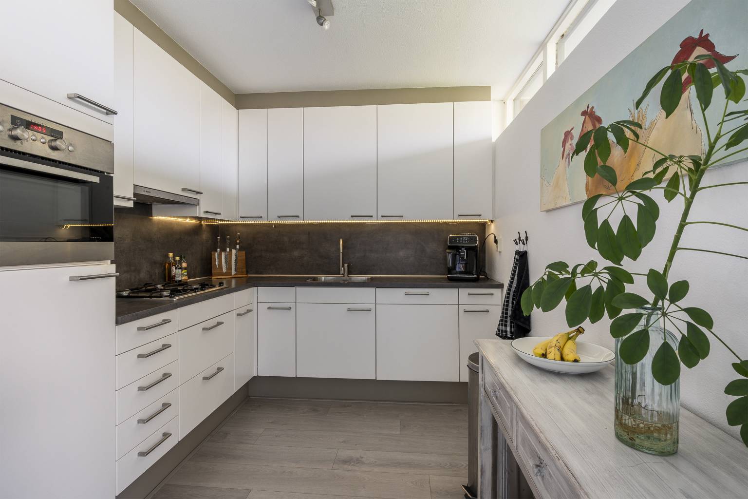 De entreehal beschikt over een garderobe, meterkast, vaste kast met cv-opstelling en aparte toiletruimte. De aparte toiletruimte is grotendeels betegeld en voorzien van een toilet en fonteintje. In dezelfde stijl als de aparte toiletruimte is de badkamer afgewerkt. De badkamer beschikt over een douchebad, wastafel en een wasmachineaansluiting. Aan het einde van de entreehal is er toegang tot de woonkamer. Bij het betreden van de woonkamer komt u terecht in een fijne en lichte ruimte. Door de vide oogt het ruimtelijk en kunt u optimaal genieten van ultiem woongenot. De woonkamer beschikt over een nette laminaat vloer en biedt toegang tot de keuken en het balkon. De L-vormige keuken is voorzien van voldoende kastruimte en benodigde keukenapparatuur zoals een 4-pits gaskookplaat, vaatwasmachine, combi-oven en koelkast met vriesvak.