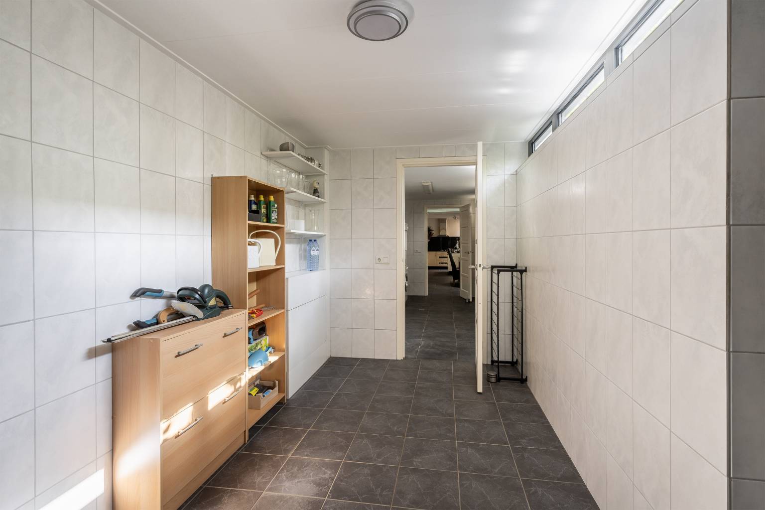 De bijkeuken is volledig betegeld en beschikt over een handig afvoerputje. In deze ruimte bevindt zich de aansluiting voor de wasmachine en droger en daarnaast hangt er een stenen spoelbak met een waterkraan. Vanuit de bijkeuken is er ook een deur naar de tuin en in het verlengde is er een deur naar de aangrenzende berging. Deze beschikt over een eigen toegang naar de tuin en is nu ook voorzien van een deur naar de loods. De wanden zijn volledig betegeld en de verdeler van de vloerverwarming is netjes weggewerkt.