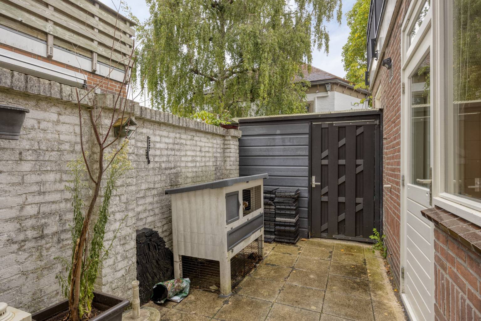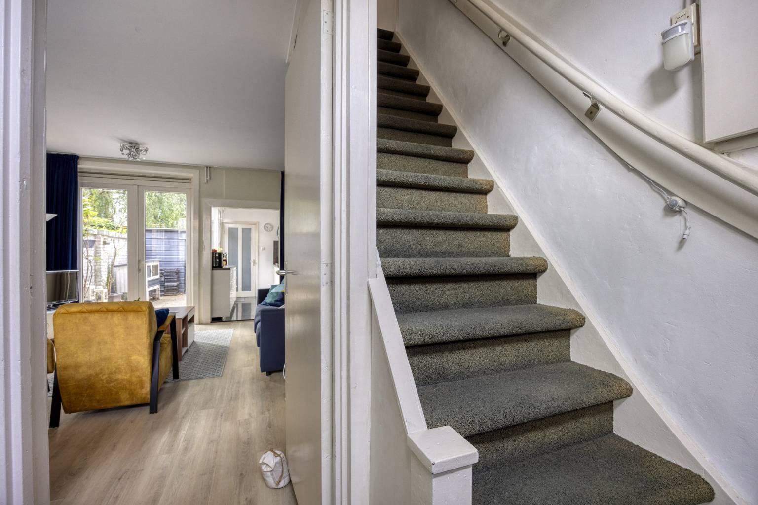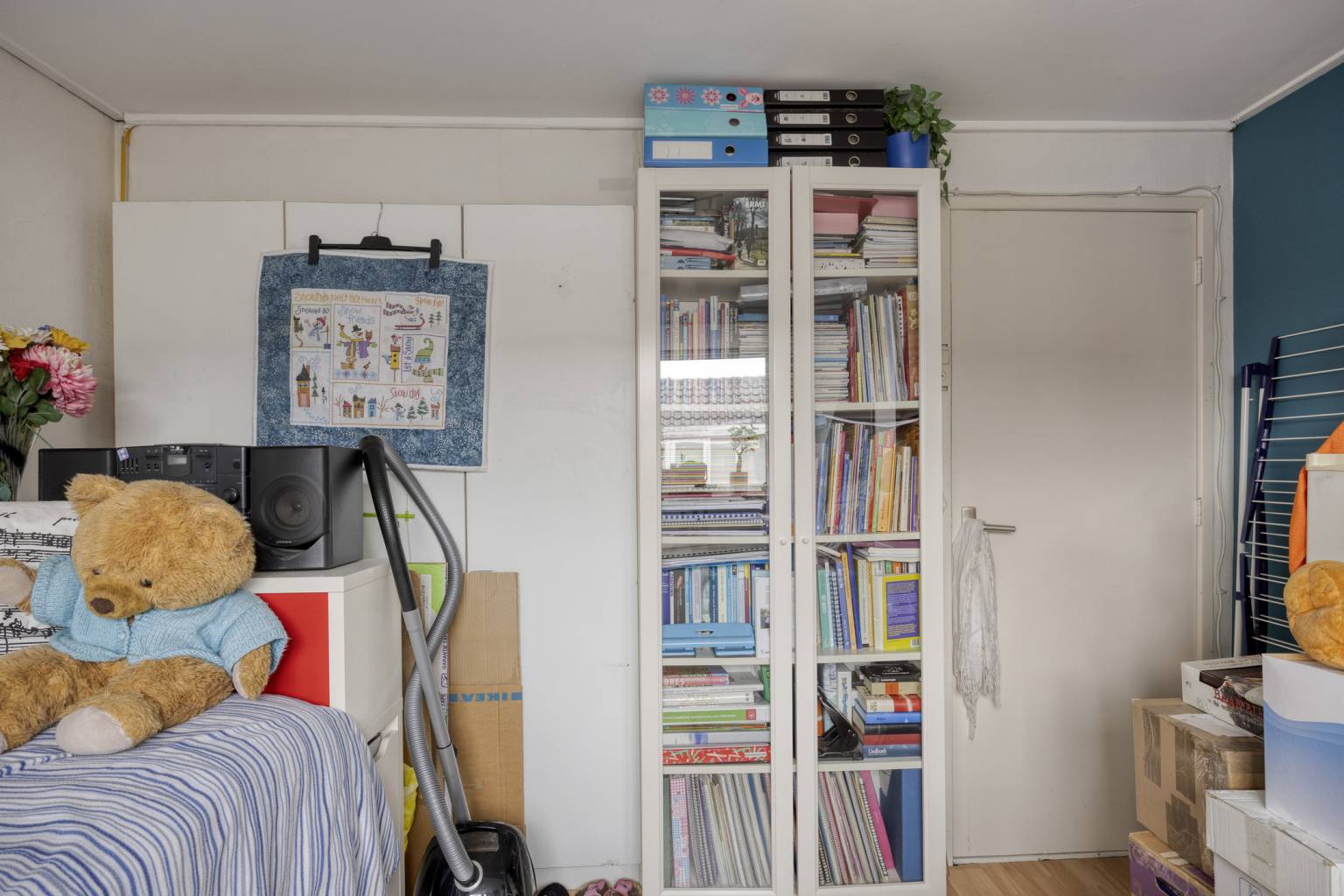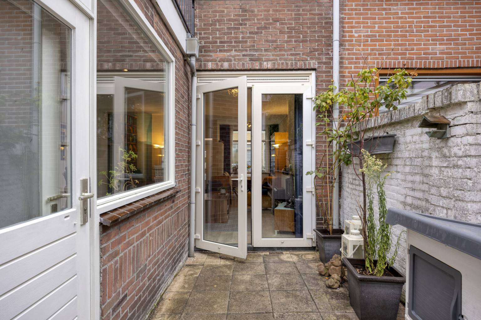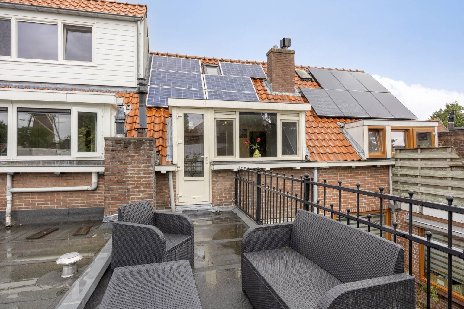 De woning beschikt over twee buitenruimtes: een stadse patio en een gezellig dakterras. De patio aan de achterzijde is compleet in het hard aangelegd en biedt toegang tot de berging met achterom. Het is een fijne plek voor een compacte zithoek of een groene aankleding met plantenbakken. Het dakterras is echter de kers op de taart: ruim opgezet, zonnig en met uitzicht over de omgeving. Hier creëer je eenvoudig een relaxhoek om te ontsnappen aan de drukte van de dag.