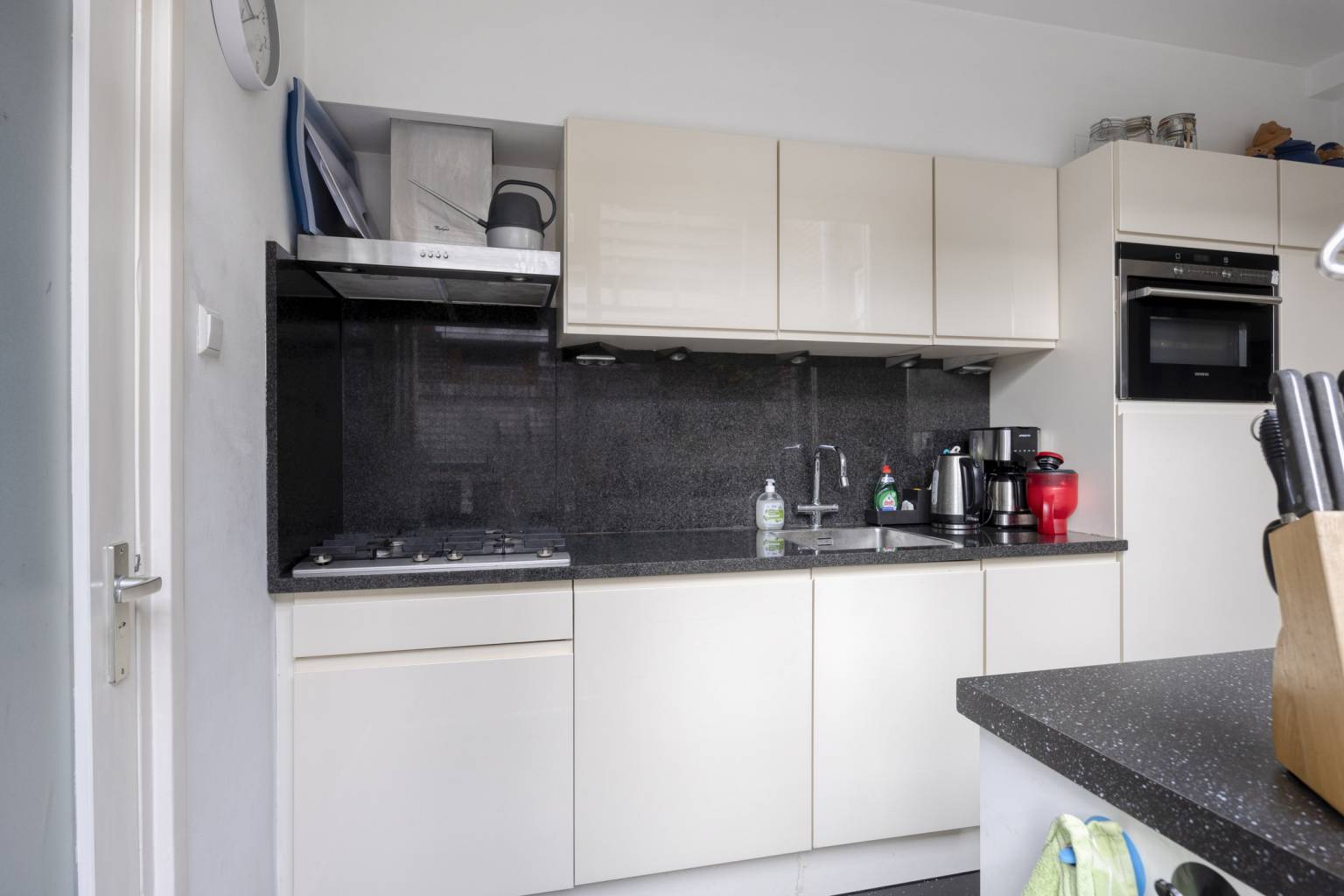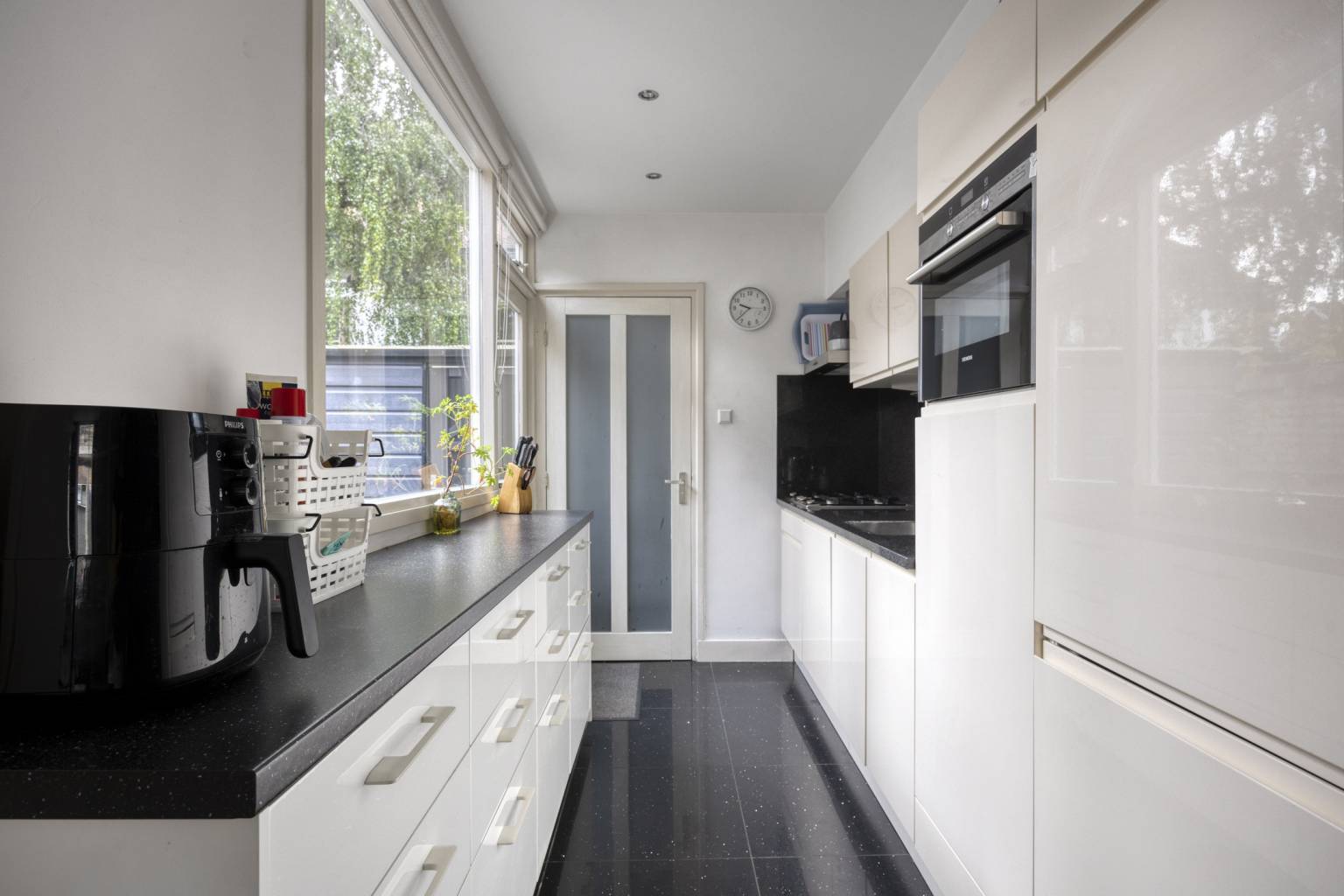 Bij binnenkomst stap je de hal in die toegang geeft tot de trapopgang en de woonkamer. De uitgebouwde leefruimte voelt licht en uitnodigend, mede door grote raampartijen aan de voorzijde en openslaande tuindeuren aan de achterzijde. Er is ruimte genoeg voor zowel een gezellige zithoek als een royale eettafel. Aangrenzend ligt de semi-open keuken; strak uitgevoerd met lichte fronten, een donker werkblad en ingebouwde apparatuur zoals een gaskookplaat, afzuigkap, combi-oven, koel- en vrieskast en een vaatwasser.