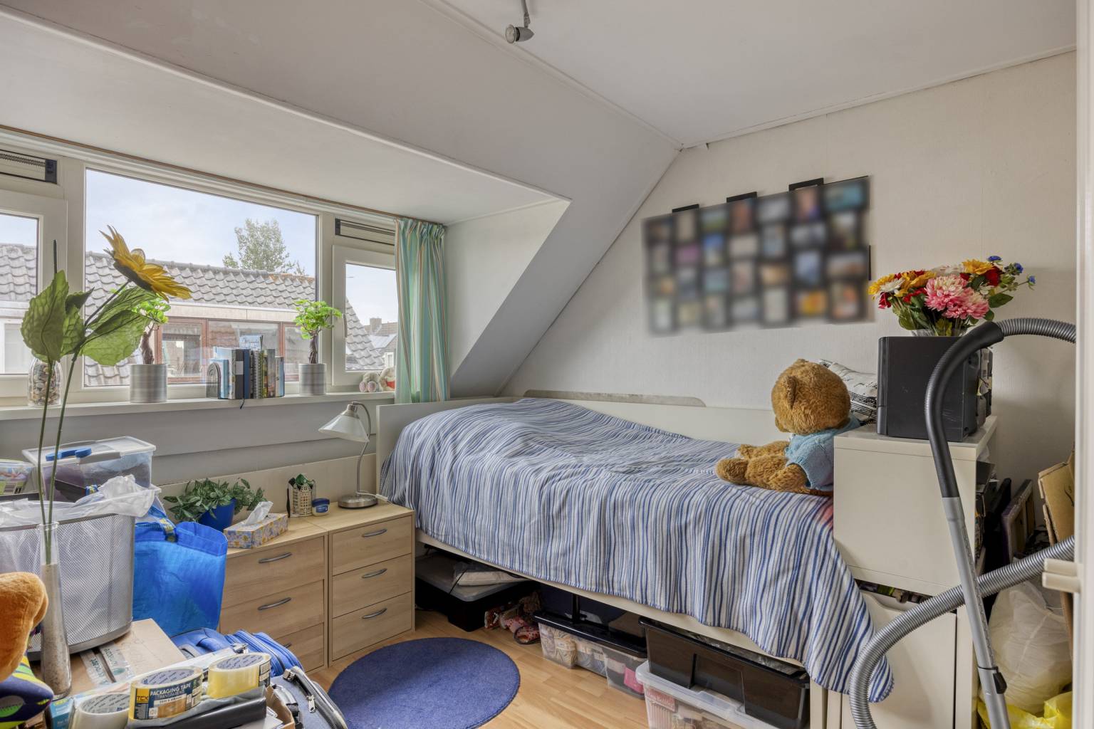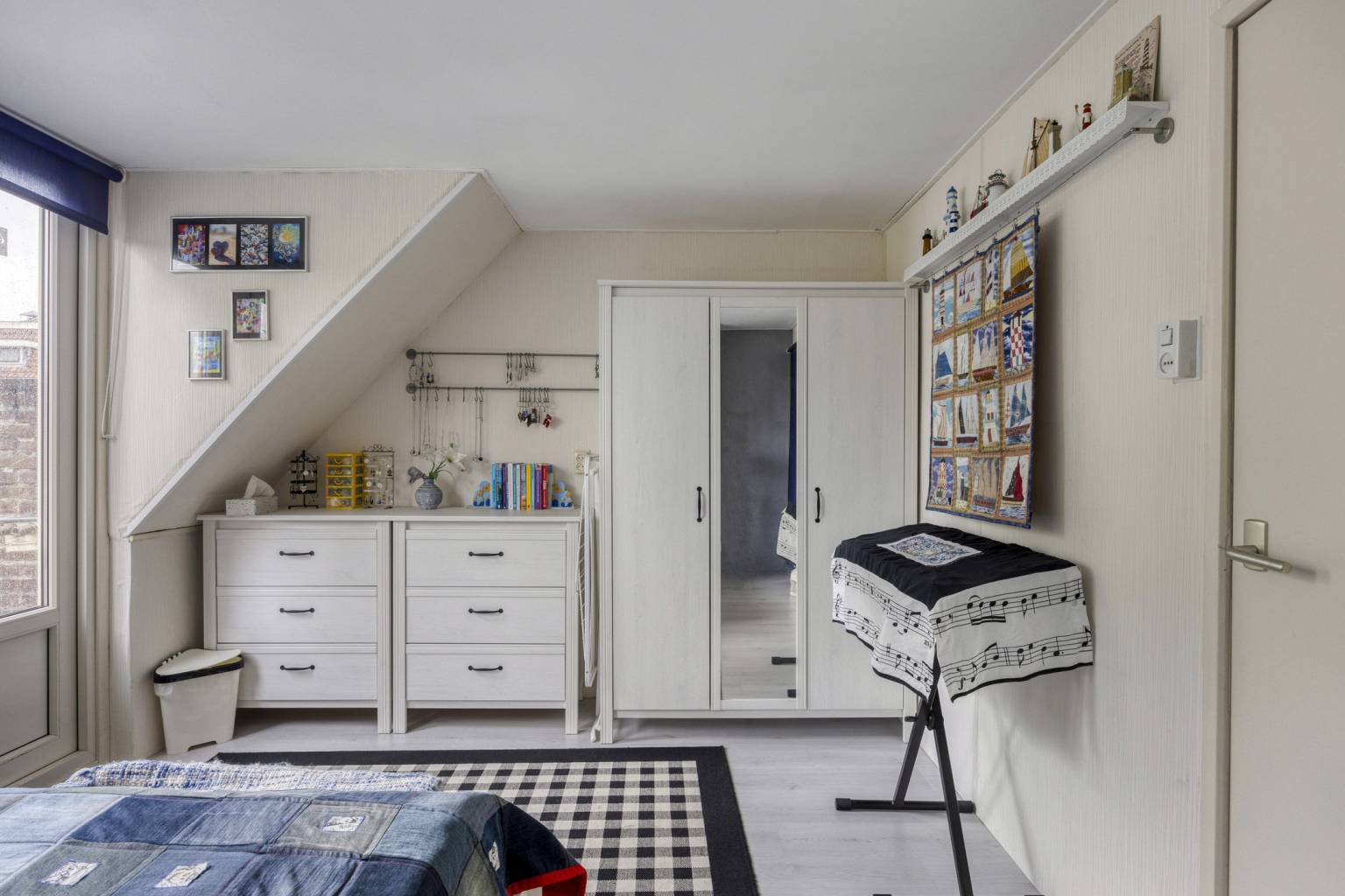 Op de eerste verdieping vind je twee slaapkamers. De grootste kamer, aan de achterzijde, heeft een deur naar het dakterras en biedt genoeg ruimte voor een tweepersoonsbed en kastruimte. De kamer aan de voorzijde is eveneens volwaardig en ideaal als kinder- of werkkamer. De kamers zijn licht en praktisch ingedeeld, en beiden voorzien van een inbouwkast.