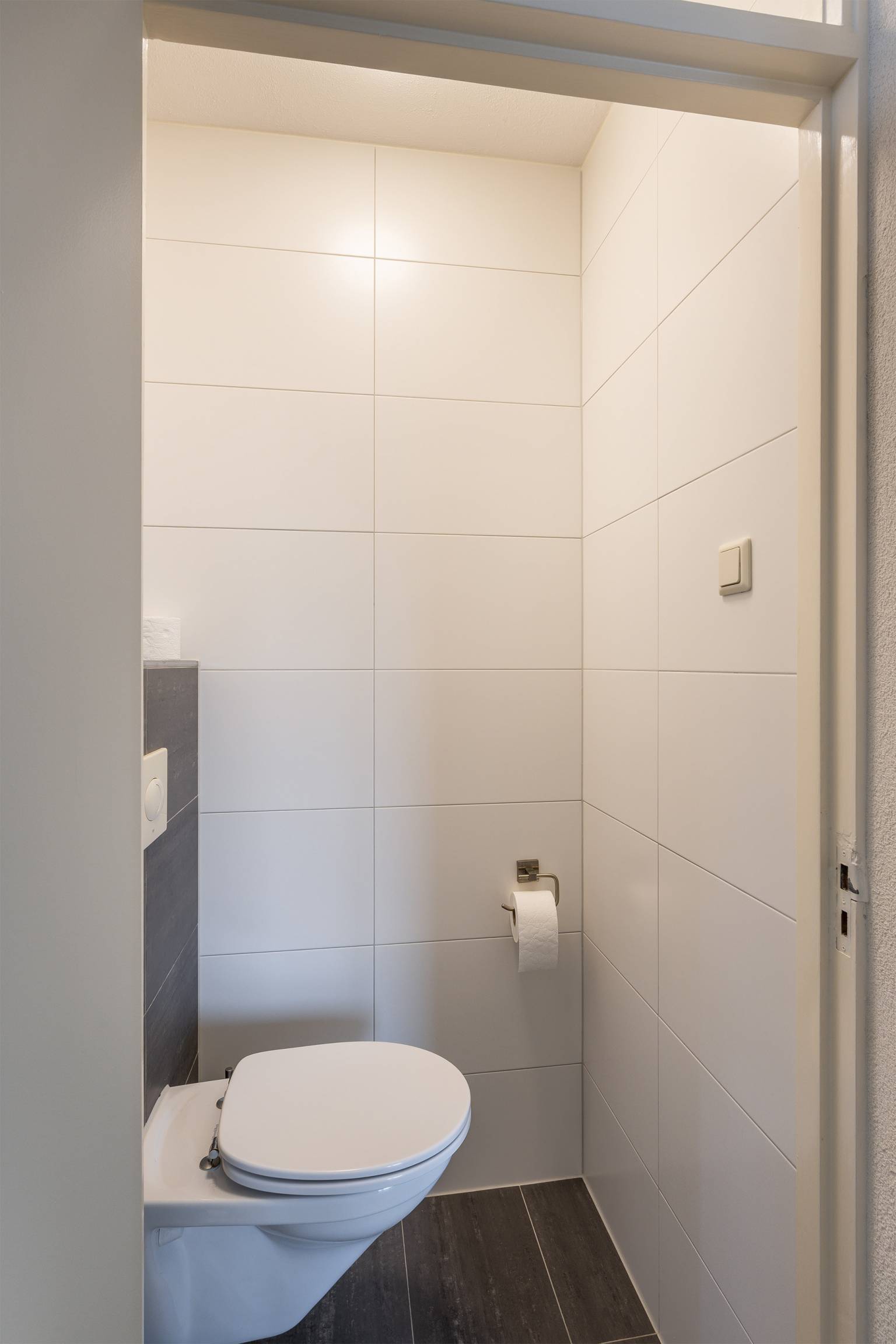 Binnenkomst in de entreehal die achter de voordeur is voorzien van een schoonloopmat. De wanden zijn afgewerkt met spachtelputz en de houten vloer is drempelloos doorgetrokken naar de woonkamer met open keuken en de tweede slaapkamer. Het plafond is voorzien van inbouw spots en vanuit de hal is er toegang tot de meterkast, een vaste kast met daarin de wasmachine aansluiting en de opstelling van de Cv-ketel, de woonkamer en het volledig betegelde toilet.