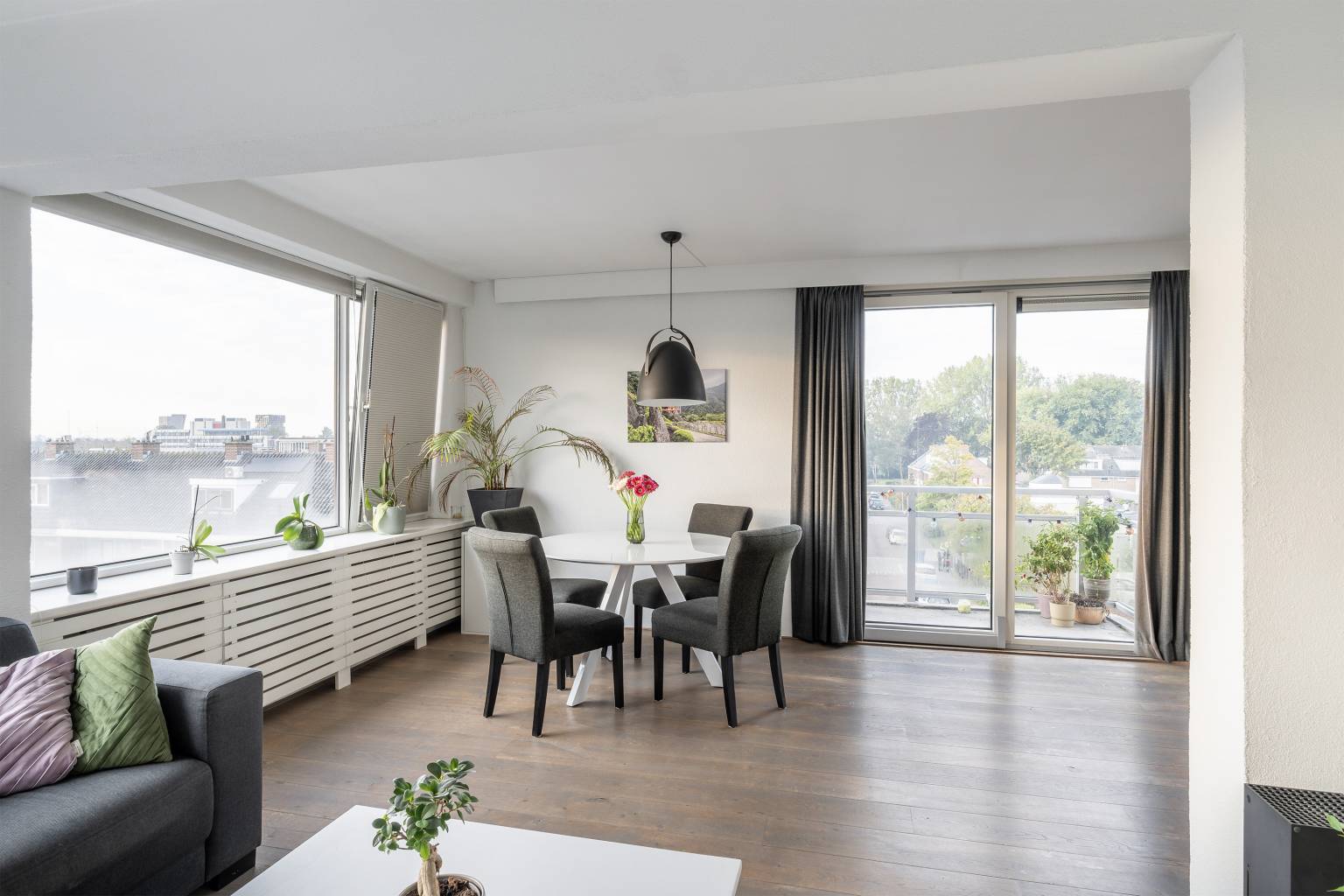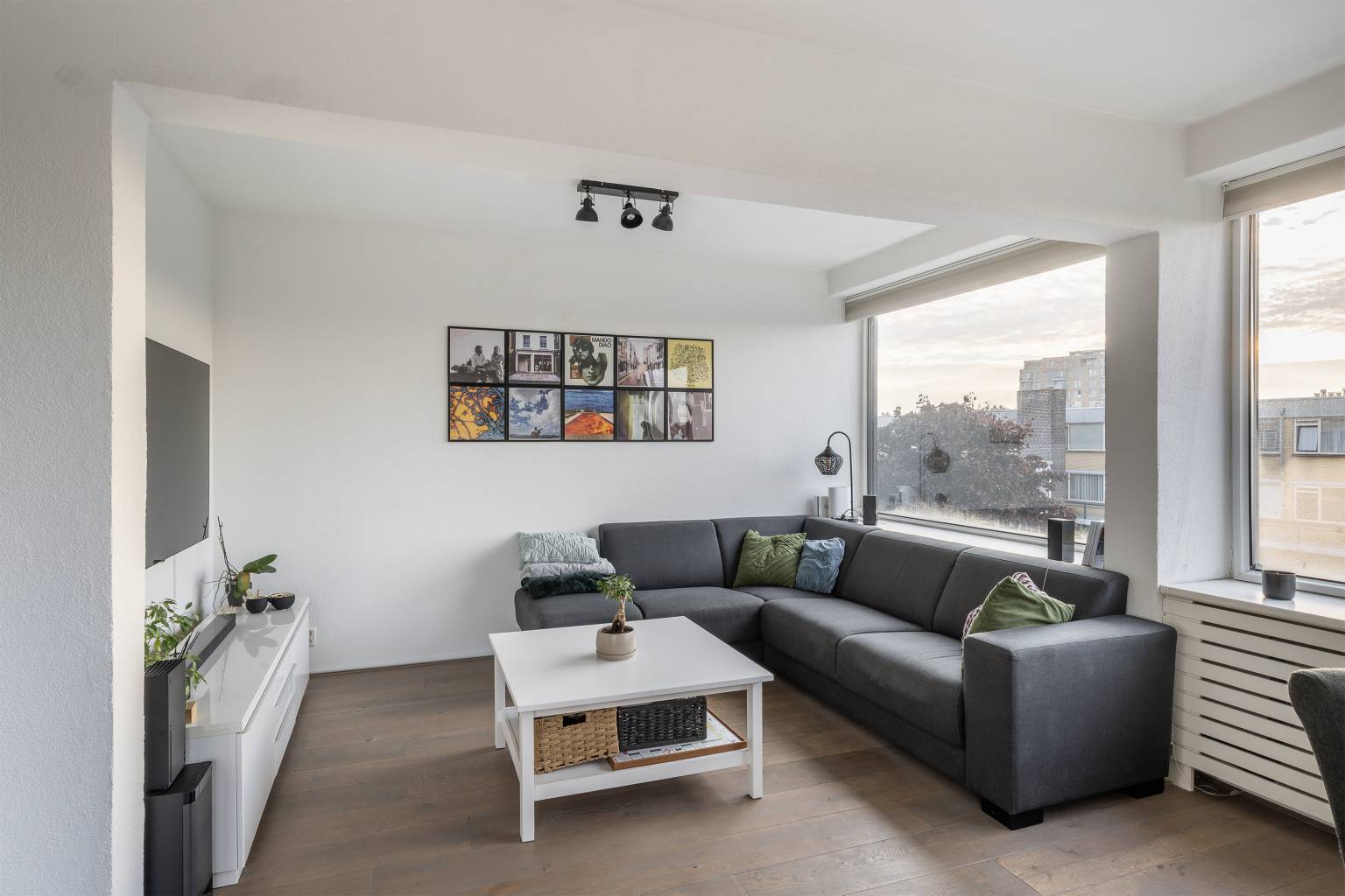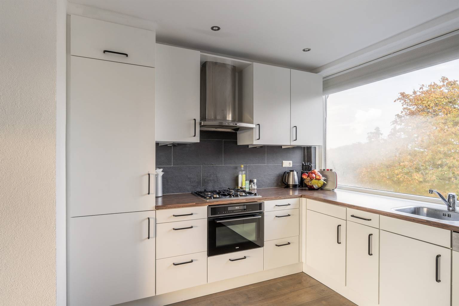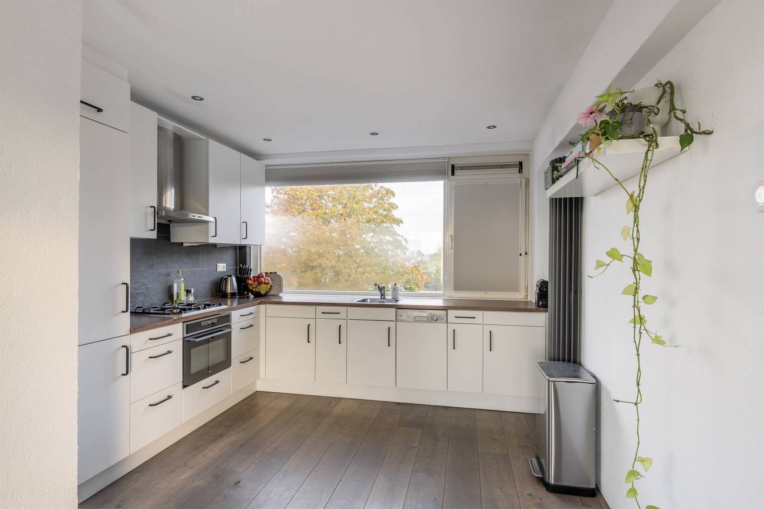 De woonkamer is een doorgebroken ruimte. Voorheen bestond deze uit twee kamers en indien wenselijk is dit terug te brengen in de originele staat. Doordat de ruimte is vergroot is er plaats voor een zit- en een eethoek. Er is een grote schuifpui (2024) naar het balkon, de radiatoren zijn netjes weggewerkt achter een ombouw en de wanden zijn afgewerkt met spachtelputz. In het verlengde is er toegang er open toegang tot de keuken die is opgesteld in een L-vorm. Deze is uitgevoerd in een lichte teint en is voorzien van bovenkasten met verlichting. De achterwand is netjes betegeld en er is diverse apparatuur aanwezig, zoals een koel-/vriescombinatie, een combi oven (2022), een vaatwasser, een 4-pits gaskookplaat en een afzuigkap. Het plafond is voorzien van inbouw spots en er hangt een designradiator.