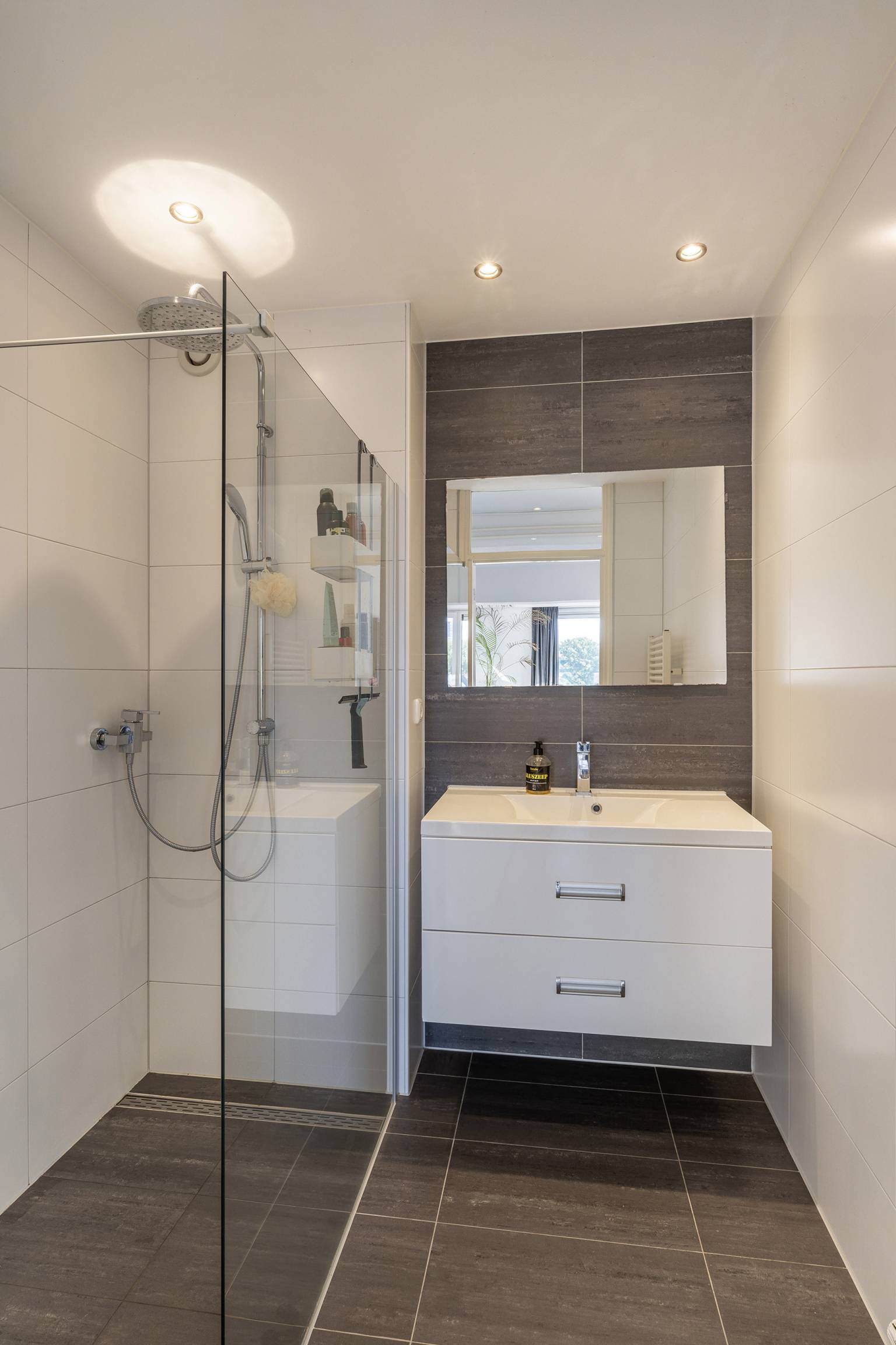De volledig betegelde badkamer is uitgerust met een inloopdouche, een wastafelmeubel met daarboven een spiegel en een handdoeken radiator.