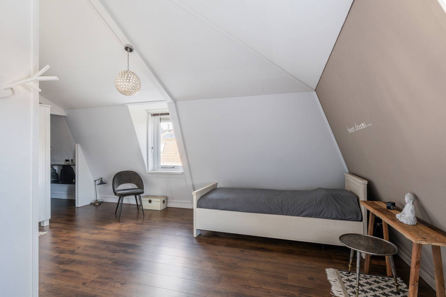 Boven vindt u twee ruime slaapkamers en een complete badkamer. De tweede verdieping biedt nog een royale derde (voorheen 2 slaapkamers) slaapkamer en inloopkast dankzij twee dakkapellen.