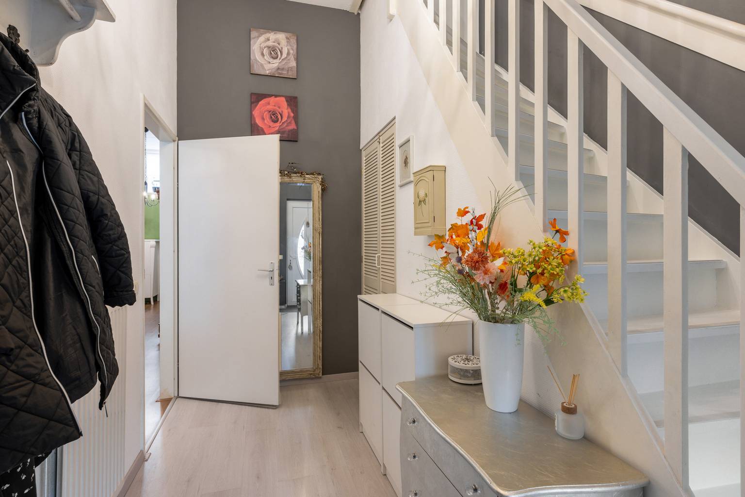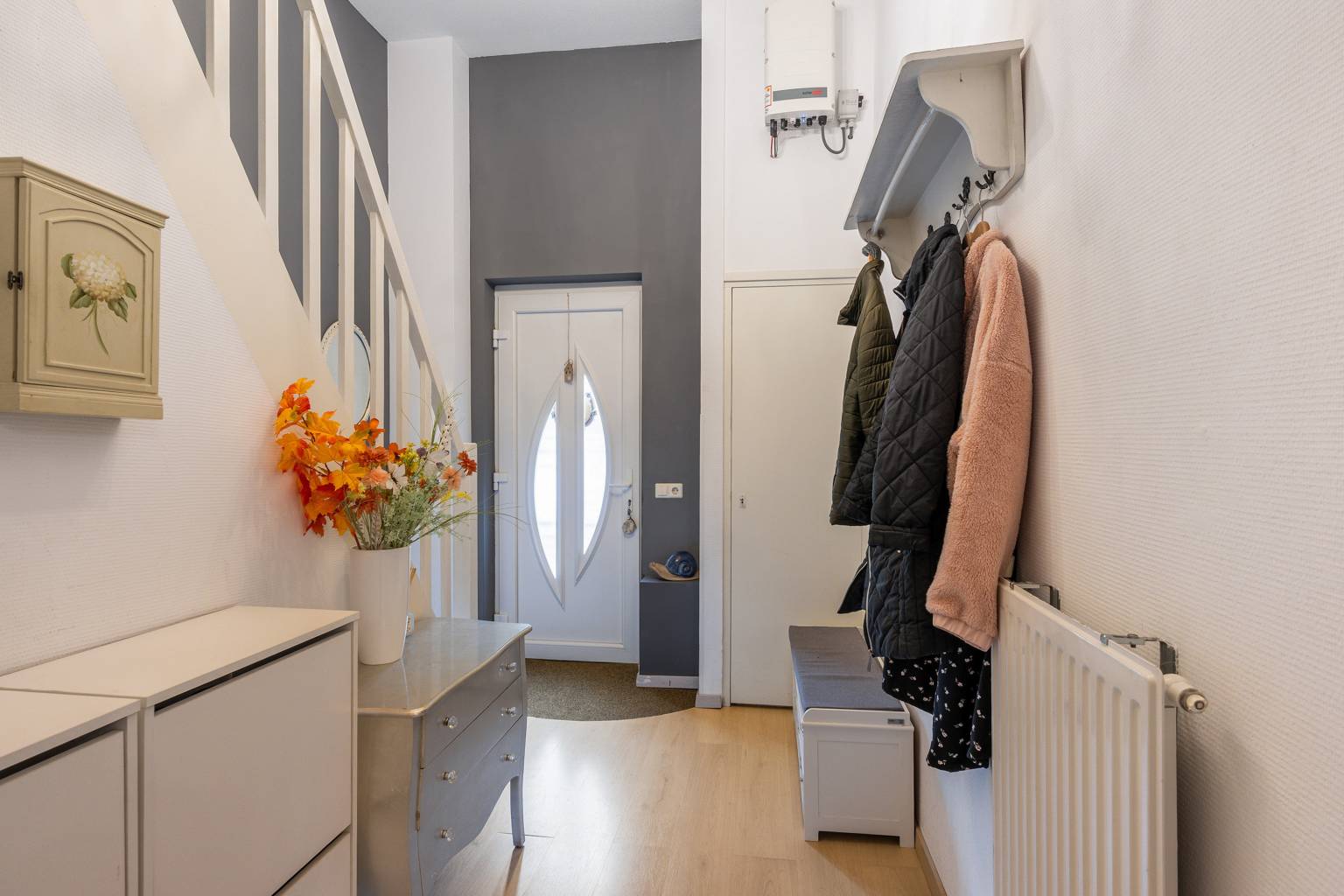 De voordeur is direct vanaf de straat bereikbaar en geeft toegang tot de entreehal die is voorzien van de meterkast, een trapkast en de trap naar de verdieping. Vanuit de hal is er een deur naar de woonkamer en op de vloer in de hal ligt laminaat en de wanden zijn afgewerkt met glasweefselbehang.