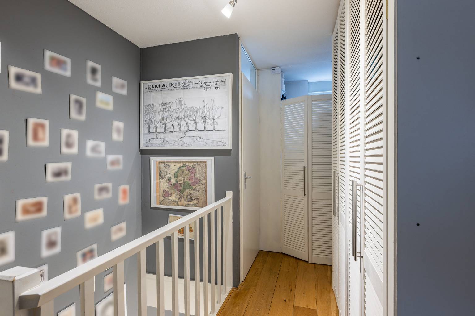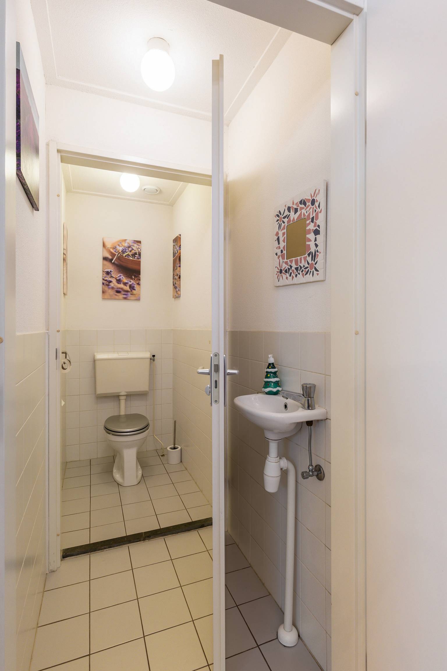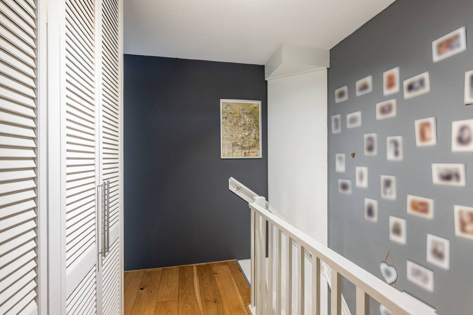 Na de trapopgang is de overloop bereikbaar. Hier bevindt zich een grote vaste kast en aparte ruimte, die is gescheiden doormiddel van een louvredeur, met daarin de aansluiting voor de wasmachine en de opstelling van de Cv-ketel. Daarnaast is er vanaf de overloop toegang tot de woonkamer het gedeeltelijk betegelde toilet.
