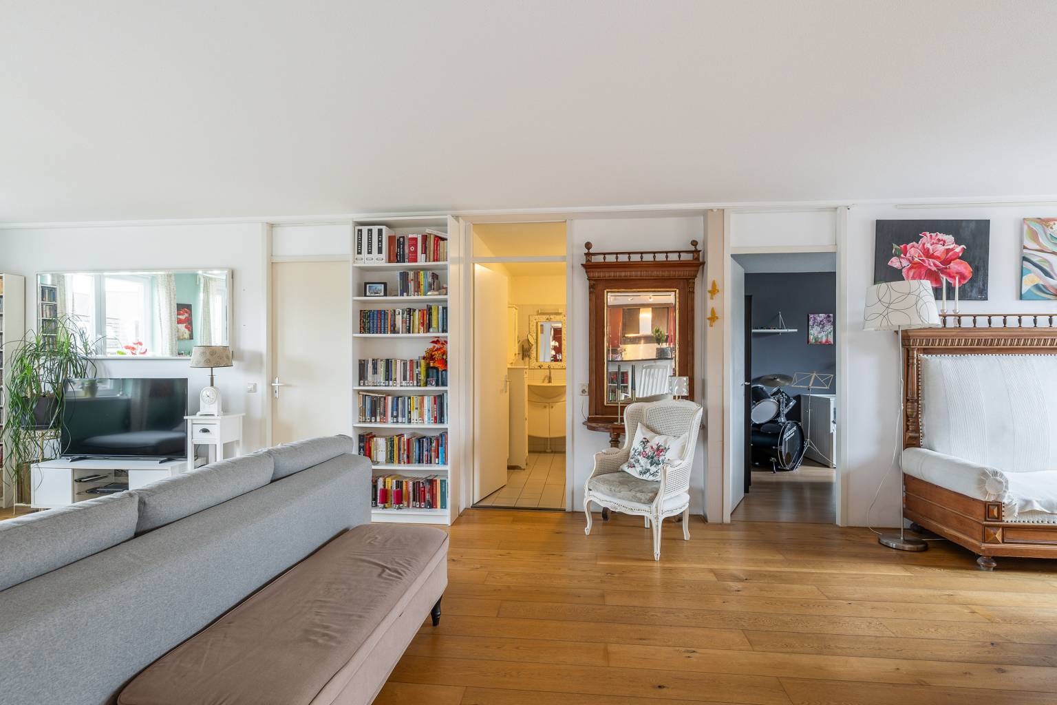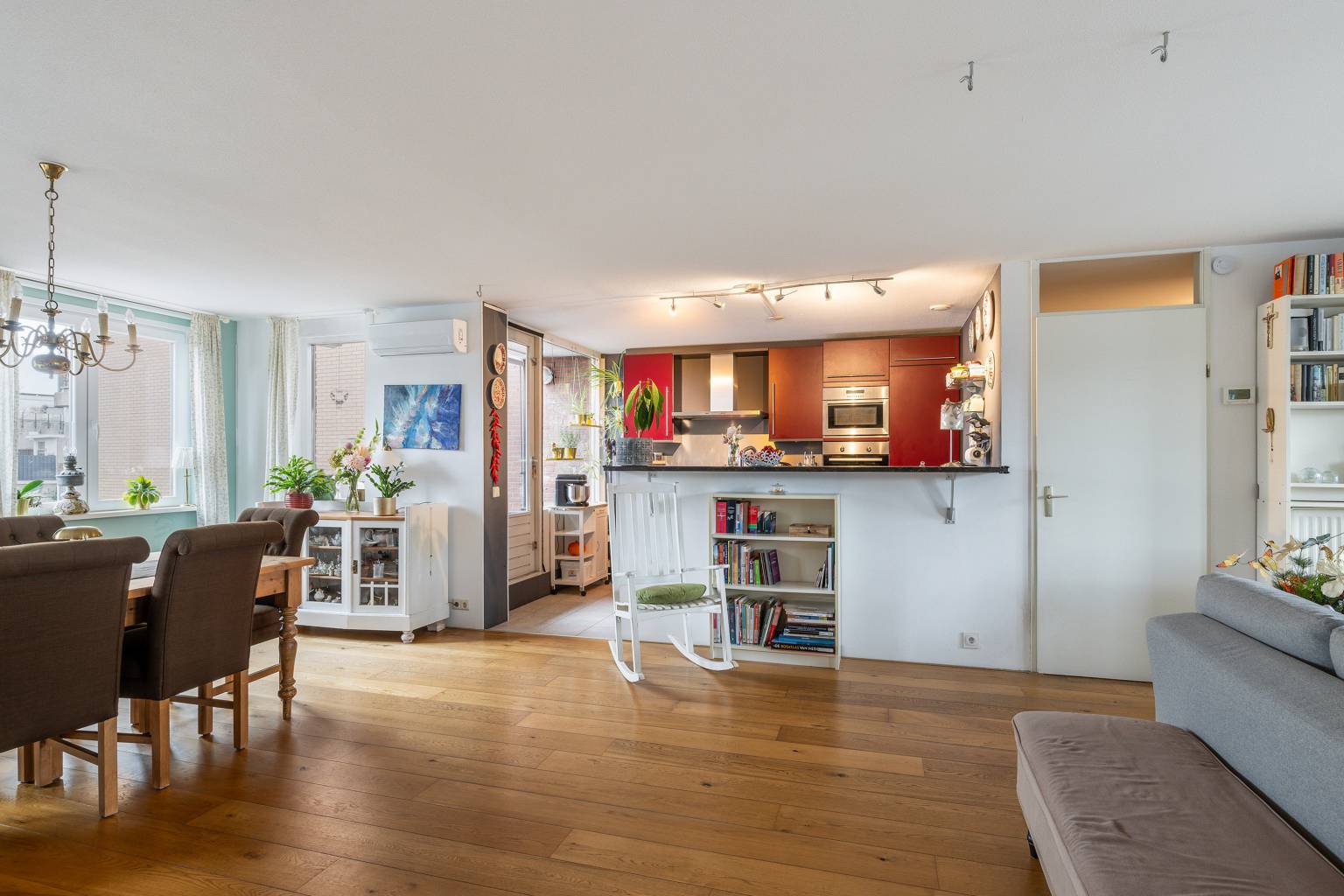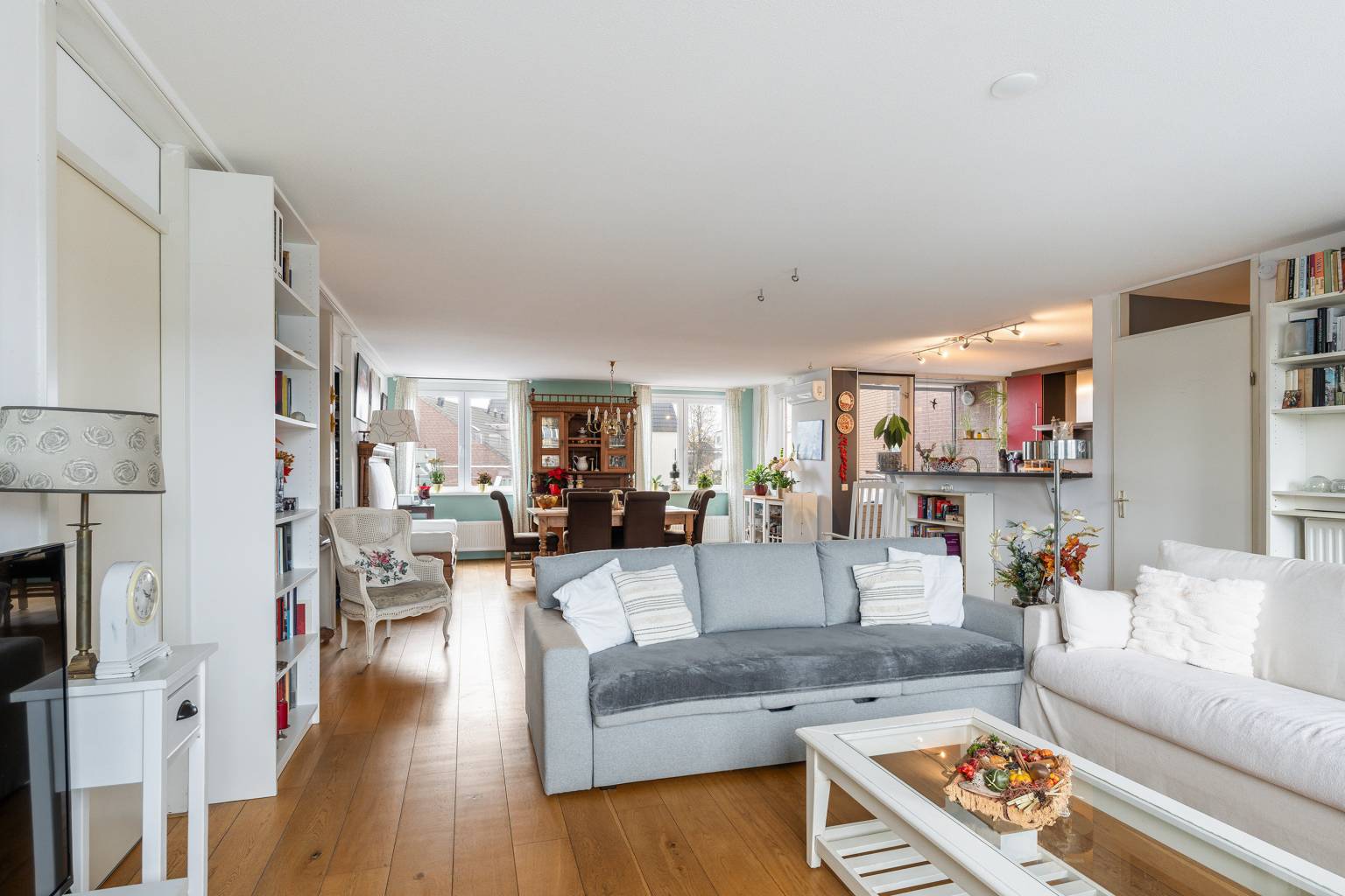 De ruime woonkamer loopt geheel van de voorzijde naar de achterzijde en biedt daardoor voldoende ruimte voor een zithoek en een eethoek. Er komt veel daglicht binnen dankzij de ramen aan weerszijden en er hangt een airco die kan koelen en verwarmen. Op de vloer ligt parket en de wanden zijn deels behangen en deels gestuukt. Vanuit de woonkamer is er een open verbinding met de keuken en er is toegang tot twee slaapkamers en de badkamer.