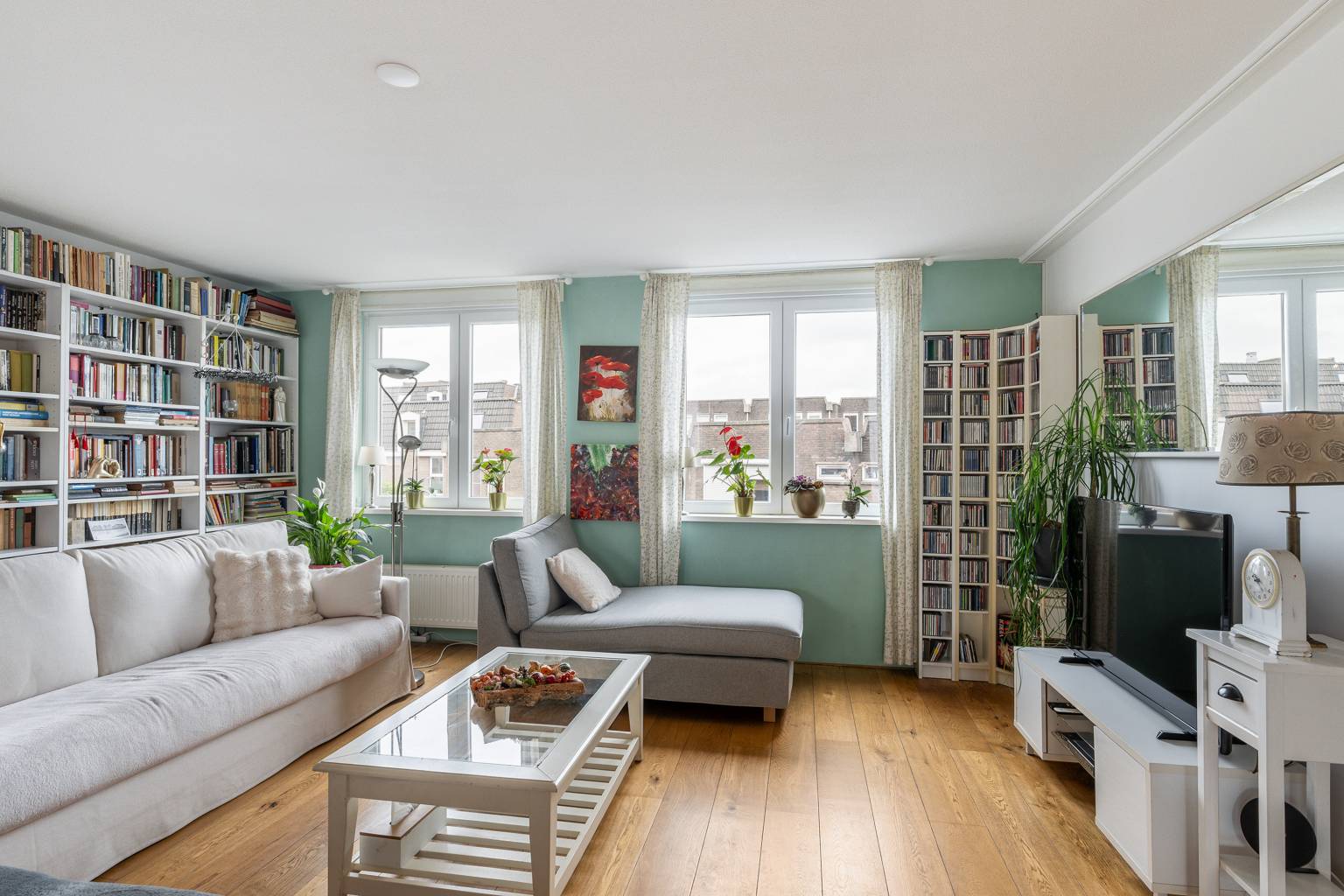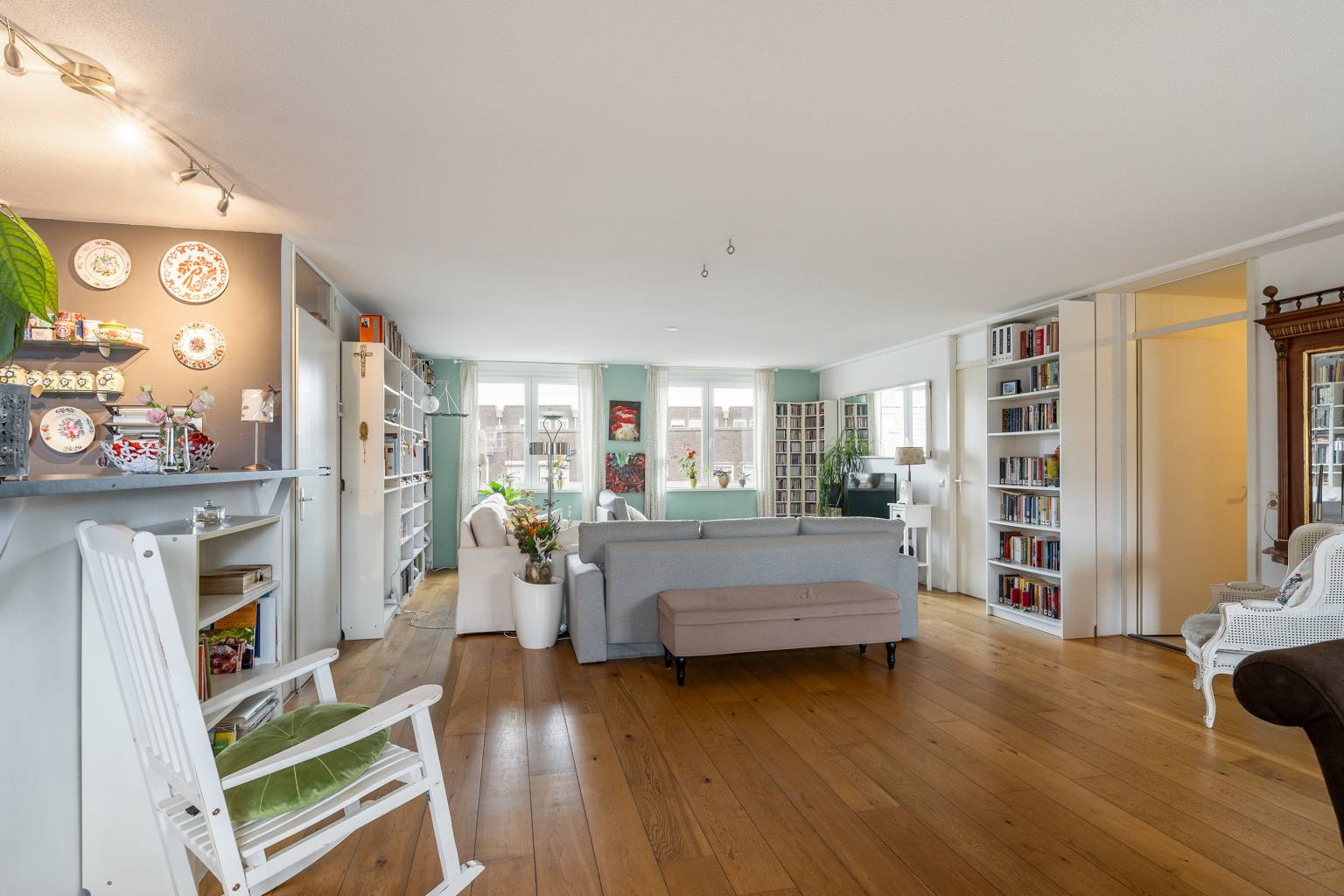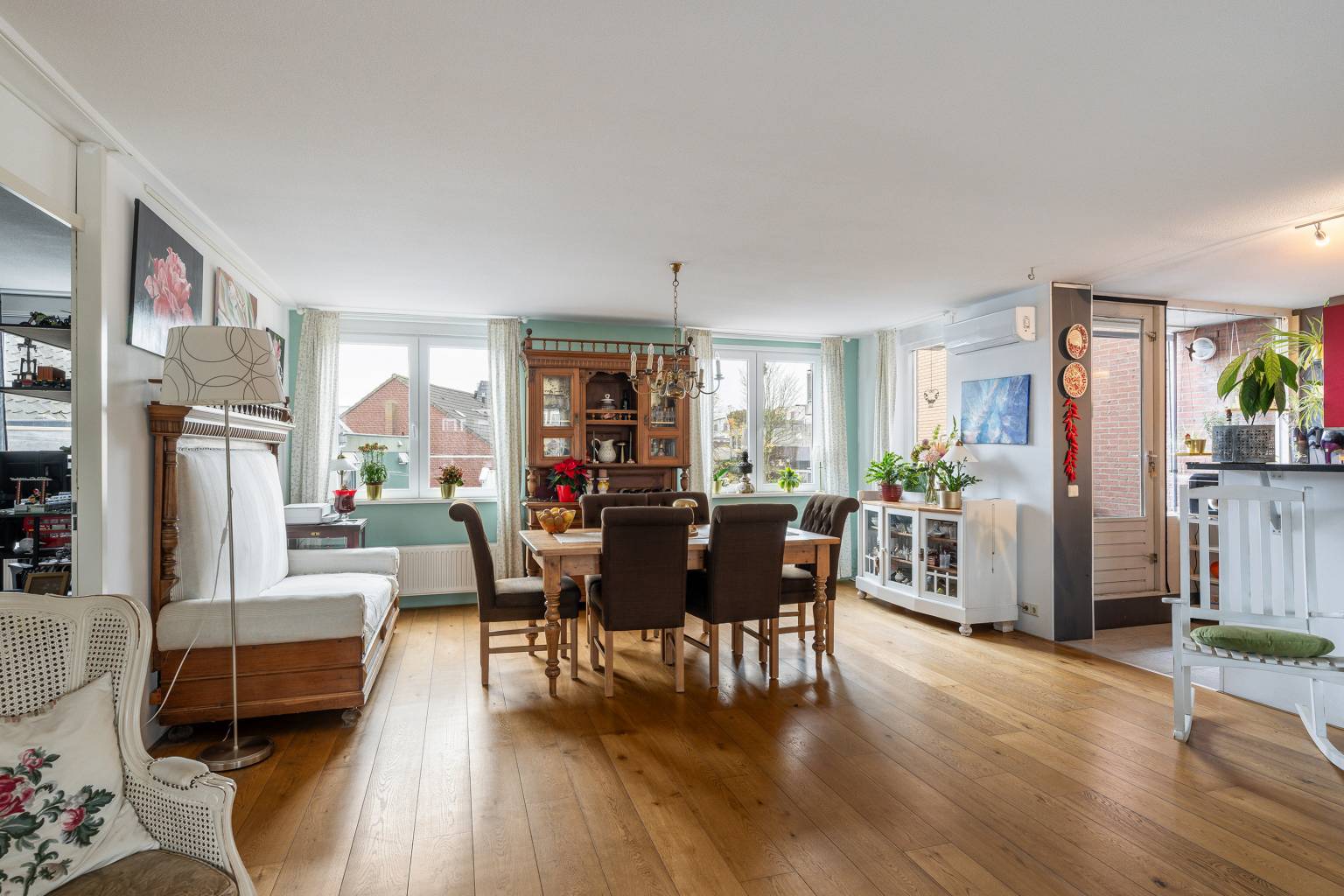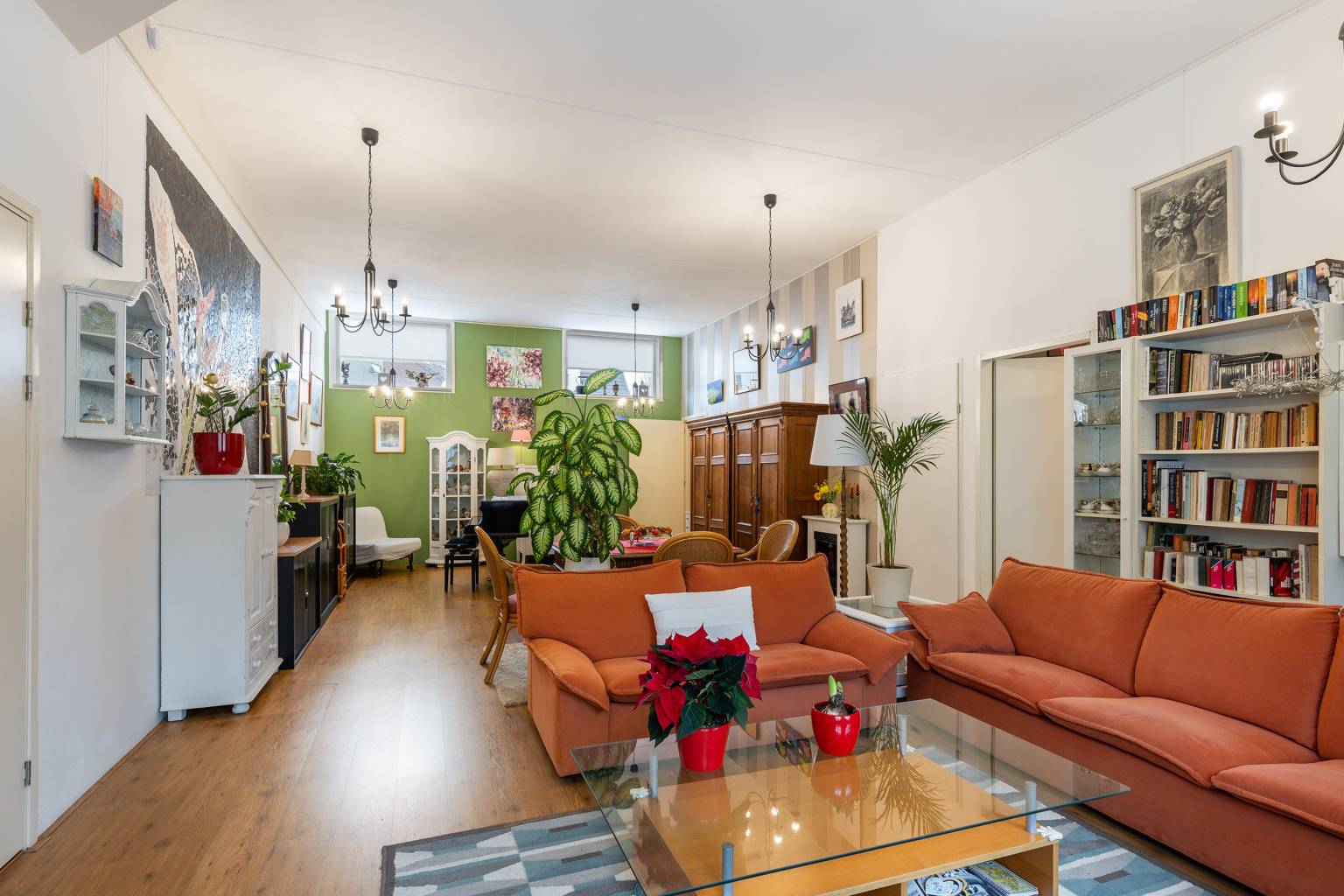 De ruime woonkamer loopt geheel van de voorzijde naar de achterzijde en biedt daardoor voldoende ruimte voor een zithoek en een eethoek. Er komt veel daglicht binnen dankzij de ramen aan weerszijden en er hangt een airco die kan koelen en verwarmen. Op de vloer ligt parket en de wanden zijn deels behangen en deels gestuukt. Vanuit de woonkamer is er een open verbinding met de keuken en er is toegang tot twee slaapkamers en de badkamer.