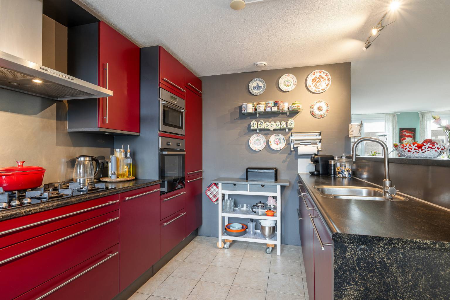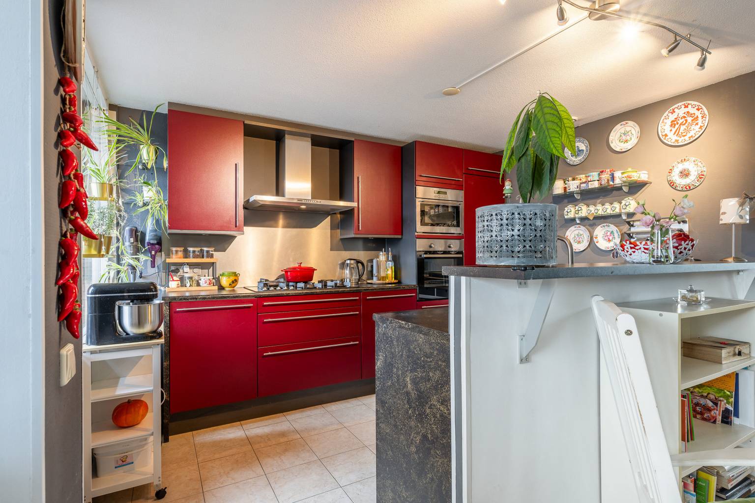 De keuken is doormiddel van een bar gescheiden van de woonkamer en beschikt aan weerszijde over een recht keukenblok. Naast bovenkasten is er ook diverse apparatuur aanwezig, zoals een magnetron, een oven, een vaatwasser (2023), een koel-/vriescombinatie, een gaskookplaat en een afzuigkap. De vloer is hier betegeld en er is een deur naar het balkon.
